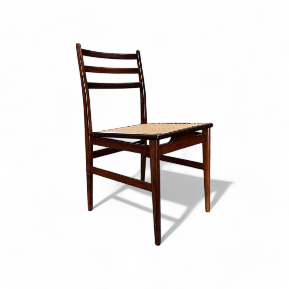 This gorgeous chair features a delicate rosewood (jacaranda) structure with caning in the seat, combining lightweight construction with exceptional sturdiness and durability. Their Brazilian modern style makes them a versatile addition that would enhance the aesthetic of any home decor, adding a touch of elegance and sophistication. The wood has been refinished and the caning is new.