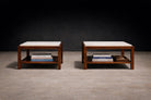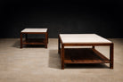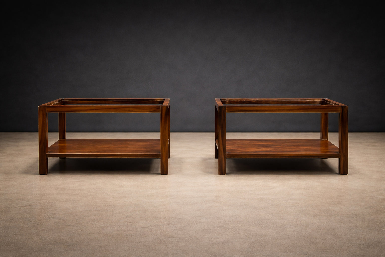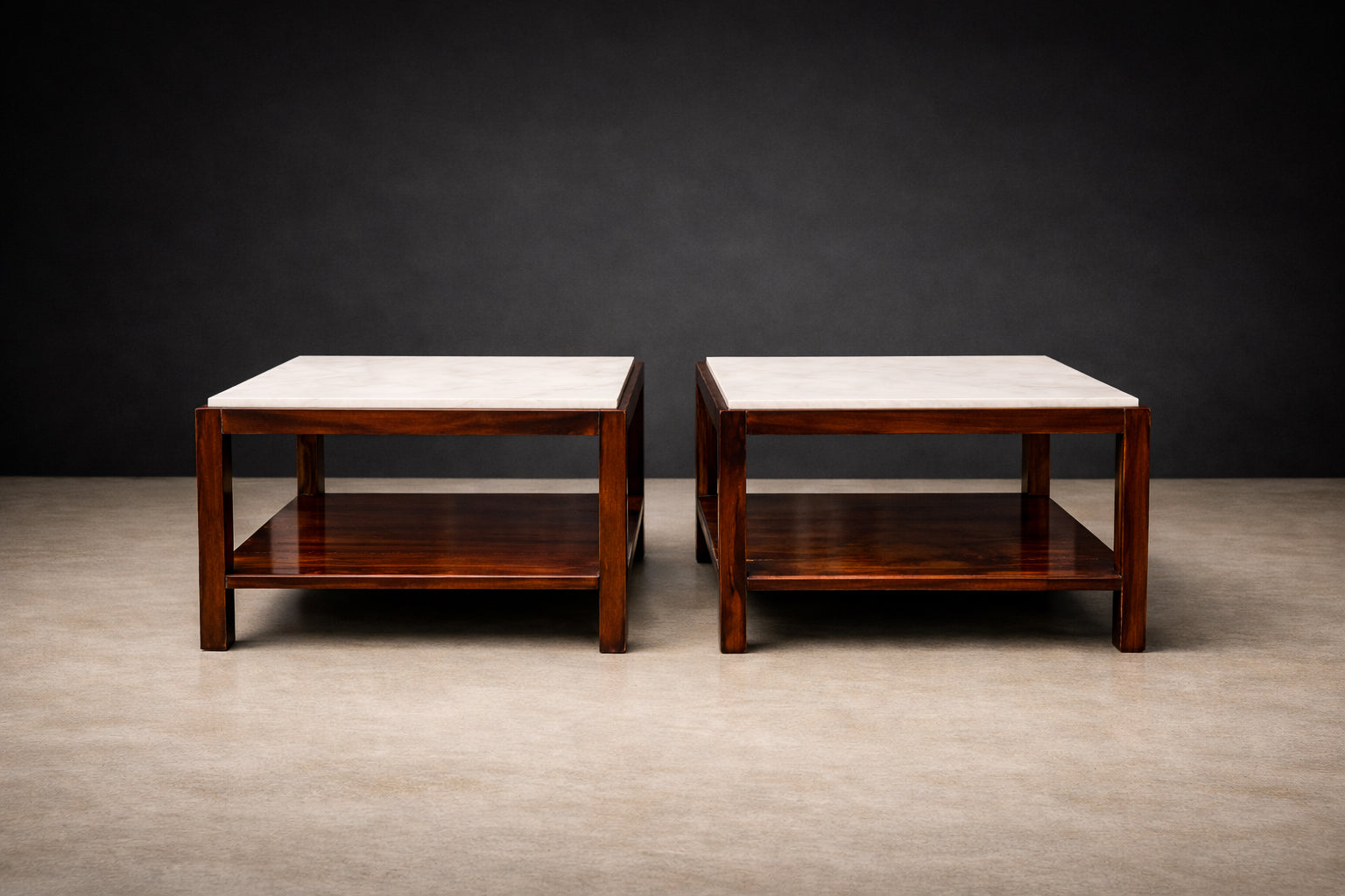 A refined and architecturally grounded pair of side tables designed by Sergio Rodrigues, one of the most important figures in Brazilian modern design. Executed in richly grained Brazilian rosewood (jacarandá / caviúna) and topped with elegant white marble slabs, these tables embody the material intelligence and structural clarity that define Rodrigues’ work from the 1960s.