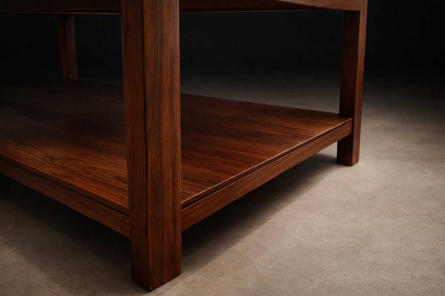 The design is deceptively simple yet highly resolved. A rectilinear rosewood frame supports a floating marble top, while a lower shelf—beautifully finished in the same dense tropical hardwood—adds both visual weight and practical storage. The proportions are disciplined and architectural, reflecting Rodrigues’ ability to balance robust Brazilian craftsmanship with modernist restraint.