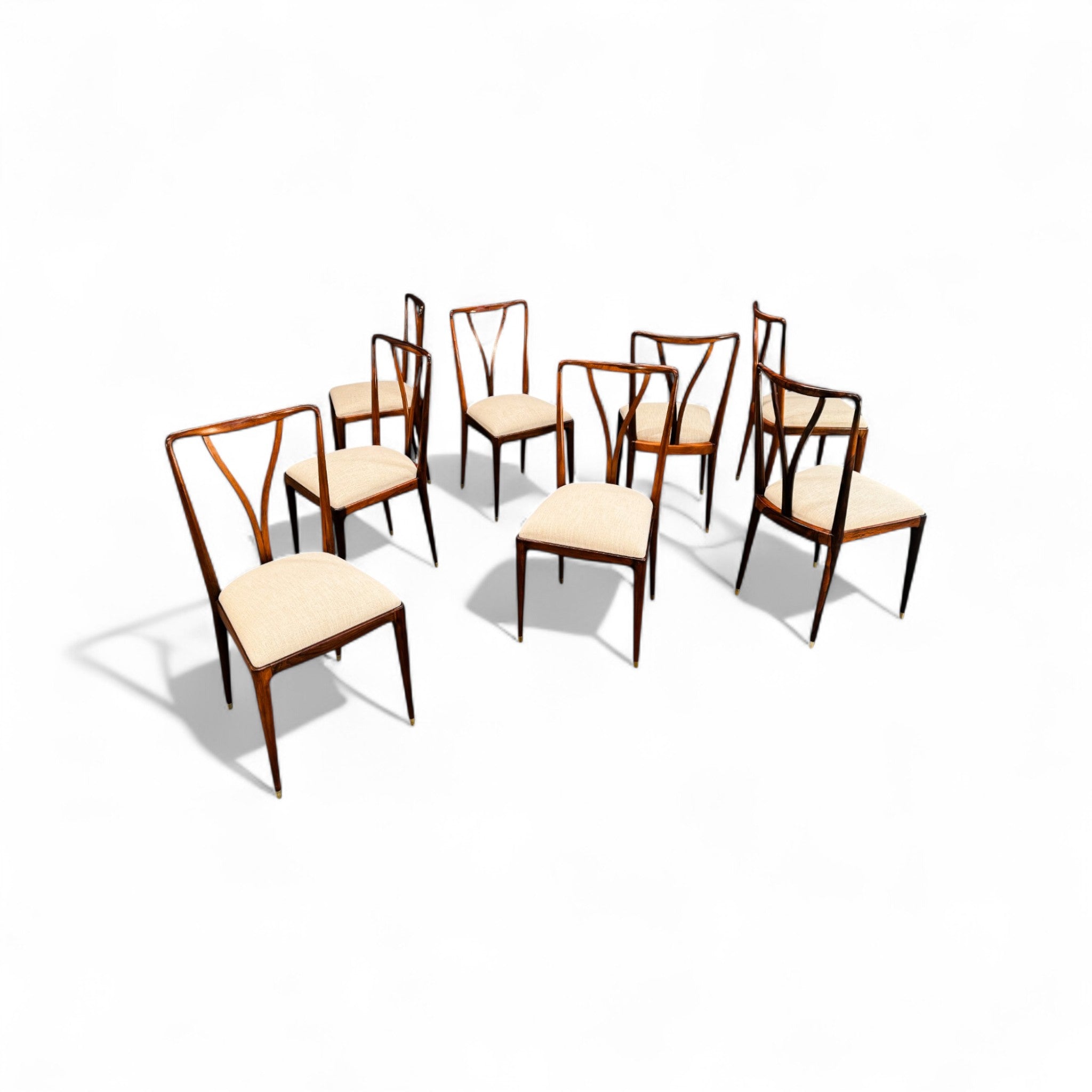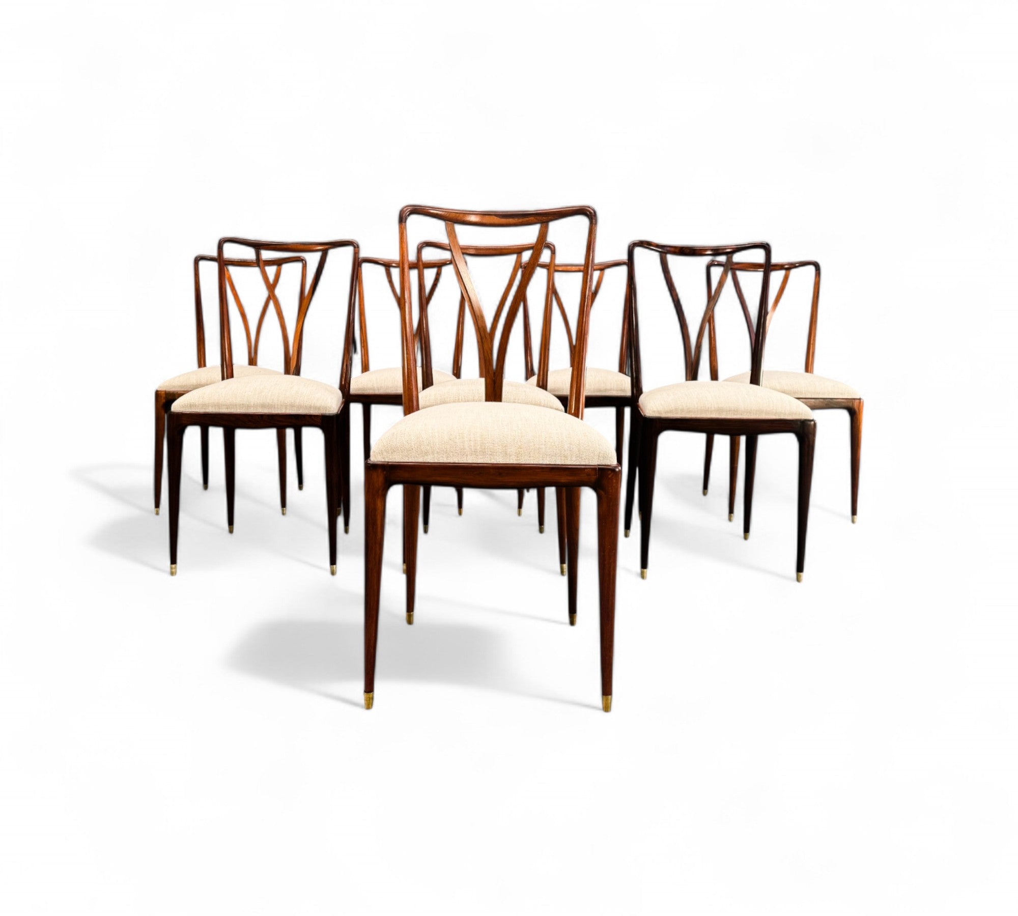 Introducing a beautifully sculptural and elegant set of eight dining chairs crafted from the finest rosewood. Each chair features a tall, intricately shaped backrest, along with a well-proportioned seat and four sturdy legs. The rosewood frames have been expertly refinished and are in excellent condition. Originally sourced from a private residence in Brasília, Brazil’s capital, these chairs radiate sophistication and timeless charm. The seats have been reupholstered in a soft, textured linen that complements nicely the elegant shape of each chair.
