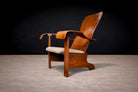Produced by Cimo in Brazil during the 1950s, this armchair exemplifies the manufacturer’s mastery of bentwood construction and its contribution to mid-century Brazilian design. The composition is defined by a tall, gently contoured backrest that rises from a broad, supportive seat, while the arms extend outward in controlled curves—an interplay of structure and fluidity characteristic of the period.