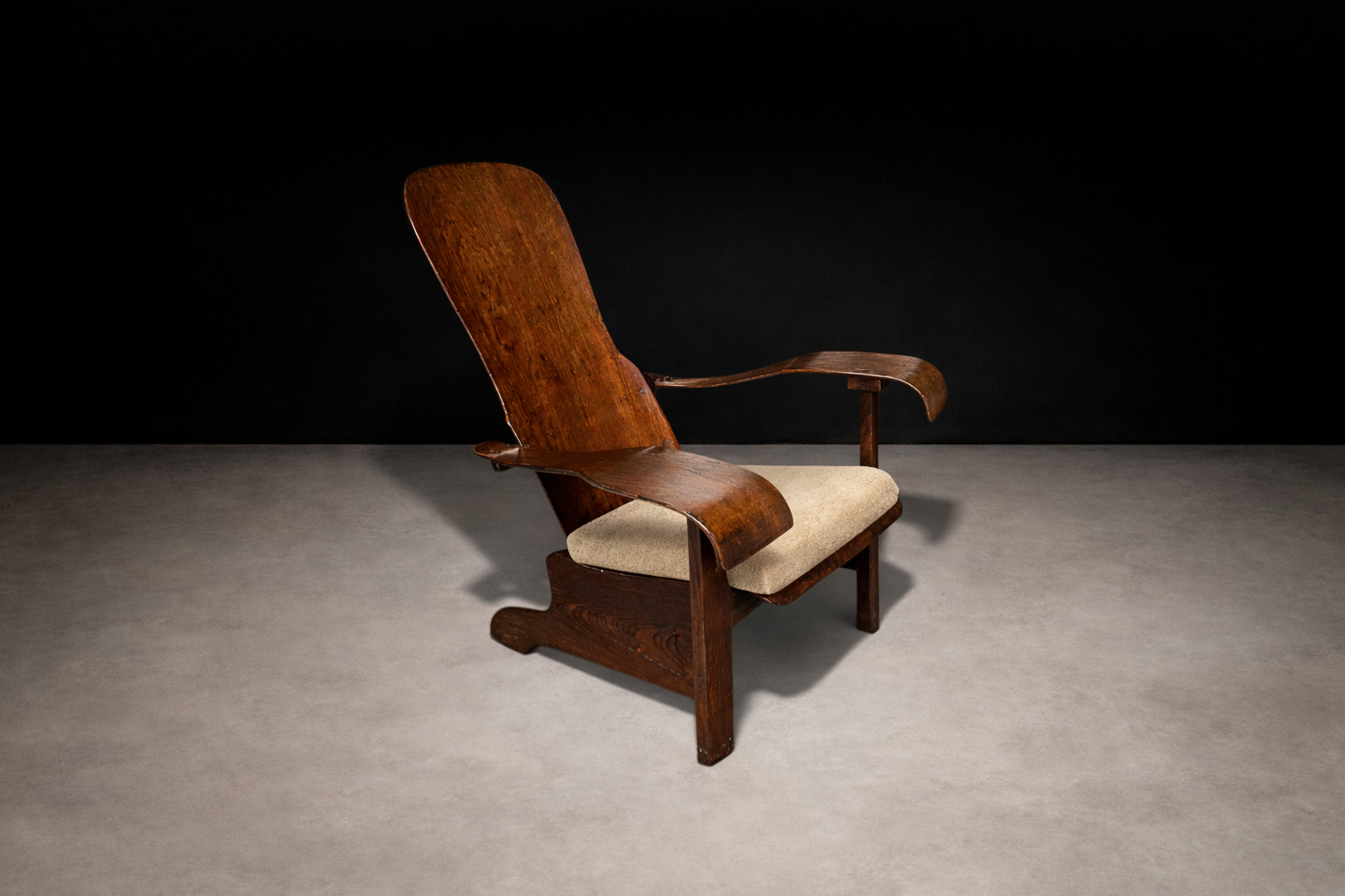 Constructed entirely of bentwood, the chair demonstrates a sophisticated understanding of steam-bent timber as both structural framework and formal language. The visible joinery and continuous planes emphasize material honesty, allowing the natural grain to articulate the surface without superfluous ornament.