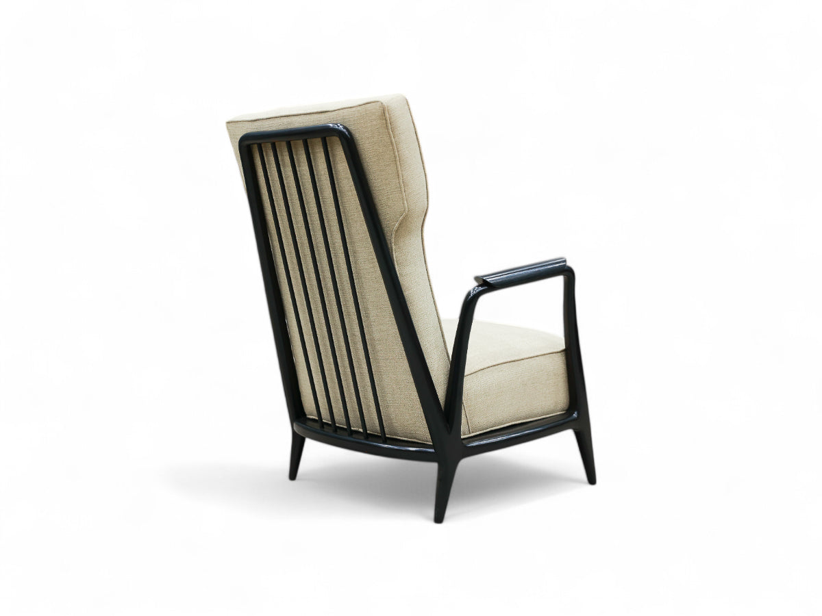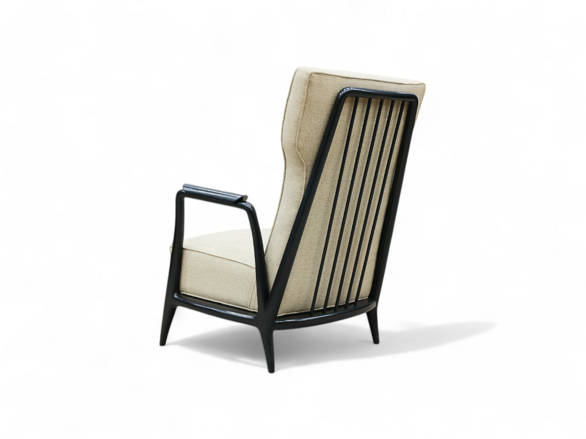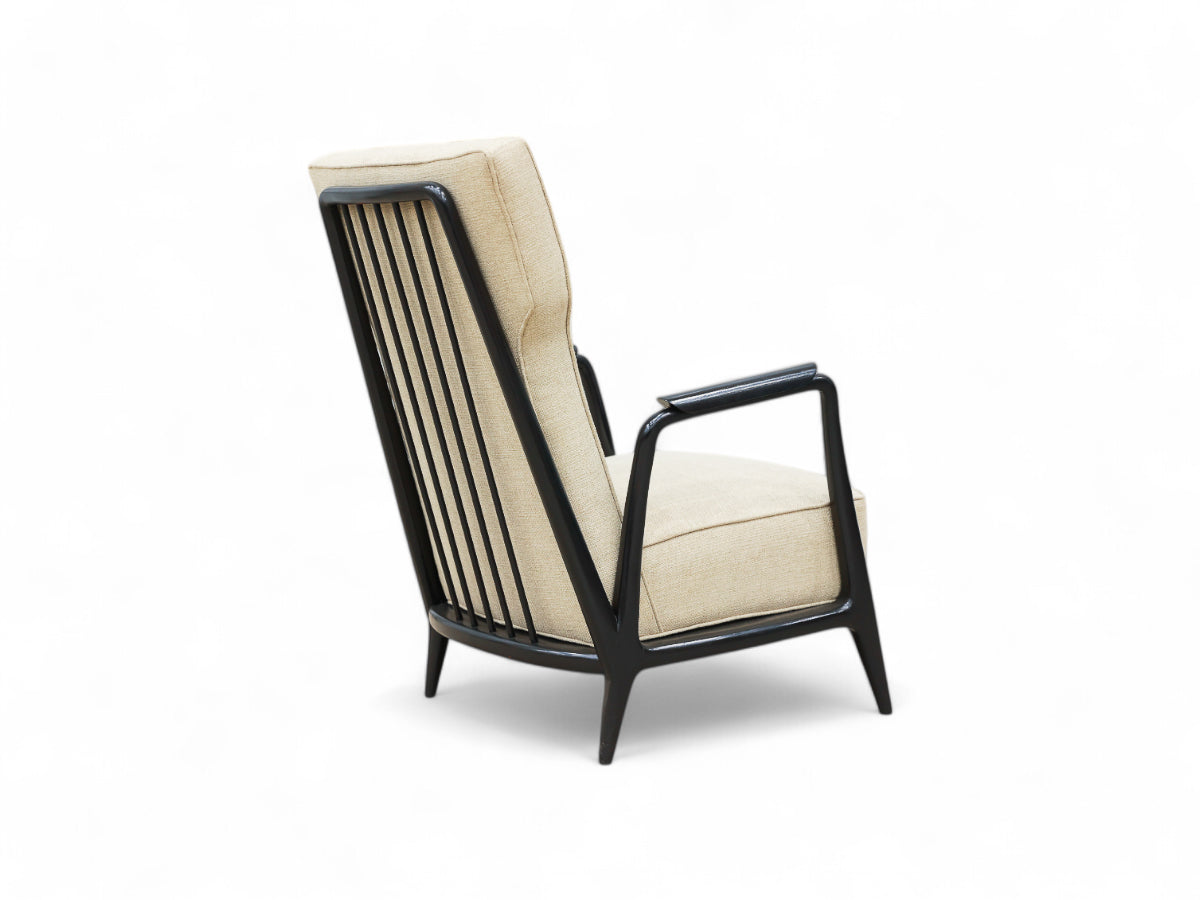 This armchair is made in ivory wood (pau marfim) with an ebony finish and it has been reupholstered with a light gray fabric. The sculpted back has five wood rods. This iconic design has been countlessly photographed, appearing in vintage as contemporary publications. Attached images showcasing this timeless beauty.