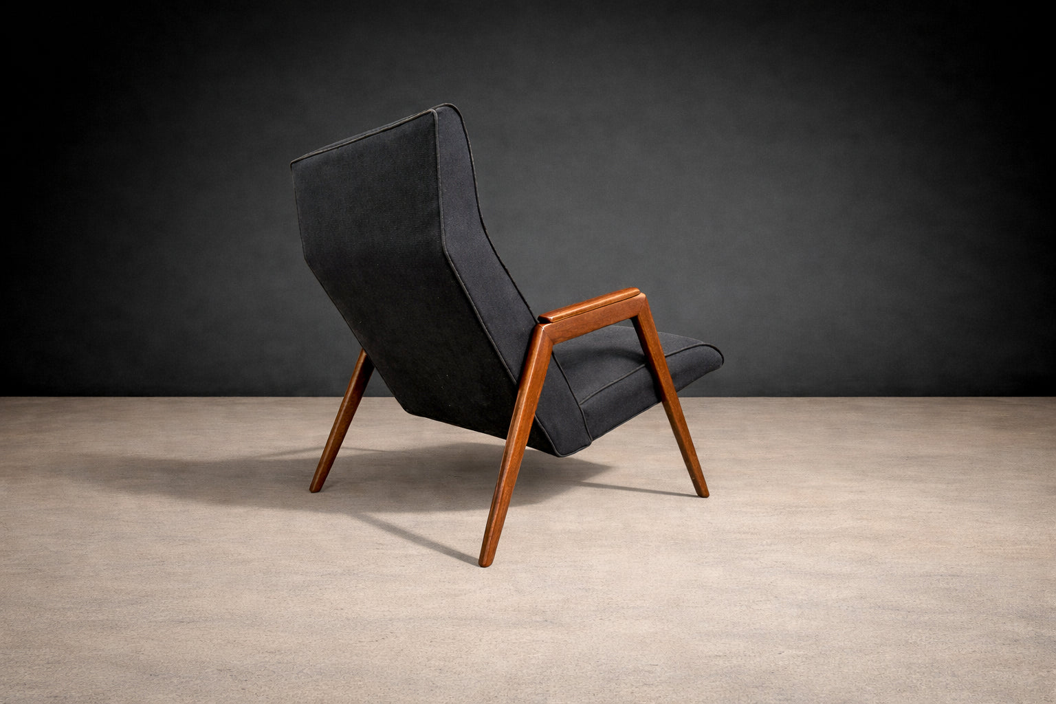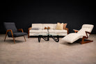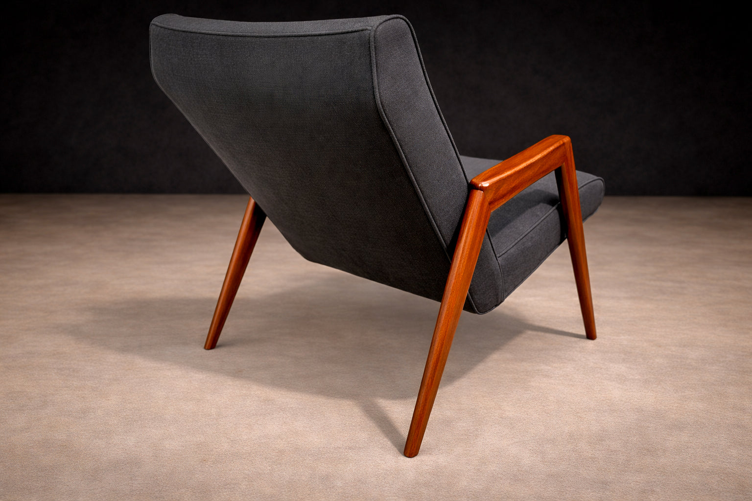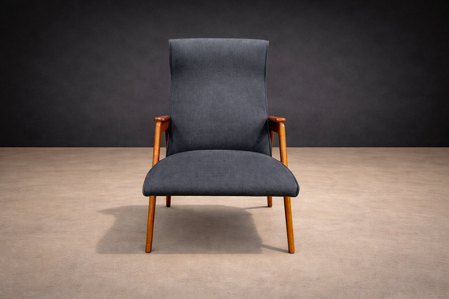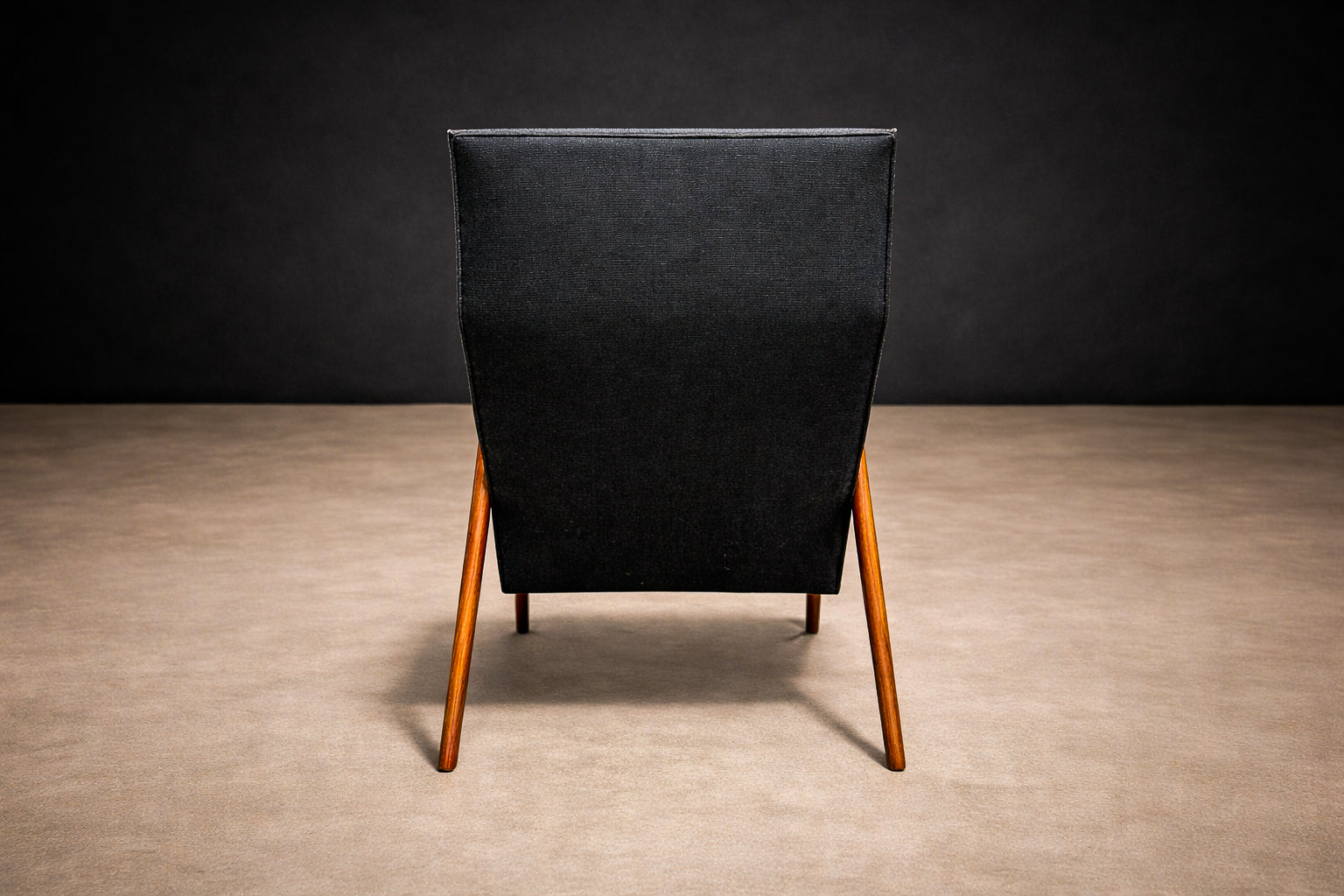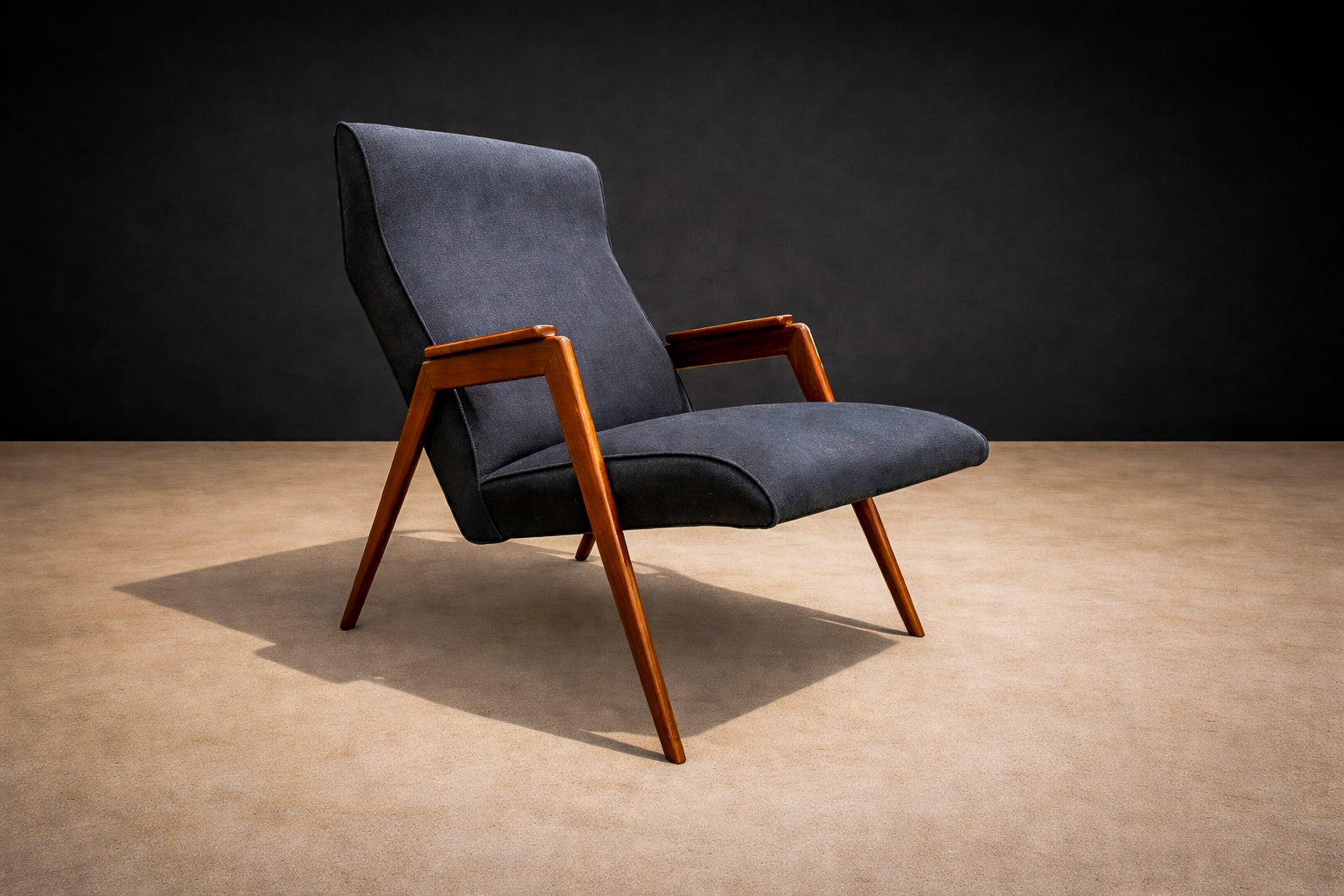 This armchair is a particularly striking example. Its silhouette is sculptural yet airy, defined by sharply angled legs that create Weckx’s signature “spider-like” stance—an aesthetic also explored by contemporaries such as Carlo Hauner and Martin Eisler. The frame is crafted in Pau Marfim, a hardwood prized for its warm tone, durability, and subtle, linear grain. The wood’s natural luminosity contrasts beautifully with the tailored upholstered seat and back, giving the chair both visual presence and comfort.