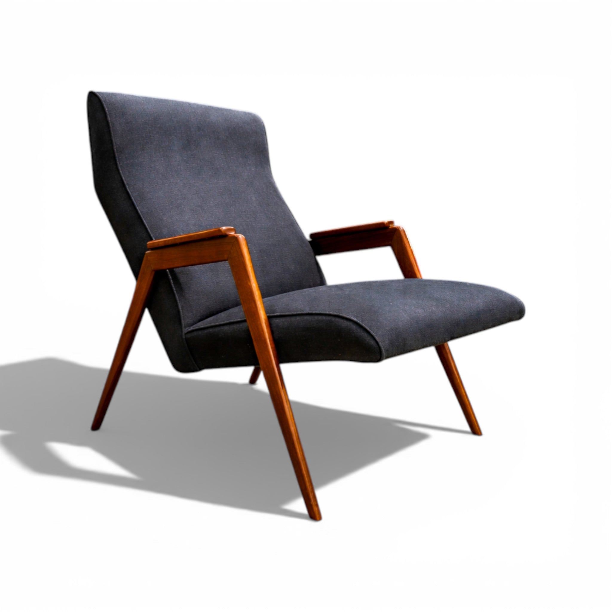This elegant 1950s armchair by Pierre Weckx exemplifies the inventive craftsmanship and modernist clarity that characterized Brazil’s design renaissance in the mid-century period. Weckx—active in São Paulo during the 1950s and 60s—is known for his architectural approach to furniture, where structure becomes an expressive element of the design. His work often features bold geometric lines, lightness of form, and a distinctly Brazilian use of tropical hardwoods.