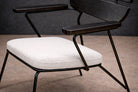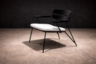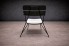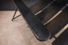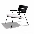 The chair is articulated through a disciplined interplay of line and plane. A black metal frame establishes a precise architectural armature, its slender geometry anchoring the composition while allowing the wooden elements to appear suspended within it. The seat, armrests, and backrest—executed in ebonized solid hardwood—form a continuous visual volume, defined by measured proportions and subtle curvature. The contrast between darkened timber and matte black steel distills the designers’ interest in structural legibility: each component reads clearly, with no superfluous gesture.