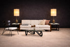 Function is absorbed seamlessly into the design. The generous seat depth and supportive backrest create a posture of ease, while the broad wooden armrests extend the horizontal lines of the composition. Comfort is achieved not through upholstery, but through proportion, angle, and the inherent warmth of the material.