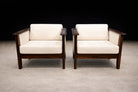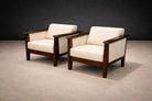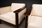 The pair presents in excellent vintage condition. The wood has been carefully restored, and the upholstery is new, offering a fresh yet authentic presentation consistent with the original design intent.