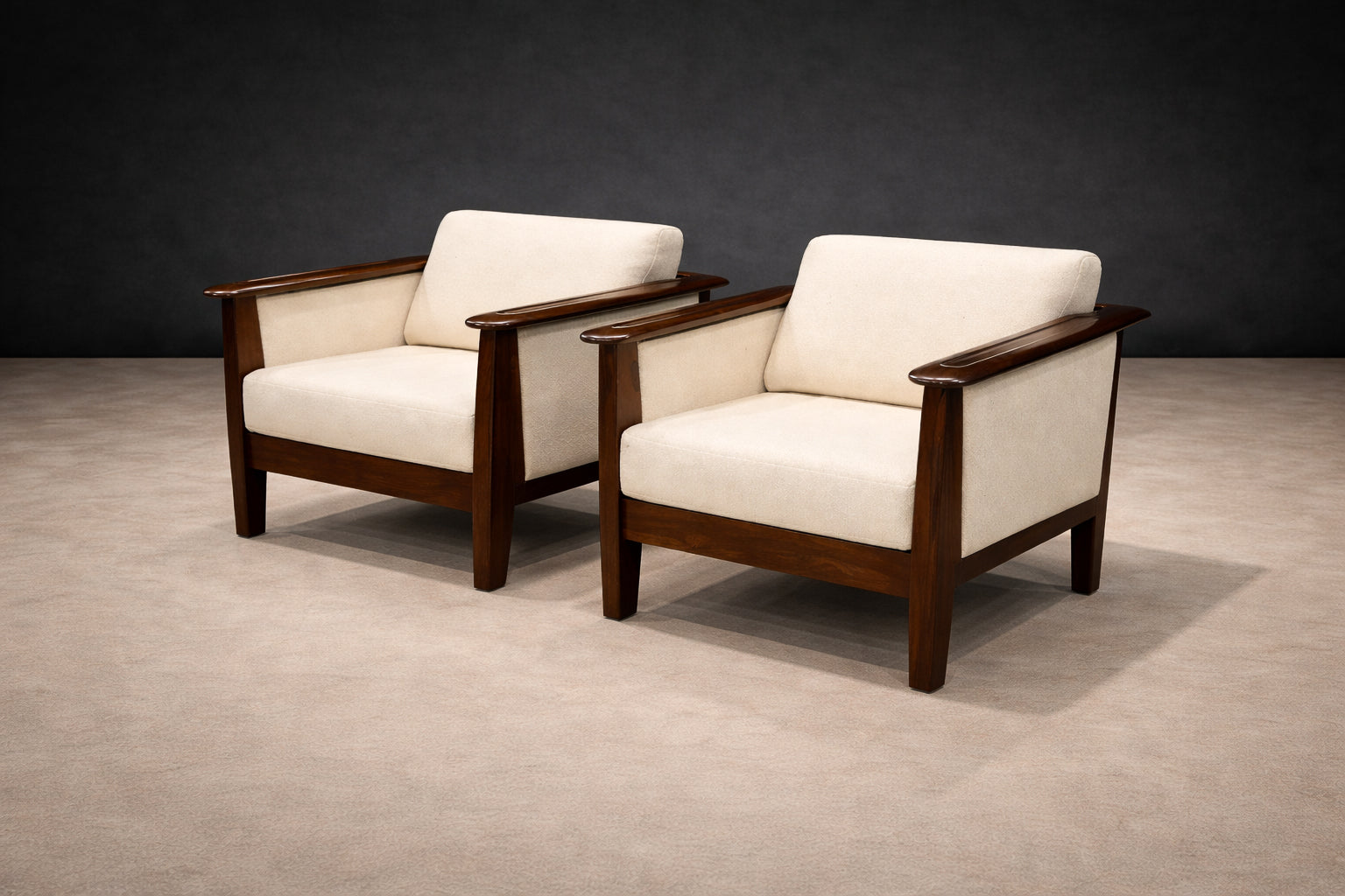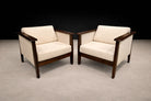 A warm and elegantly proportioned pair of Brazilian modern armchairs produced by Fátima during the 1960s. The design reflects the period’s emphasis on comfort, sculptural woodworking, and refined material contrast—hallmarks of Brazil’s mid-century furniture production.