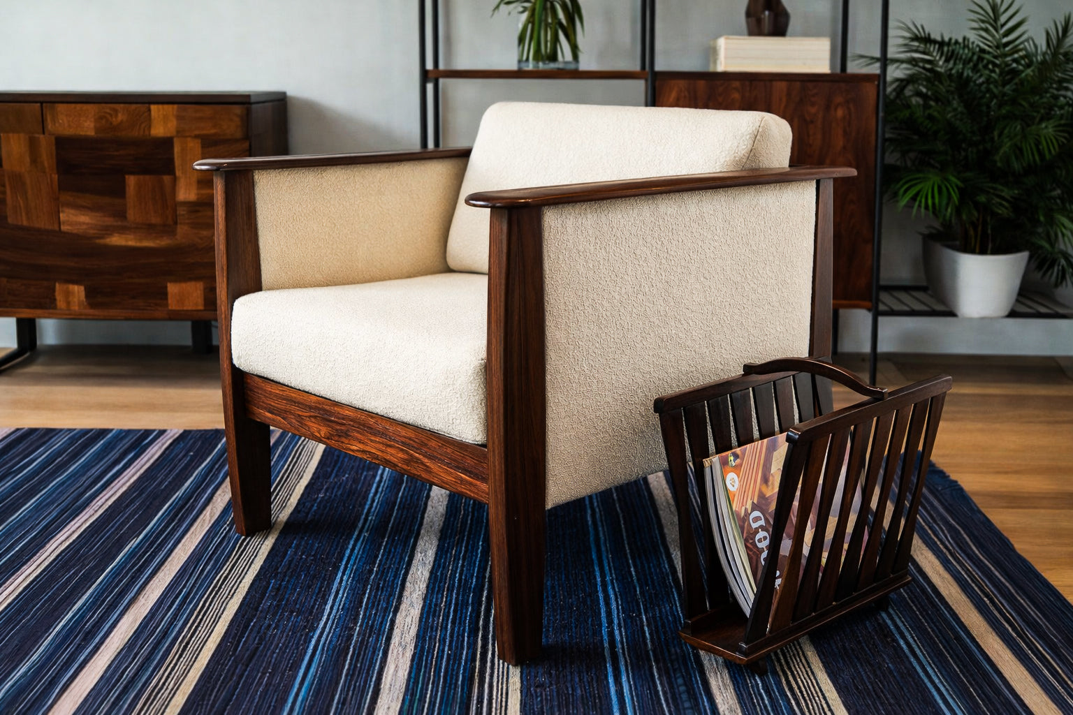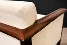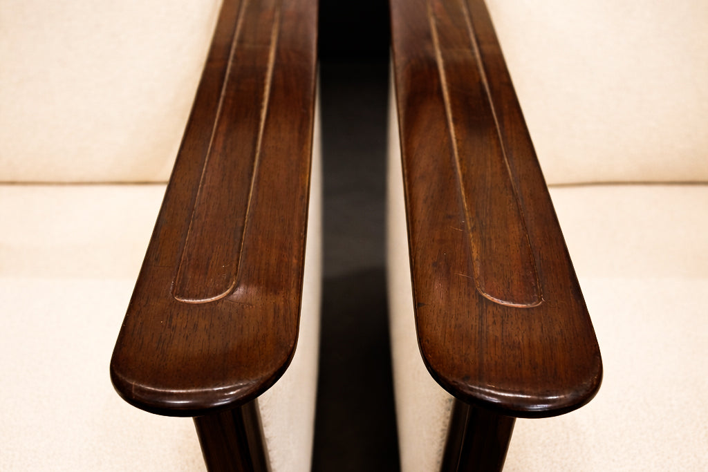 The seats and backs have been newly upholstered in a sophisticated off-white bouclé, introducing a tactile softness that contrasts elegantly with the density of the rosewood frame. The generous cushions and balanced proportions result in exceptionally comfortable seating, well suited for both relaxed living spaces and curated interiors.