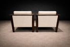 The armchairs are constructed from solid Brazilian rosewood (jacarandá), with beautifully sculpted arms and legs that give the pieces a grounded yet graceful presence. The deep, richly toned rosewood enhances the clarity of the form, emphasizing the confident geometry and soft curves of the design. Recently refinished, the wood reveals a smooth surface and expressive grain, underscoring the quality of the original material.