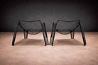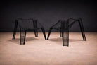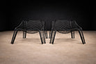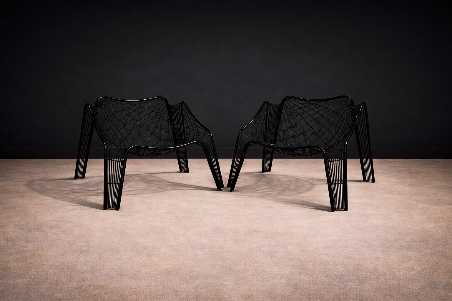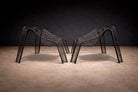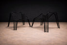 Each chair is constructed from black-painted iron rod, shaped into a continuous, sculptural framework. The legs splay outward in attenuated planes, grounding the composition while maintaining visual permeability. Above, a woven lattice of intersecting iron strands forms the seat and backrest, creating a dynamic crisscross pattern that appears tensile yet controlled. The curvature of the back subtly envelops the sitter, while the open grid preserves transparency and airiness. The design distills structural clarity into an almost anatomical silhouette—at once disciplined and fluid.