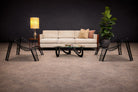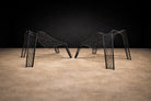 Material integrity is central to the composition. The iron remains fully legible as structure and surface, without applied ornament. The interplay of line and negative space generates rhythm and shadow, allowing the chairs to shift visually depending on vantage point and light. Comfort is integrated into the geometry through the measured recline and the responsive give of the woven metal grid.