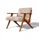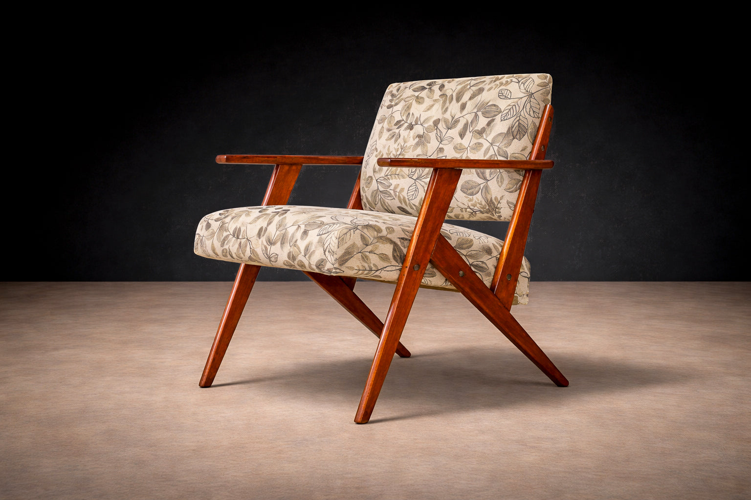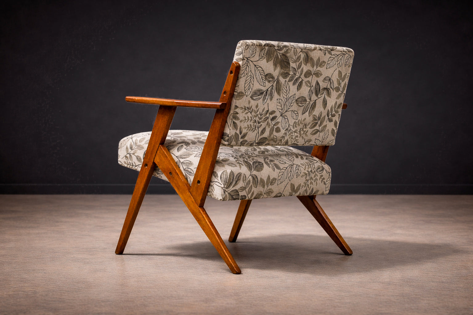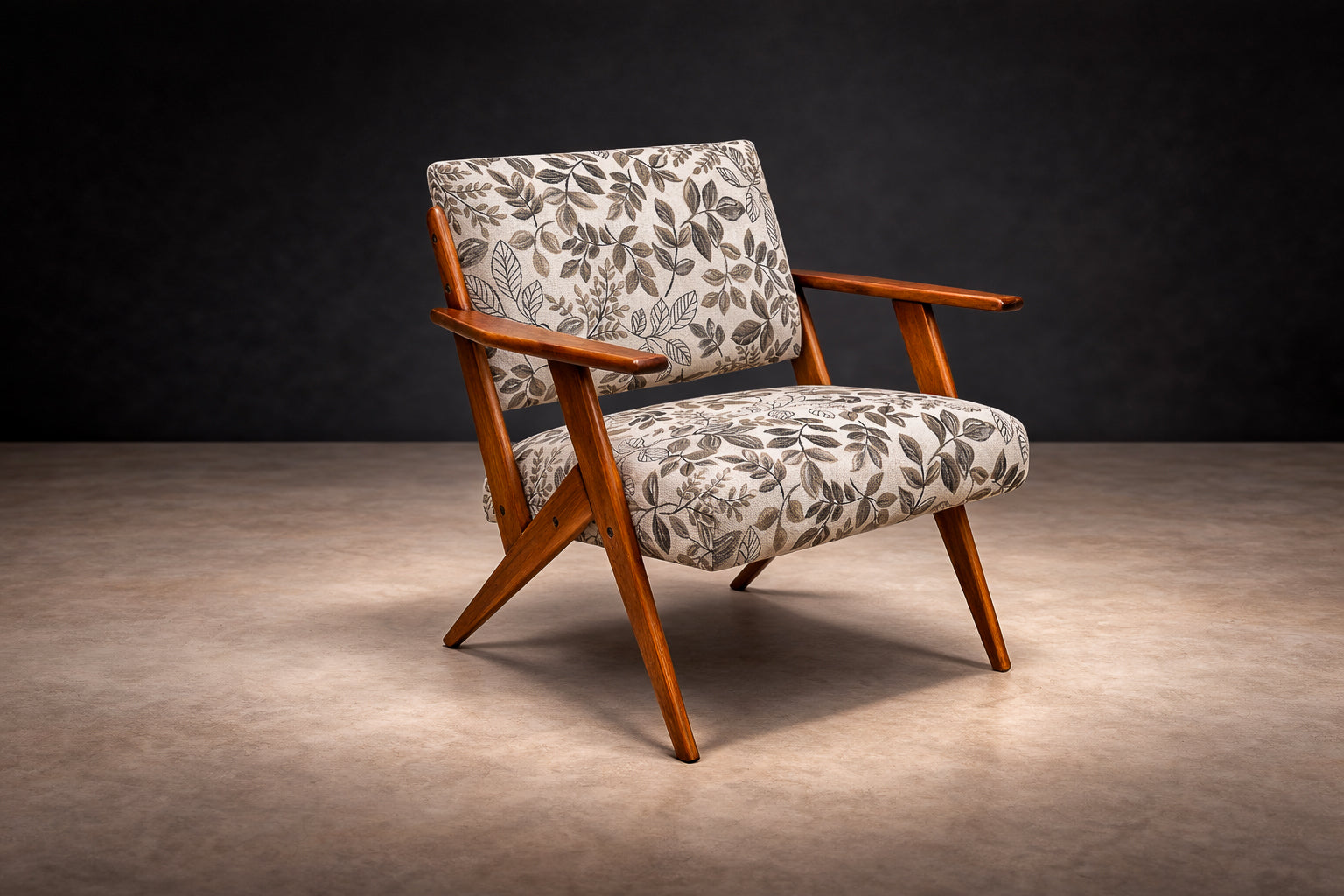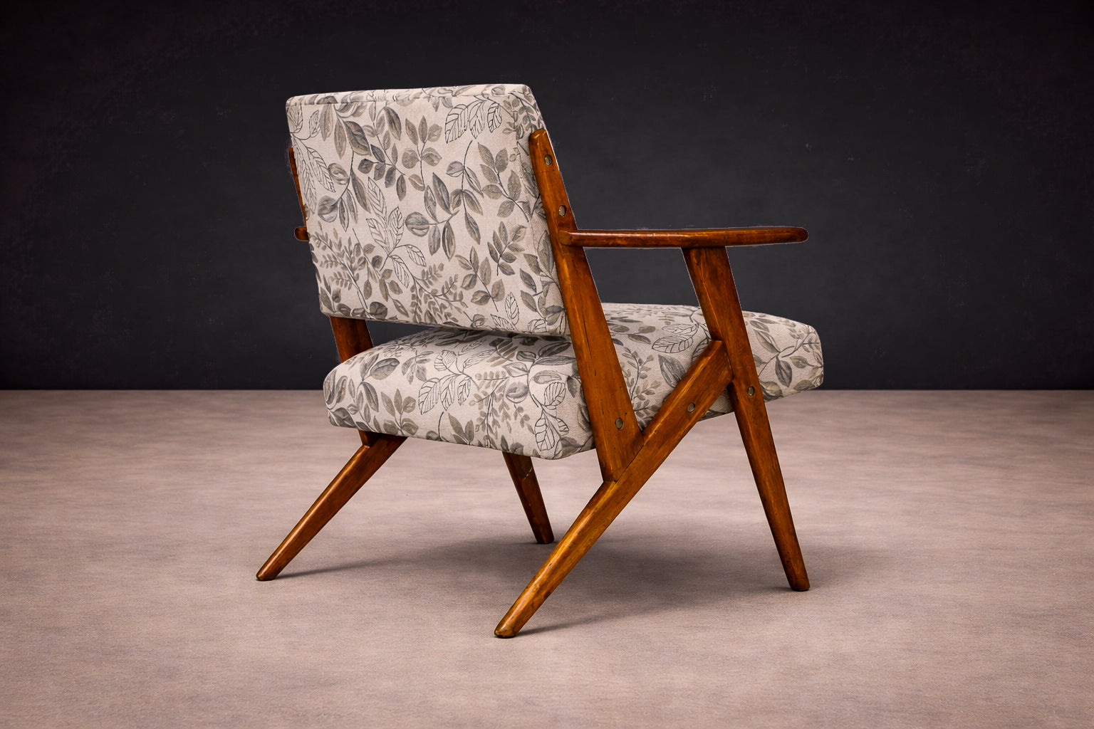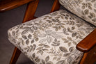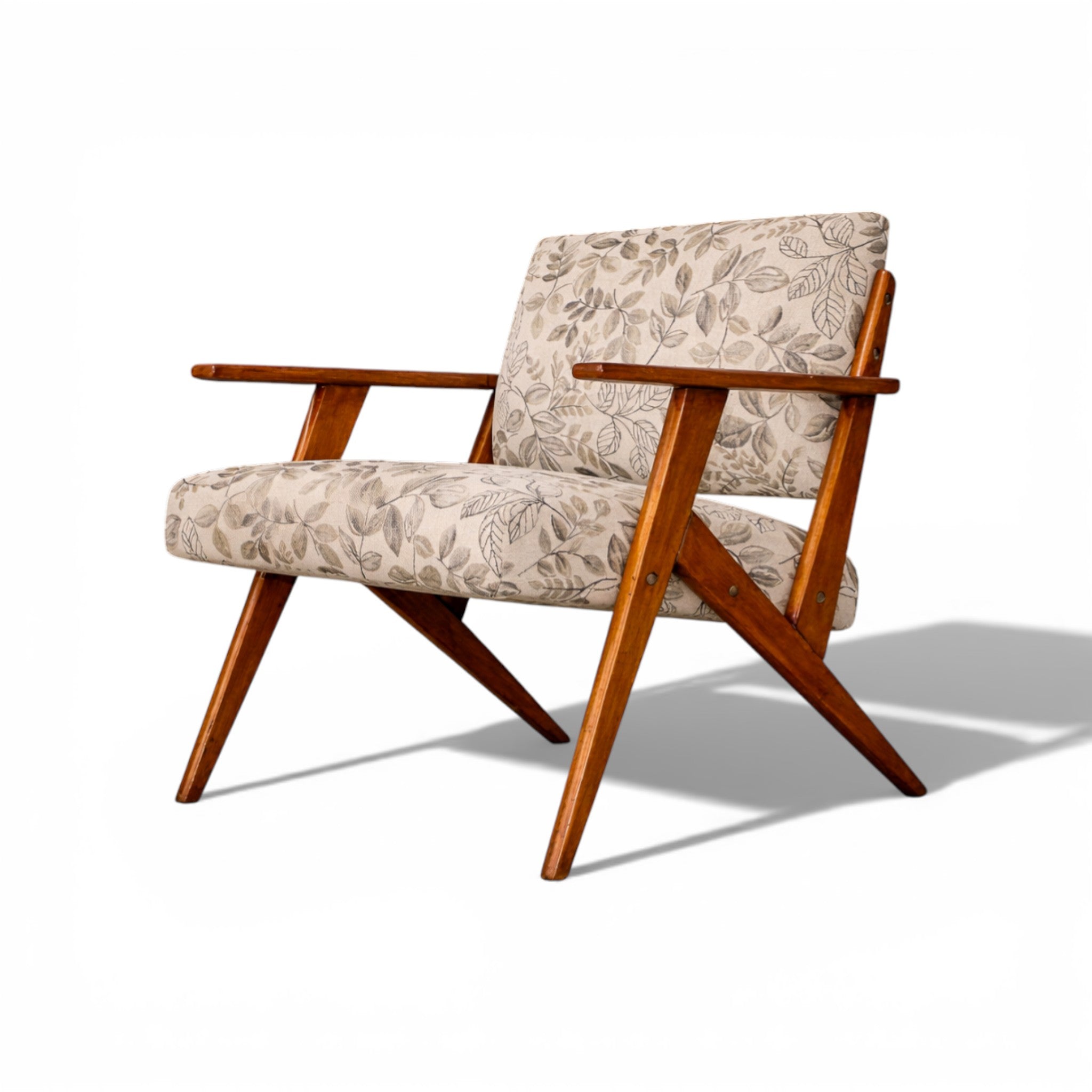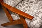 The upholstery has been thoughtfully renewed in a neutral patterned fabric that complements the structure while remaining true to the spirit of the period, offering visual softness and contemporary usability without compromising authenticity.