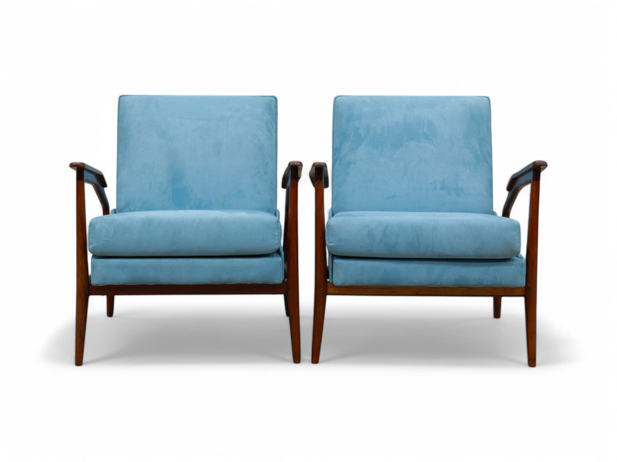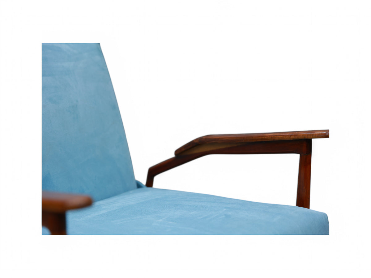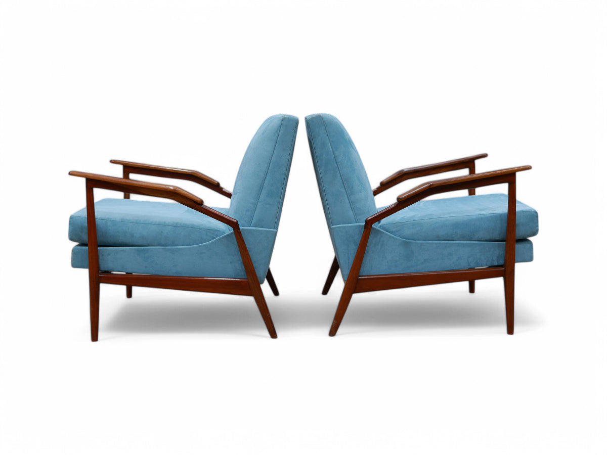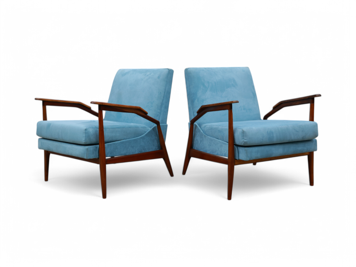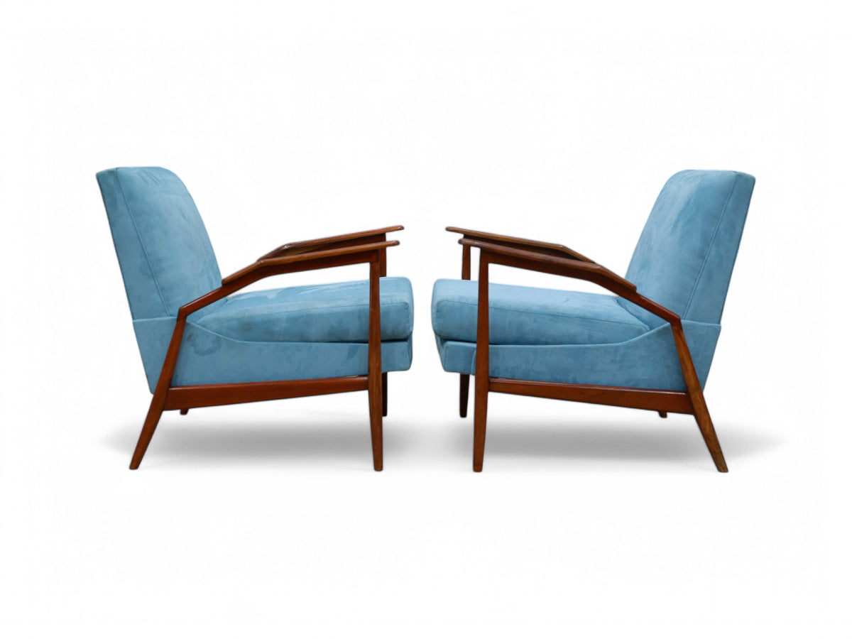 These two chairs feature frames crafted from Caviuna hardwood, while the seat and backrest are upholstered in light blue suede. Both the seat and backrest are angled slightly backward, ensuring exceptional comfort. The playful look of the light blue fabric complements the wood beautifully. The hardwood has been refinished to appear brand new, and the chairs are in excellent condition overall.