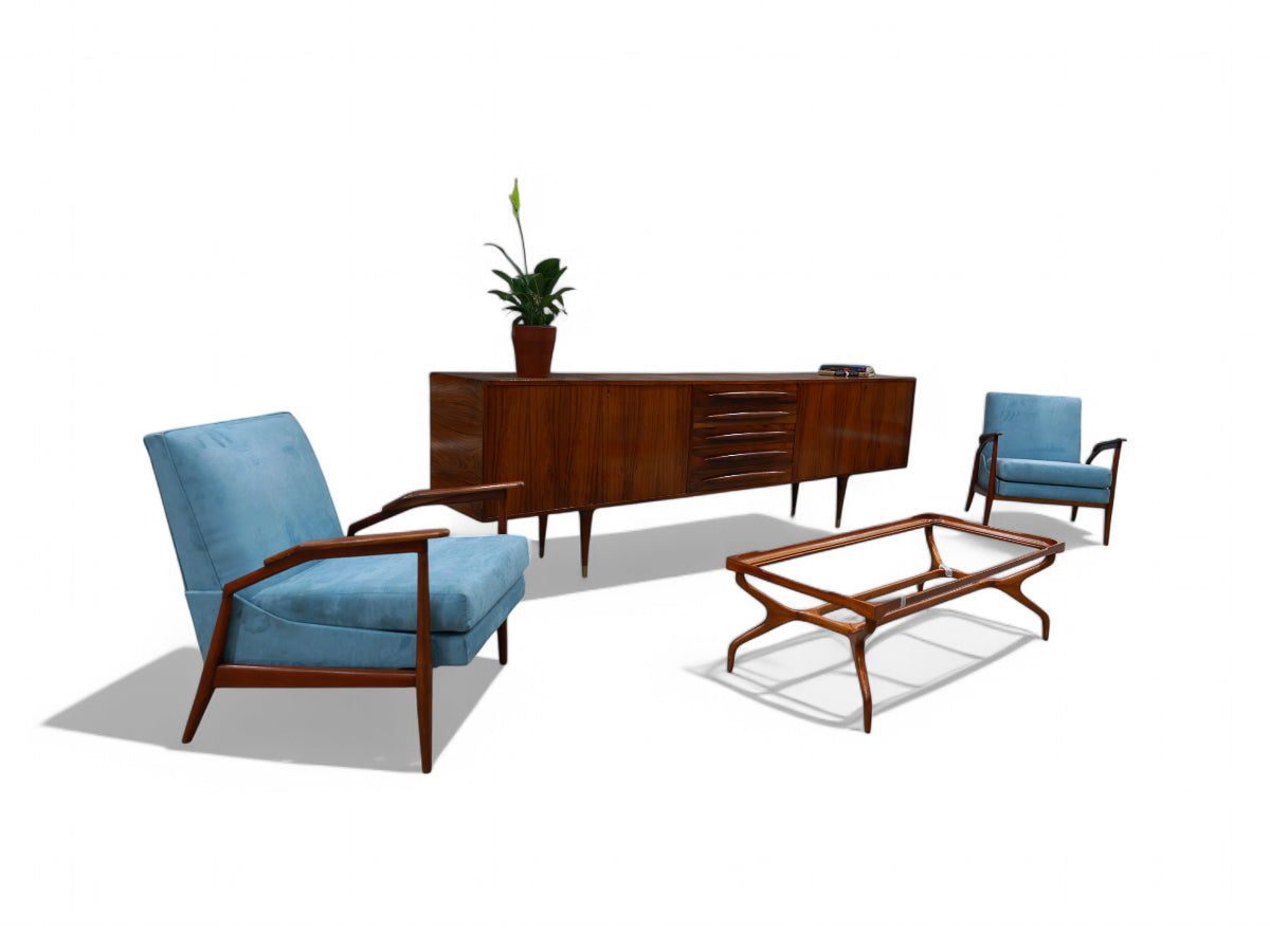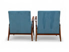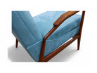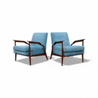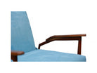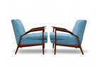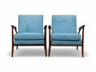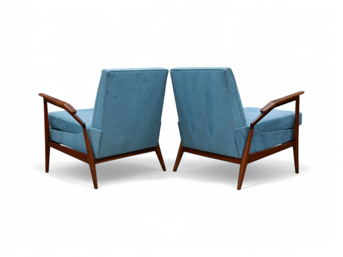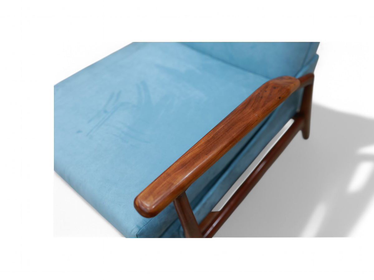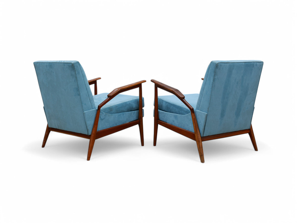These two chairs feature frames crafted from Caviuna hardwood, while the seat and backrest are upholstered in light blue suede. Both the seat and backrest are angled slightly backward, ensuring exceptional comfort. The playful look of the light blue fabric complements the wood beautifully. The hardwood has been refinished to appear brand new, and the chairs are in excellent condition overall.