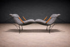 The upholstery has been newly reupholstered in grey fabric, selected for its restrained texture and tonal neutrality. The restoration process required particular attention: when acquired, the chairs no longer retained their original jacarandá armrests. After an extended search through antique markets and specialized dealers in Rio de Janeiro, period-appropriate rosewood arms were sourced and integrated with care, restoring the design to its intended material resolution. The metal frames have been professionally refinished, and the set presents in excellent vintage condition.