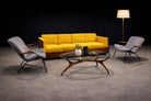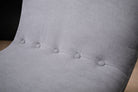 Each chair is defined by a black-painted metal frame, its linear armature establishing a precise geometric outline. The structure remains visually legible, allowing the load-bearing elements to read with structural clarity. Within this framework, the seat and backrest are softly contoured, introducing measured volume against the rigor of the metal. Three-button tufting punctuates the backrest with subtle rhythm, reinforcing the vertical emphasis without ornament.