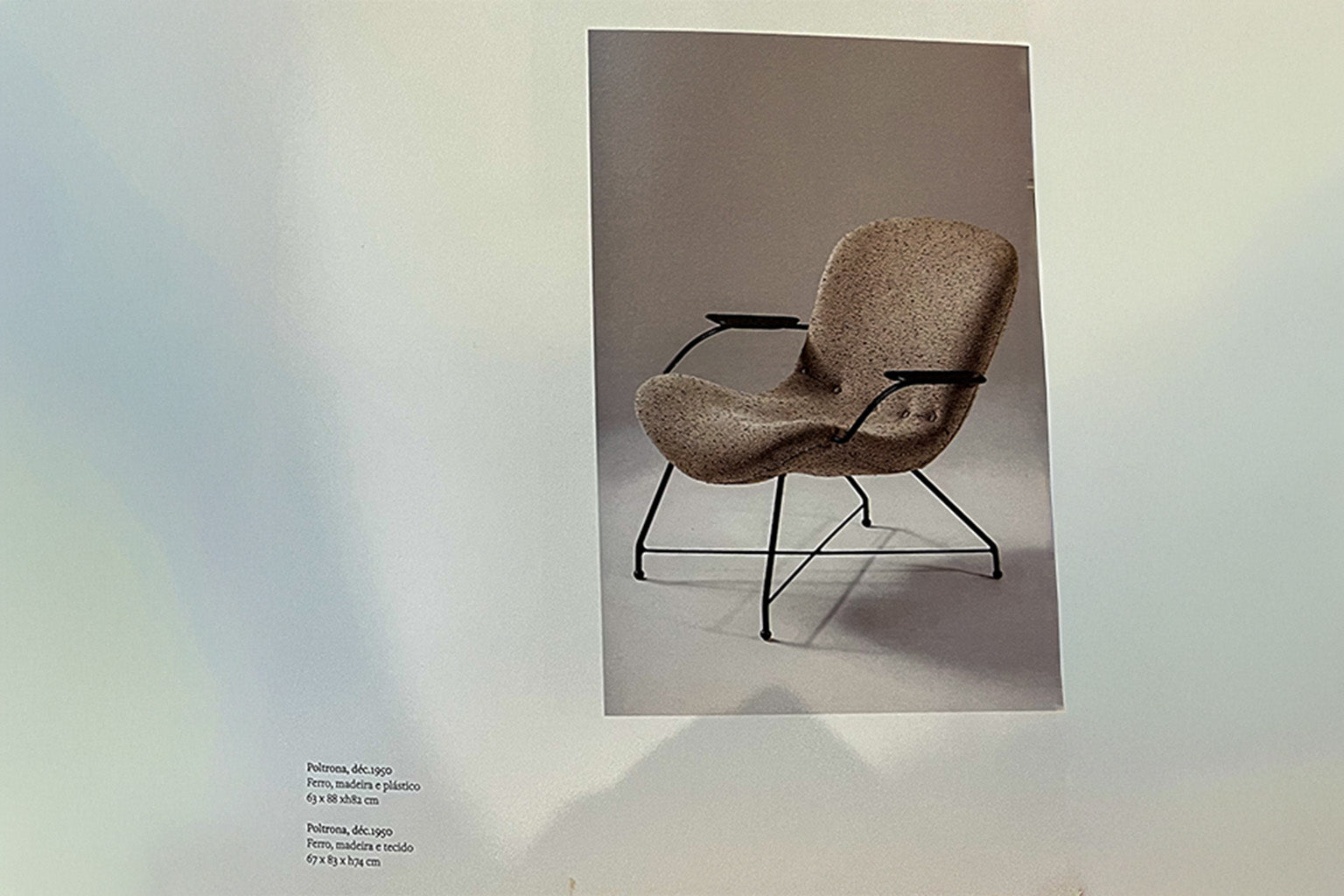 The armrests, crafted in Brazilian rosewood (jacarandá), provide a deliberate counterpoint to the industrial frame. Their warm tonal depth and finely finished grain articulate material integrity, grounding the composition in the richness of native hardwood. The juxtaposition of cool metal and dense tropical wood reflects a broader modernist dialogue between industry and craft.