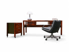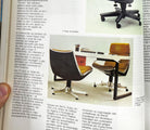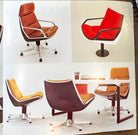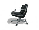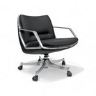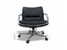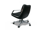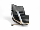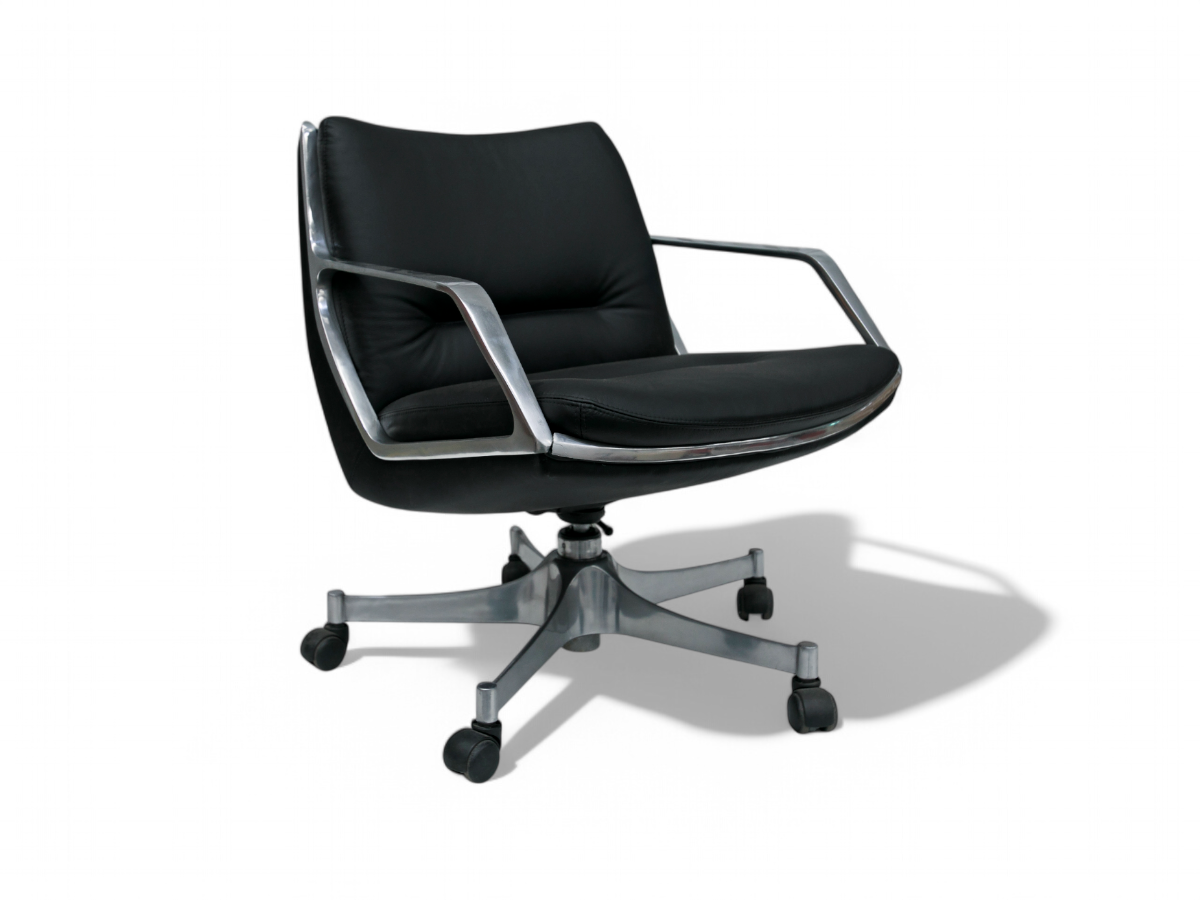 The seat and backrest of this chair are crafted from a single curved fiberglass volume, upholstered in black leather, while the armrests are made from solid aluminum. Not only does this chair exhibit remarkable beauty and thoughtful design, but it is also renowned for its exceptional comfort, boasting a reclining mechanism and swivel base.