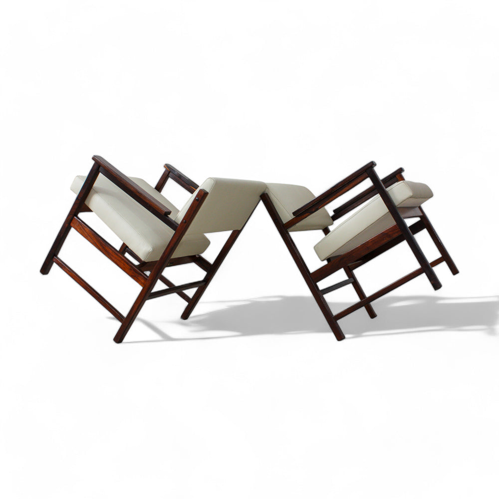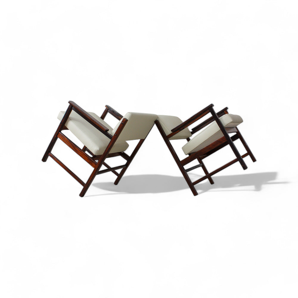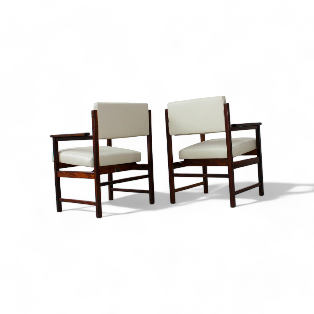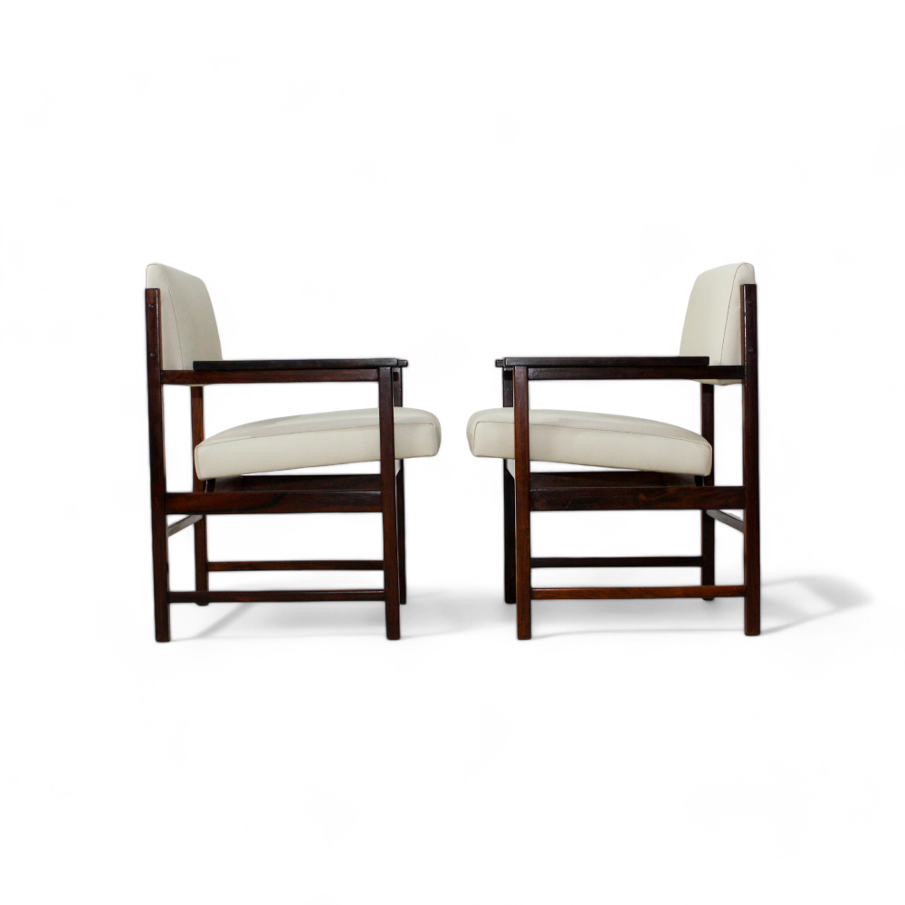 These two armchairs, crafted from hardwood and upholstered in beige leather, were originally owned by Infraero, the government institution responsible for airports in Brazil. If you're searching for a unique and historically significant piece, look no further. Produced by Bureau Moveis, this set exemplifies the outstanding design and craftsmanship of 1960s Brazil.