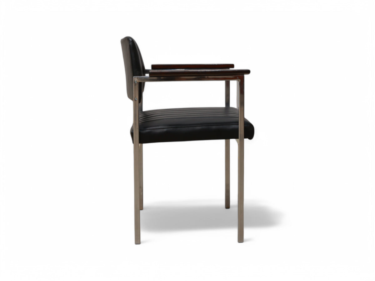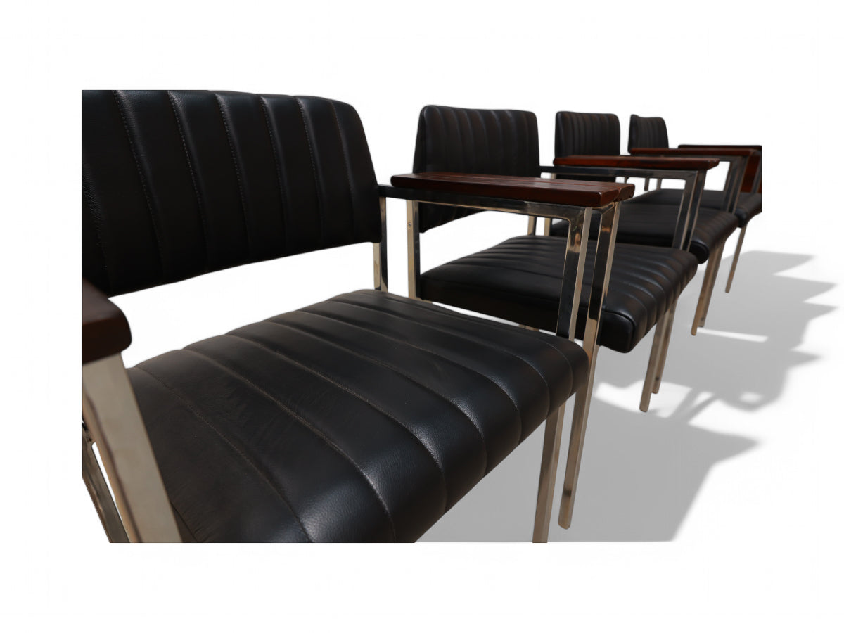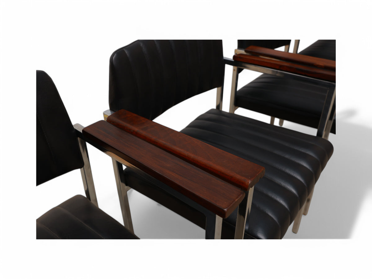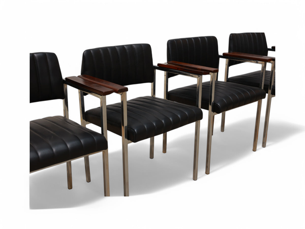 These chairs are constructed with steel frames and feature seats and backrests made from black leather. Additionally, the armrests are crafted from dark brown noble wood. They have been refinished and are in excellent condition.