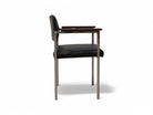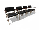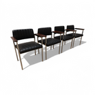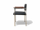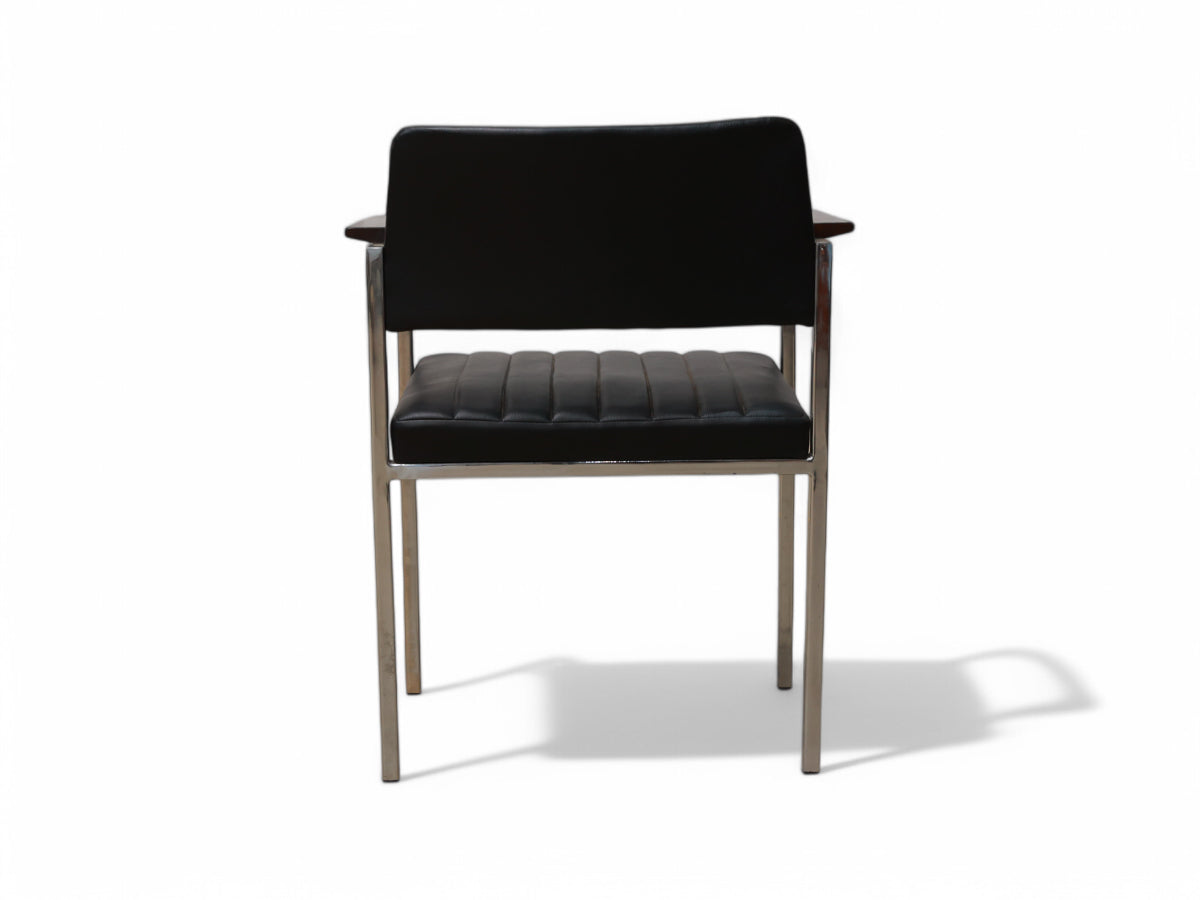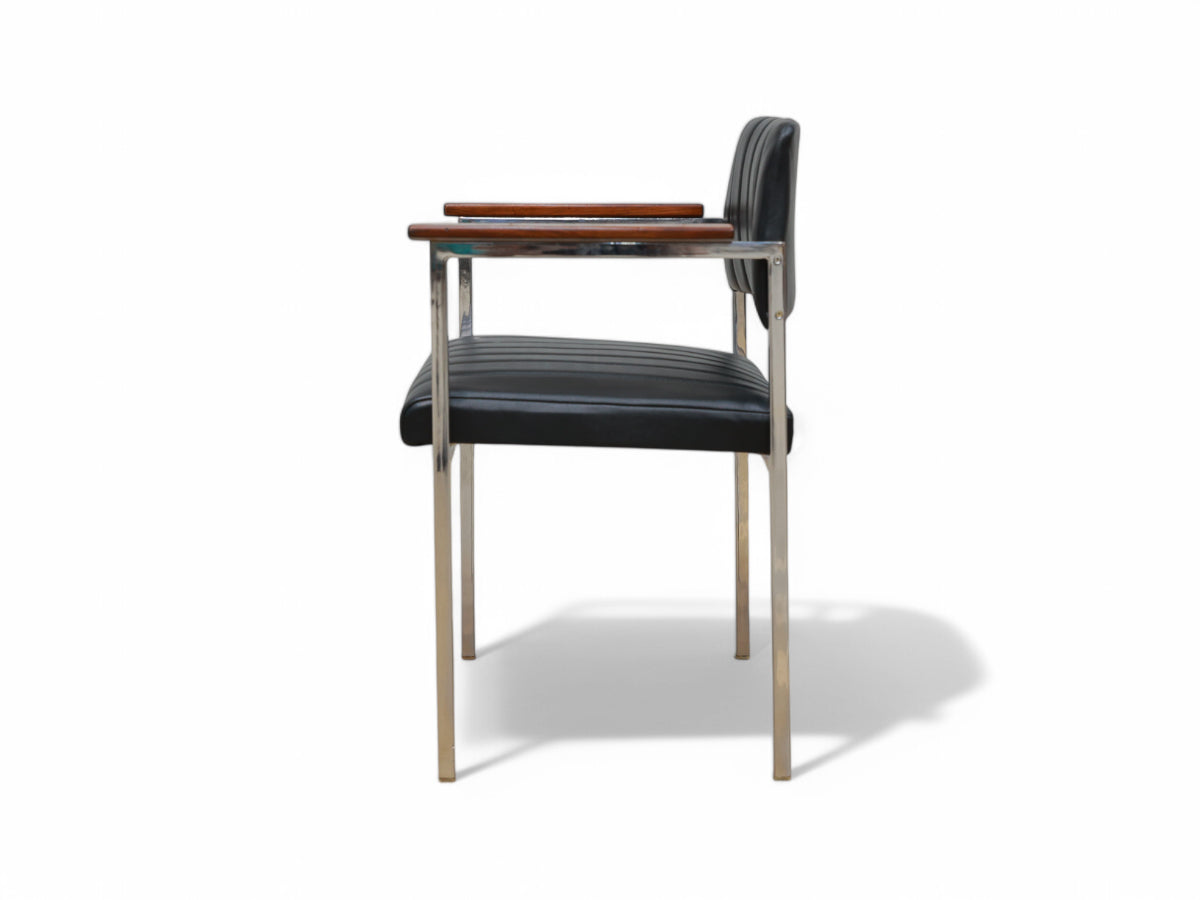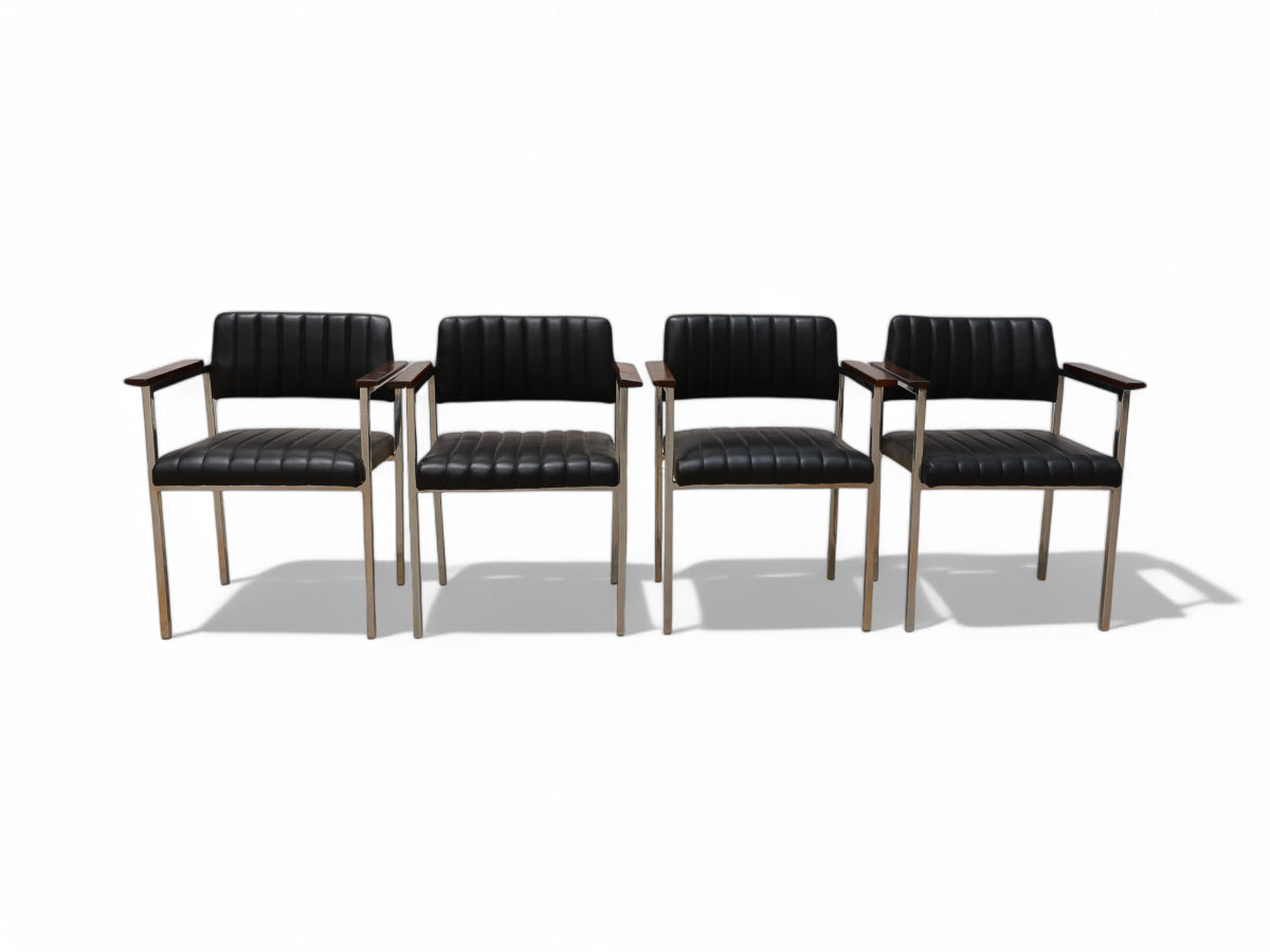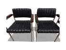 These chairs are constructed with steel frames and feature seats and backrests made from black leather. Additionally, the armrests are crafted from dark brown noble wood. They have been refinished and are in excellent condition.