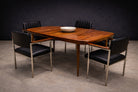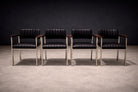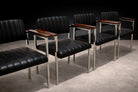 The seats and backrests are upholstered in black leather, channel-stitched to emphasize rhythm and proportion. The subtle curvature of the backrest provides ergonomic support while maintaining the overall rectilinear discipline of the design. Function is absorbed directly into the structure: the steel frame carries the load with precision, while the leather panels offer comfort without visual weight.