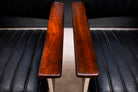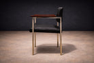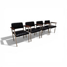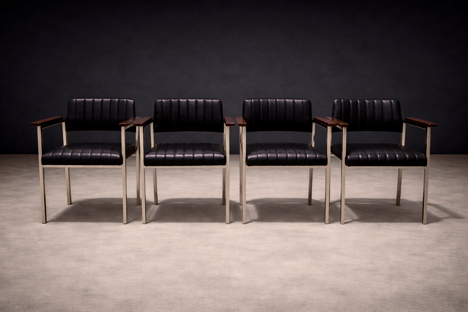 Each chair is anchored by a slender steel frame, its linear armature establishing a clear geometric order. The vertical supports and rectilinear legs articulate a sense of lightness, allowing the structure to remain visually legible without excess. This structural clarity is balanced by the warmth of the dark brown hardwood armrests, whose horizontal planes soften the austerity of the metal frame and introduce a measured tactile counterpoint.