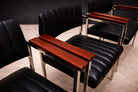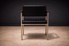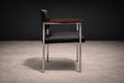 The chairs have been professionally refinished. The steel frames present with a clean, even surface; the hardwood armrests have been restored to highlight their natural tone and grain; and the leather upholstery remains in excellent vintage condition.