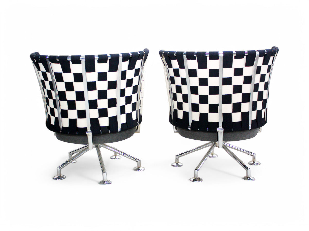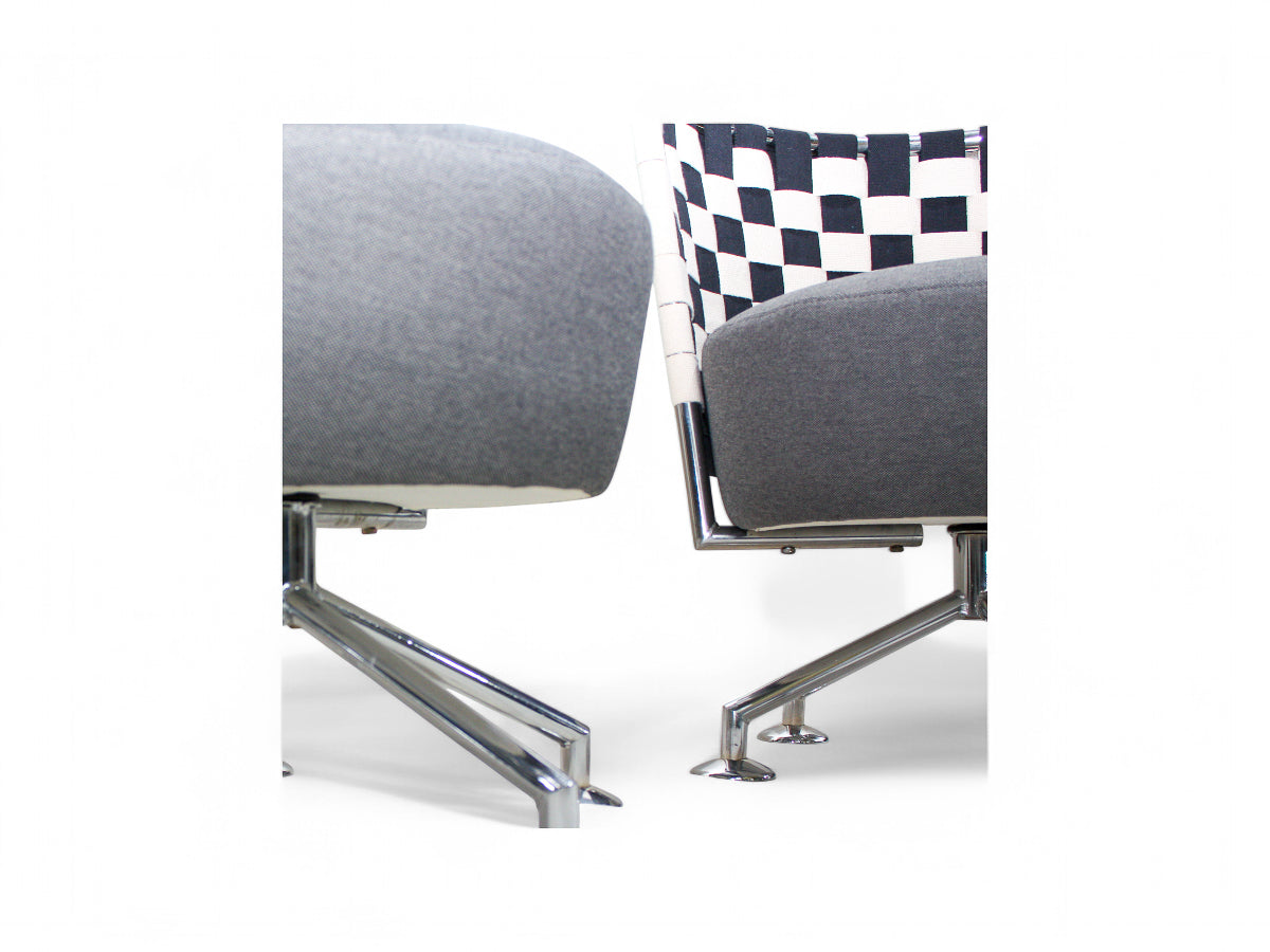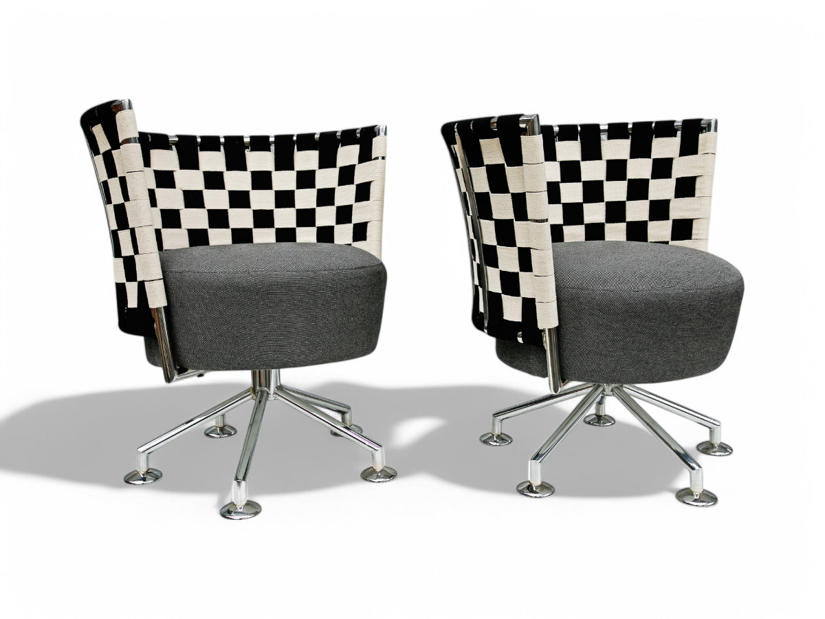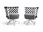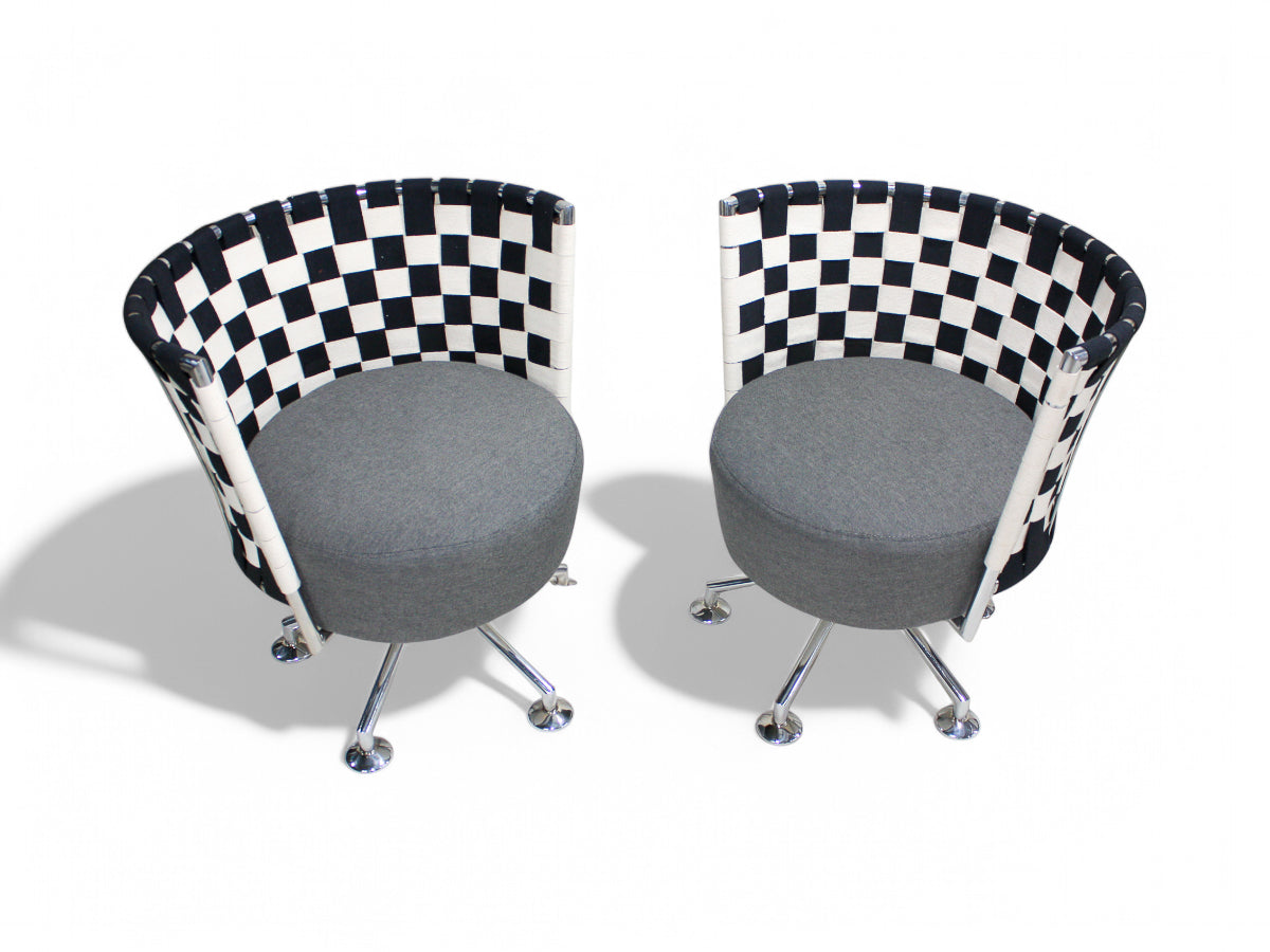 This pair of armchairs features a steel frame with circular fabric seats. The chairs have gray seats and black and white checkered backrests, giving them a fun and playful aesthetic. The curved backrests and soft cushions make these chairs exceptionally comfortable, and their unique design allows them to complement any home interior. Both chairs have been refinished and reupholstered, ensuring they are in excellent condition.