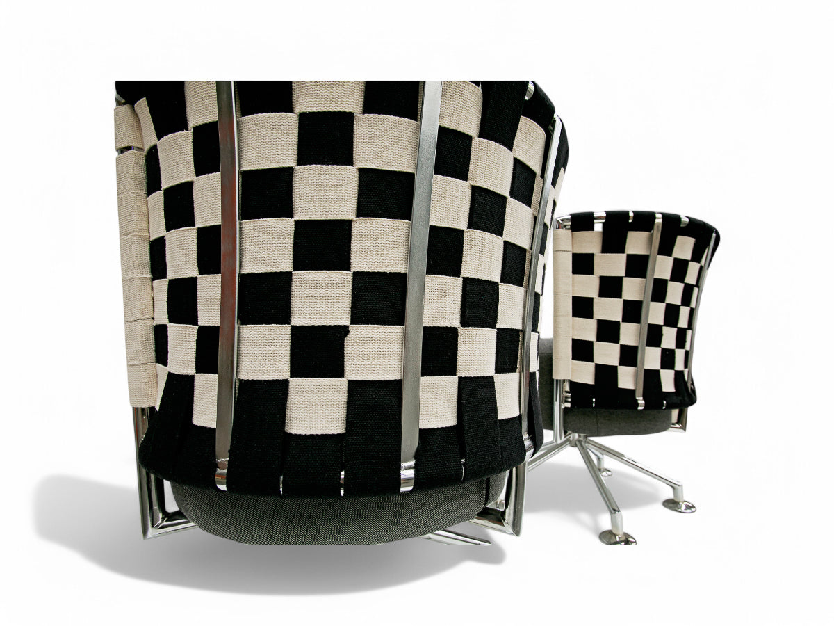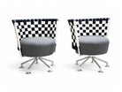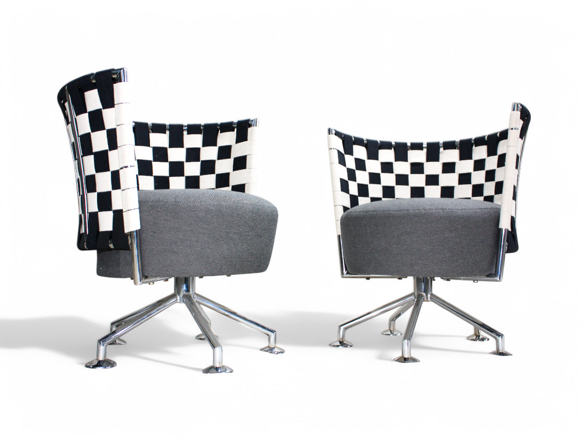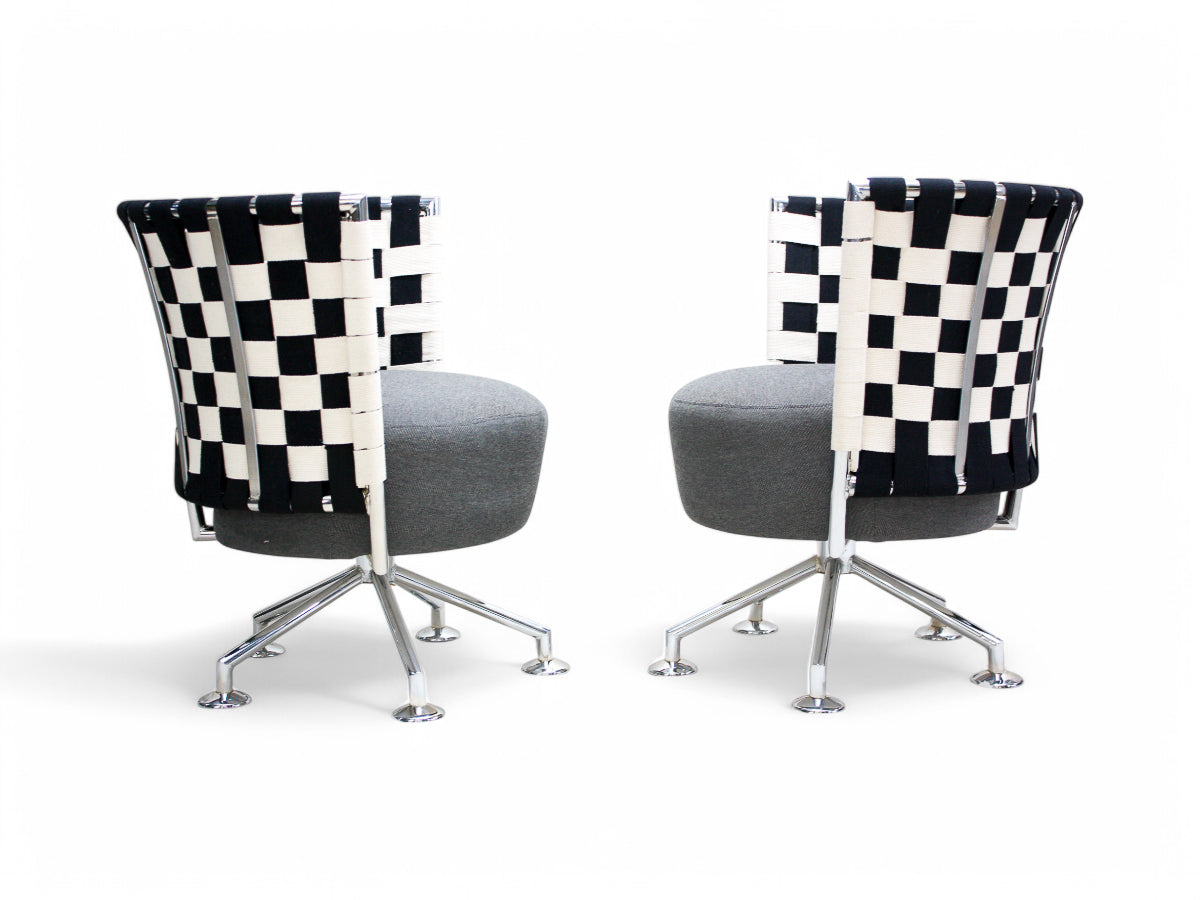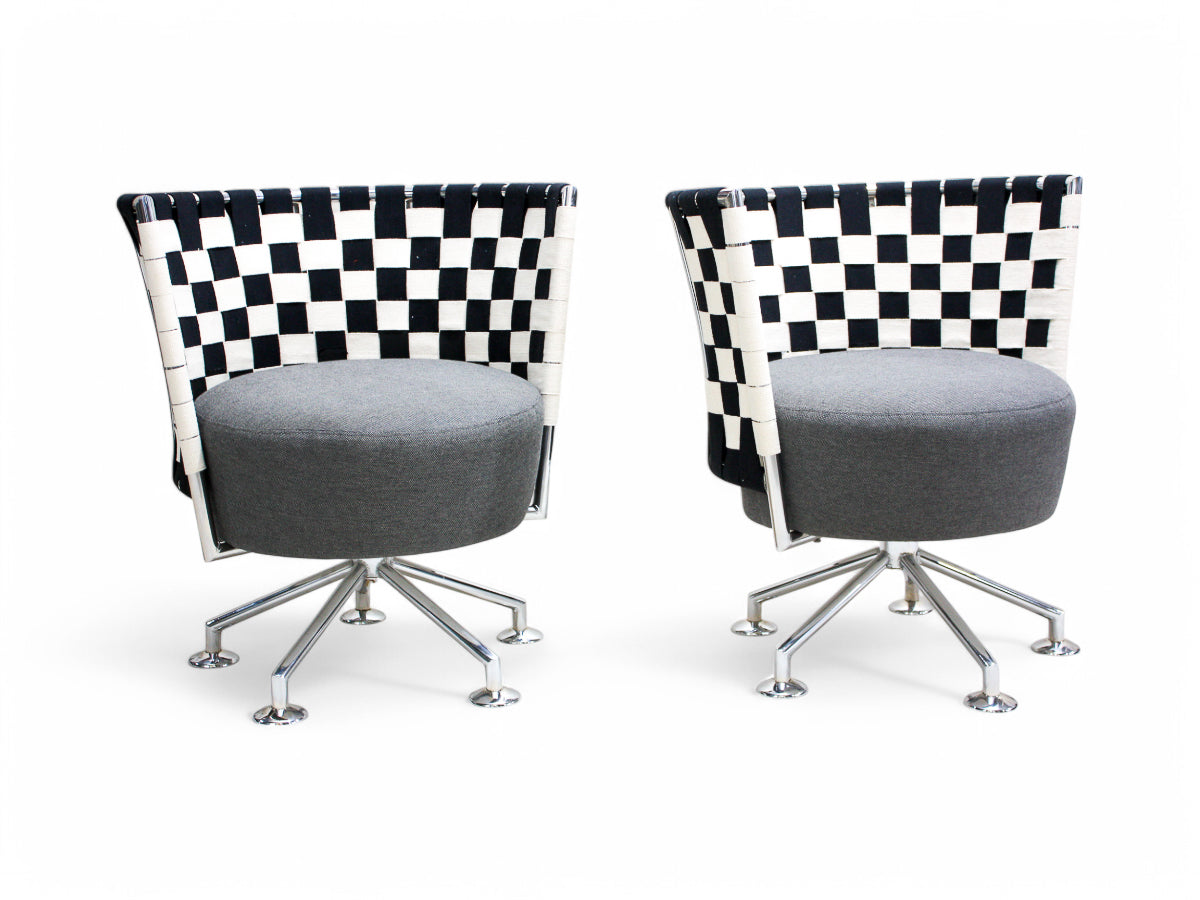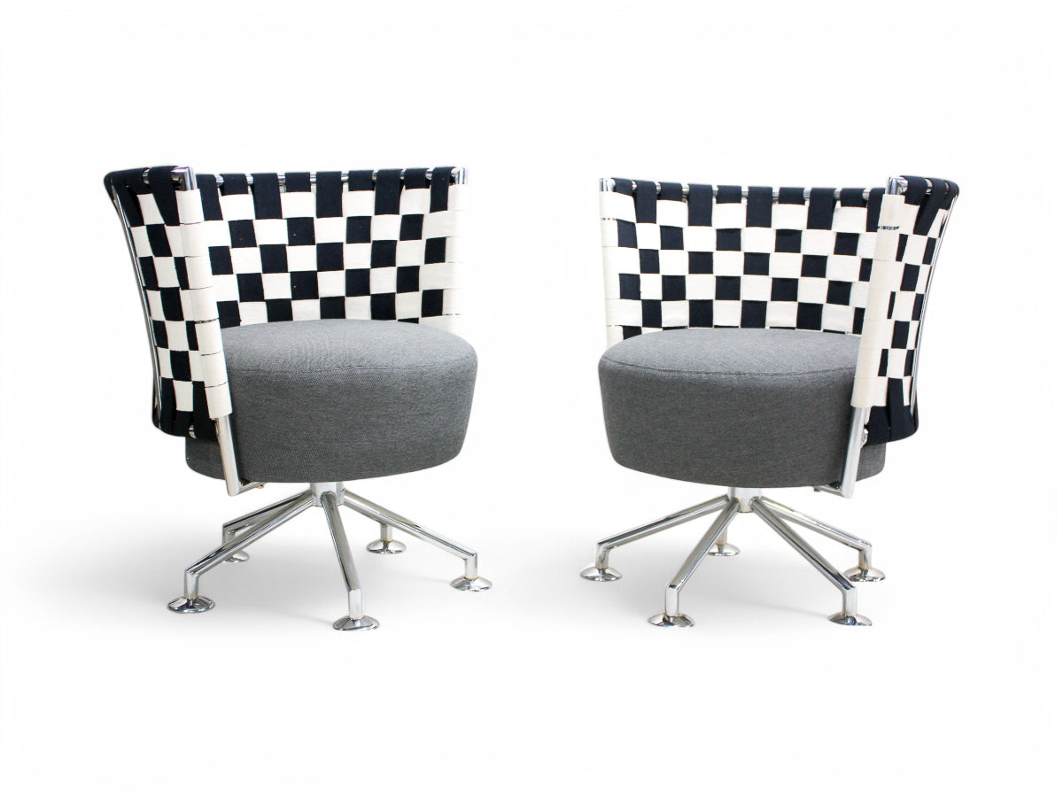This pair of armchairs features a steel frame with circular fabric seats. The chairs have gray seats and black and white checkered backrests, giving them a fun and playful aesthetic. The curved backrests and soft cushions make these chairs exceptionally comfortable, and their unique design allows them to complement any home interior. Both chairs have been refinished and reupholstered, ensuring they are in excellent condition.