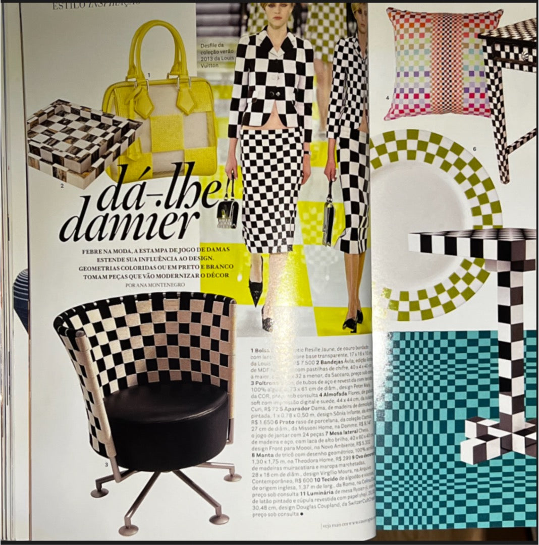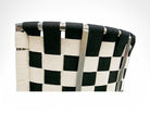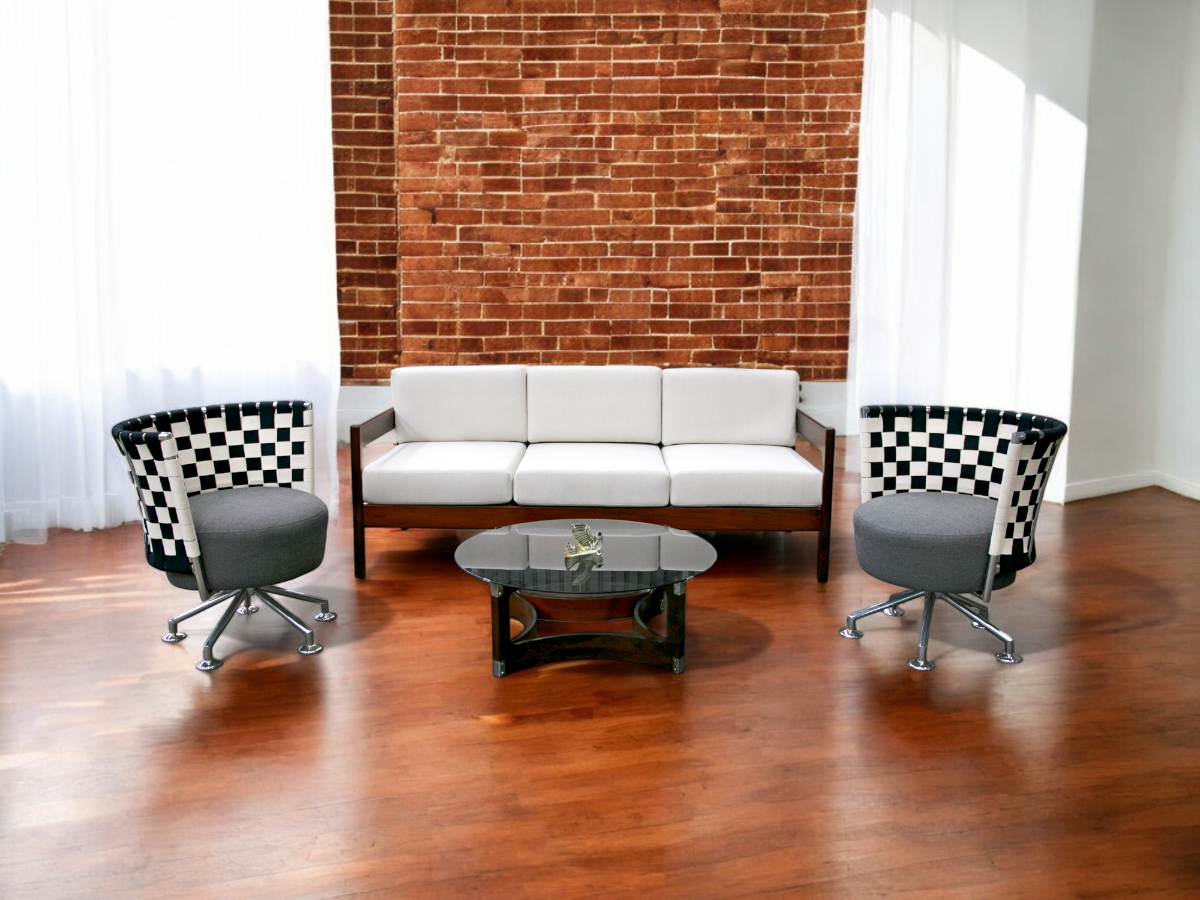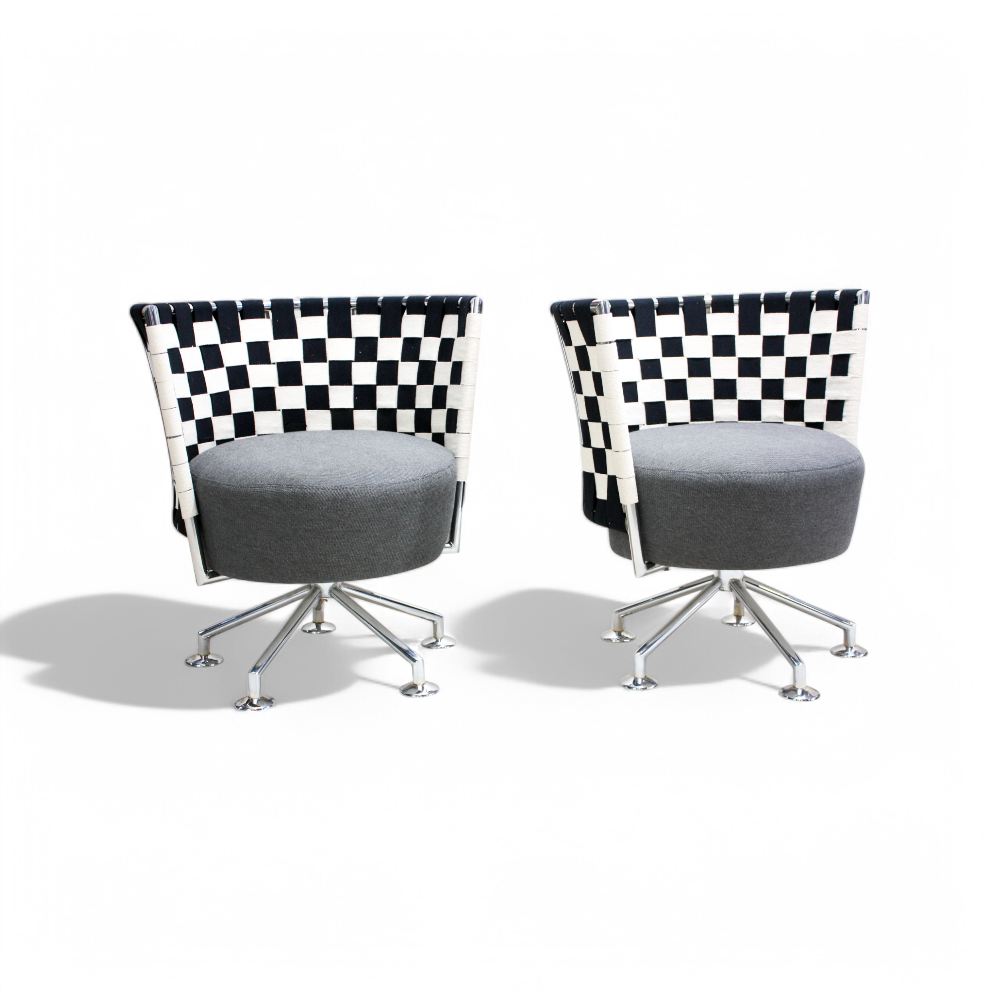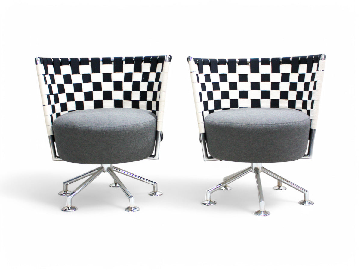 This pair of armchairs features a steel frame with circular fabric seats. The chairs have gray seats and black and white checkered backrests, giving them a fun and playful aesthetic. The curved backrests and soft cushions make these chairs exceptionally comfortable, and their unique design allows them to complement any home interior. Both chairs have been refinished and reupholstered, ensuring they are in excellent condition.