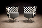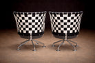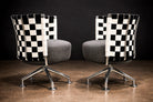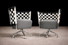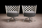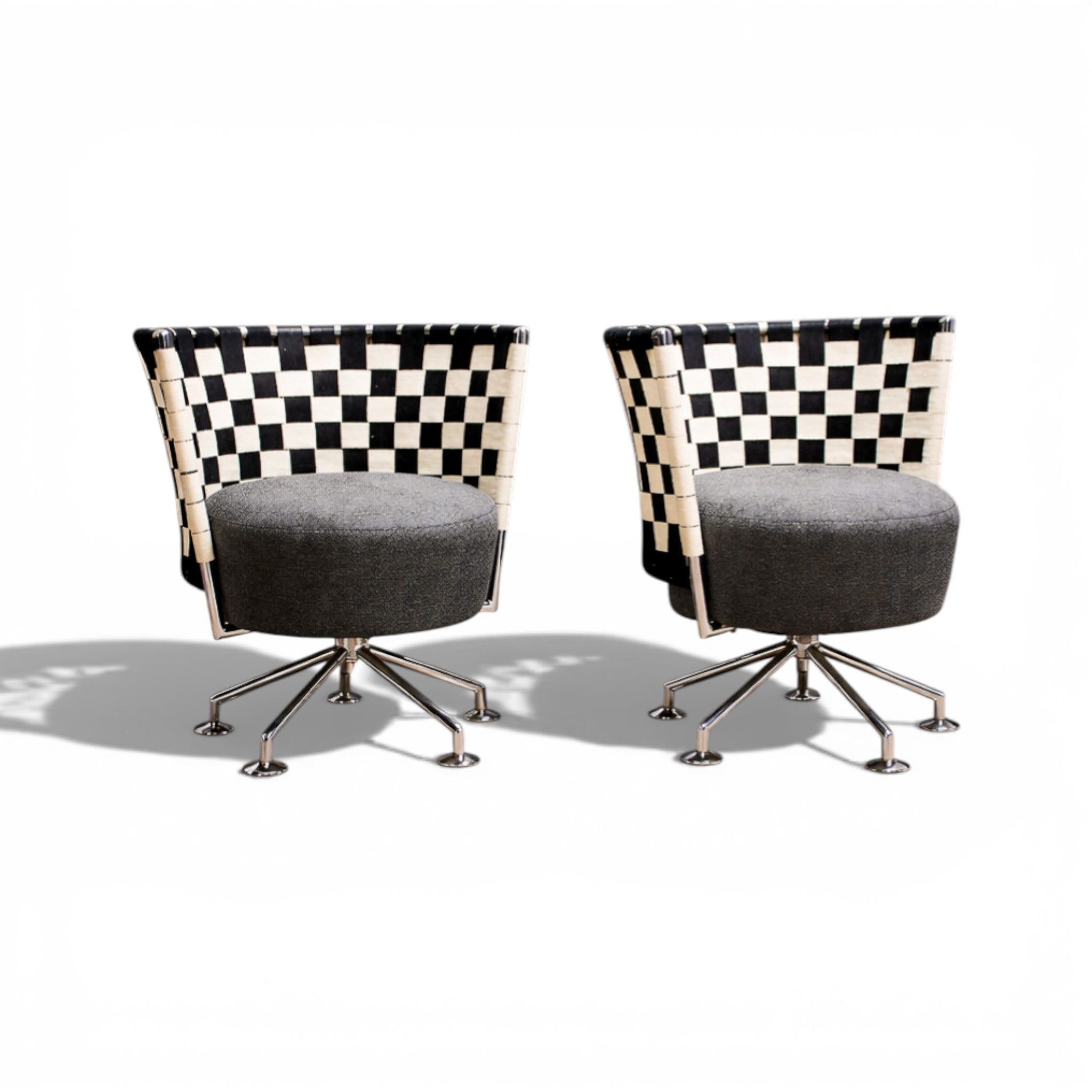 Designed by Peter Maly in the 1990s, this pair of armchairs reflects the designer’s characteristic exploration of form, material contrast, and visual rhythm. Each chair is constructed with a polished steel frame and a radial swivel base, supporting a circular upholstered seat.