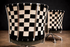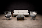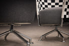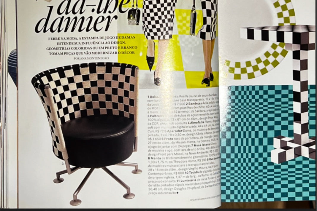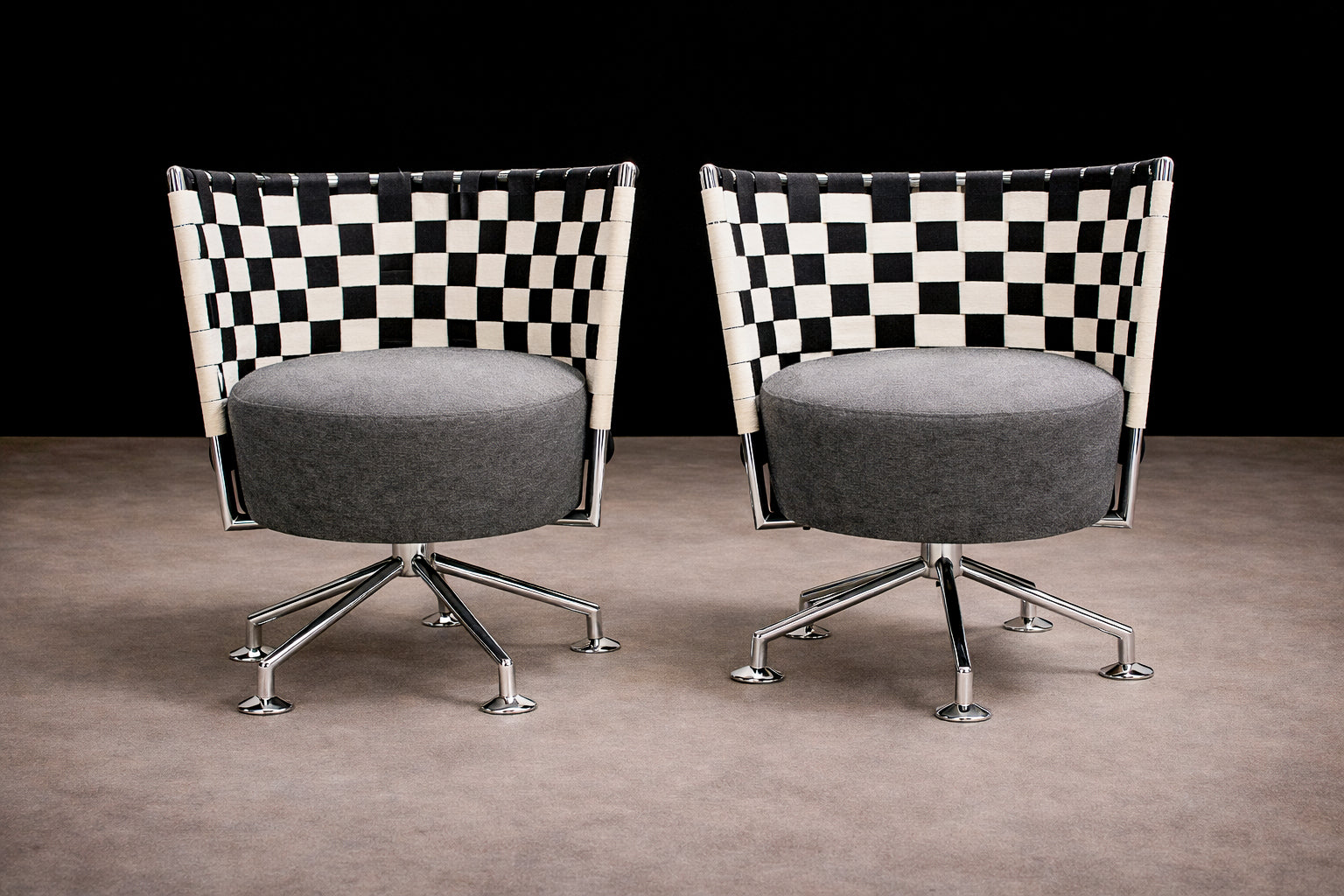 The backrests are formed through a woven structure in black and white, creating a distinctive checkerboard pattern that introduces both graphic clarity and material texture. This woven element curves gently around the seat, providing both visual enclosure and ergonomic support.