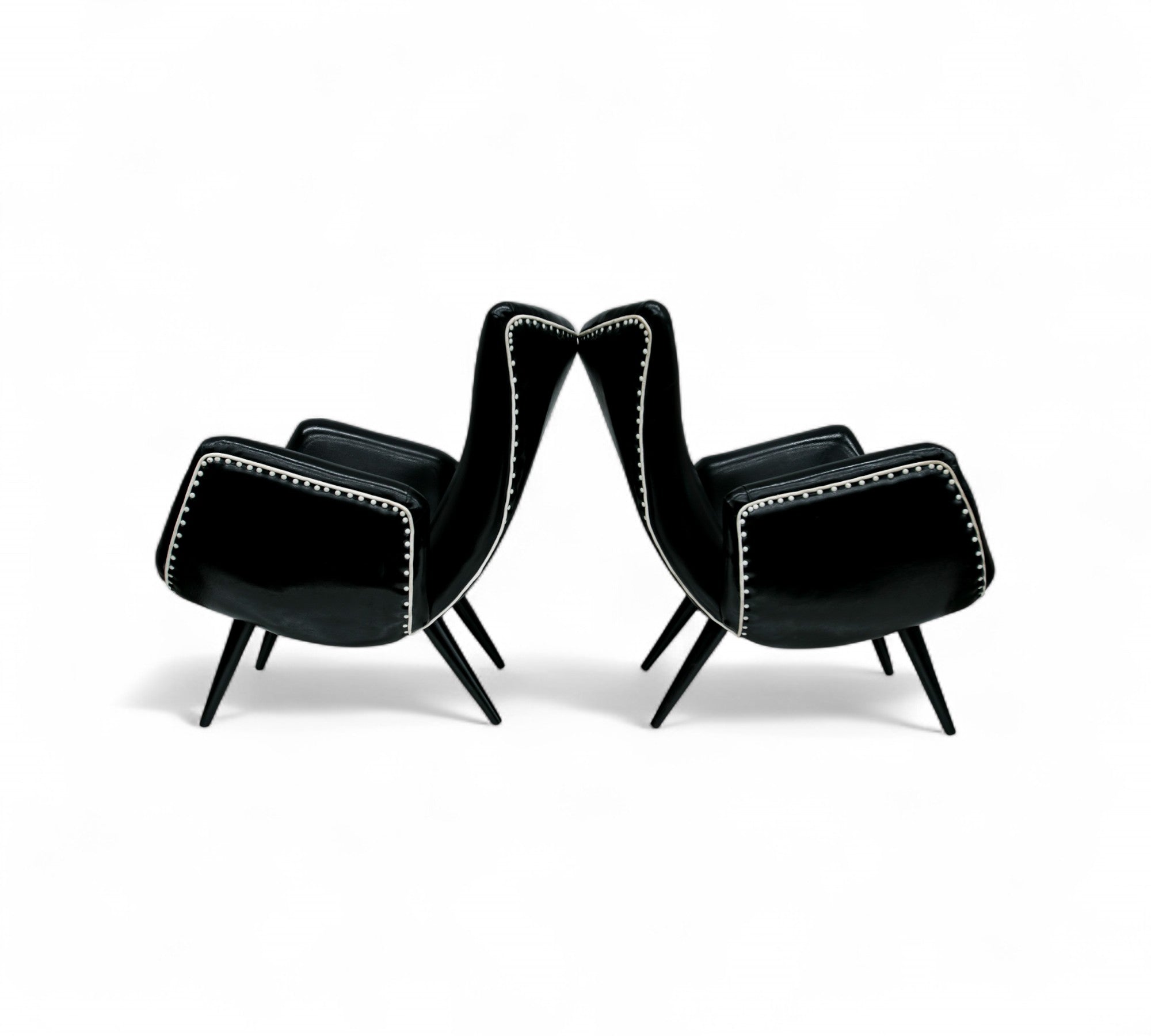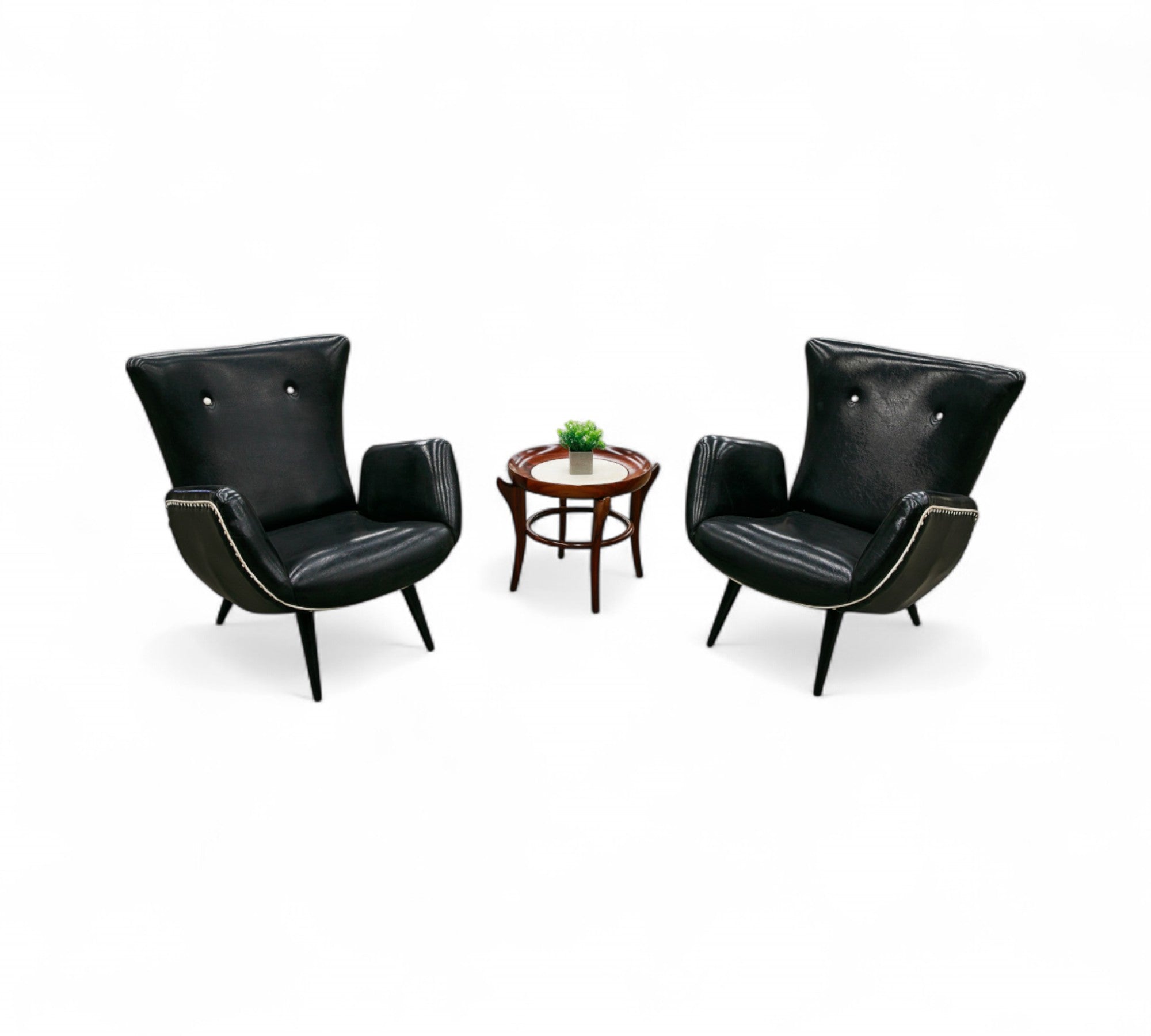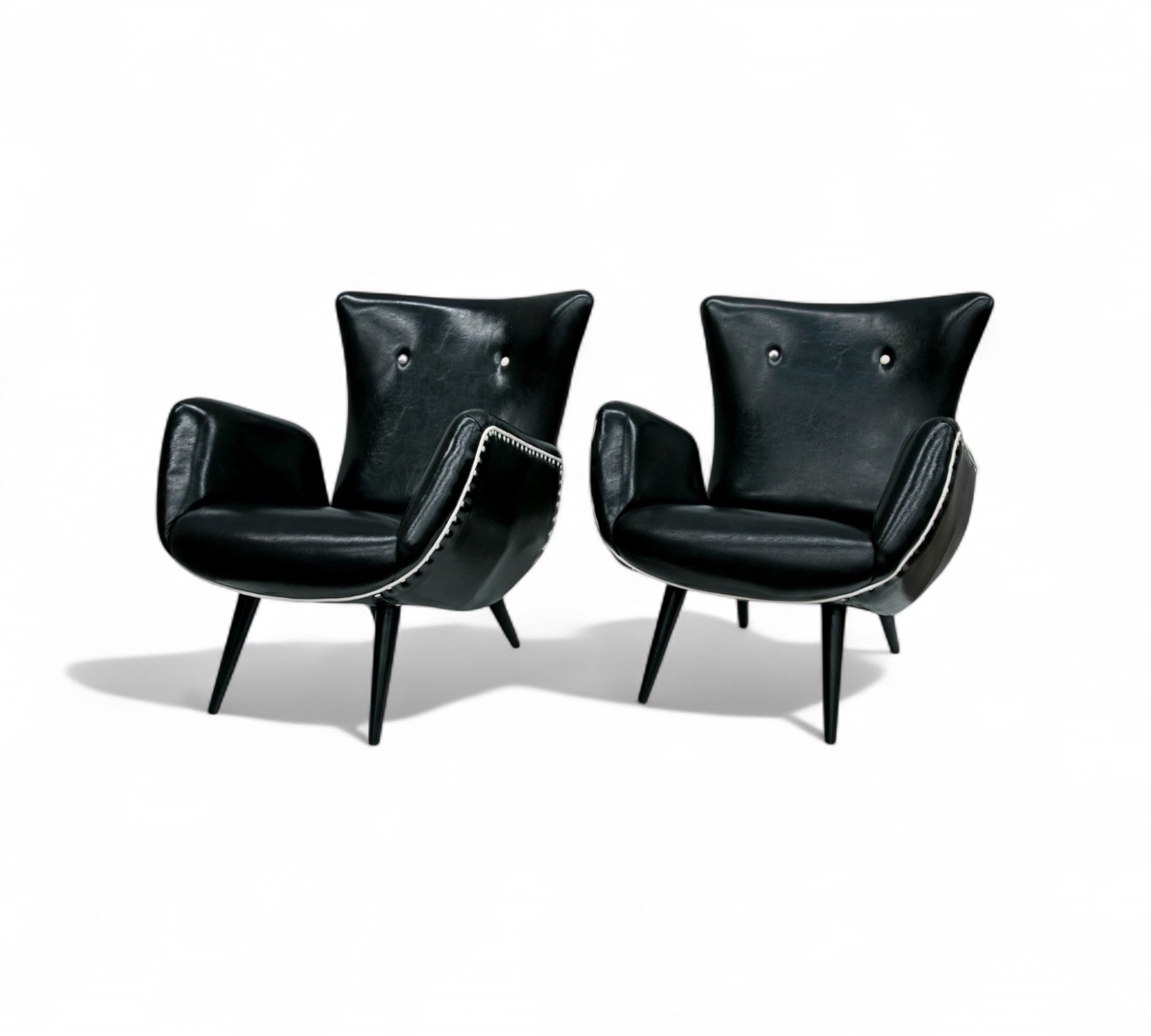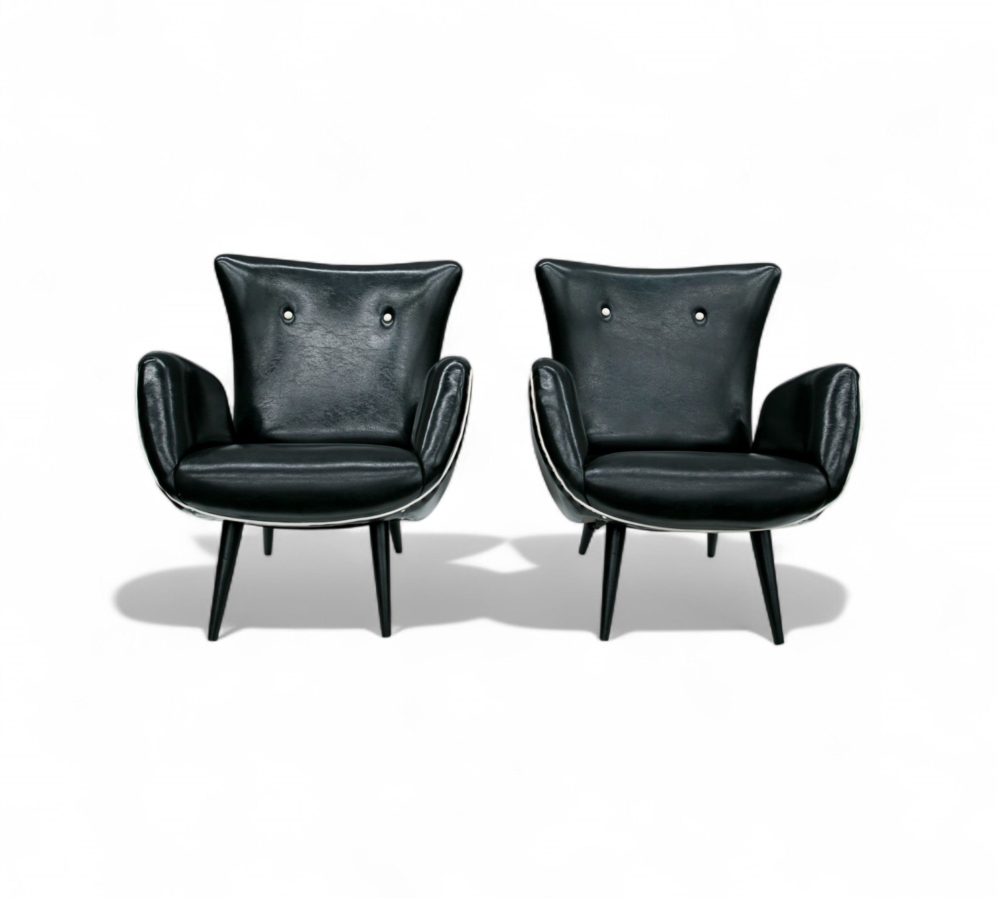 The frame of these chairs is made with hardwood and the body of the chair is made with the original faux leather. The chair has many features of Brazilian modern armchairs as it has a curved seat, slim legs, and an angled backrest. The curved seat and angled backrest allows for maximum comfort. The backrest has two buttons, which adds to the minimalist aesthetic of Brazilian modern.