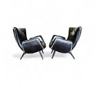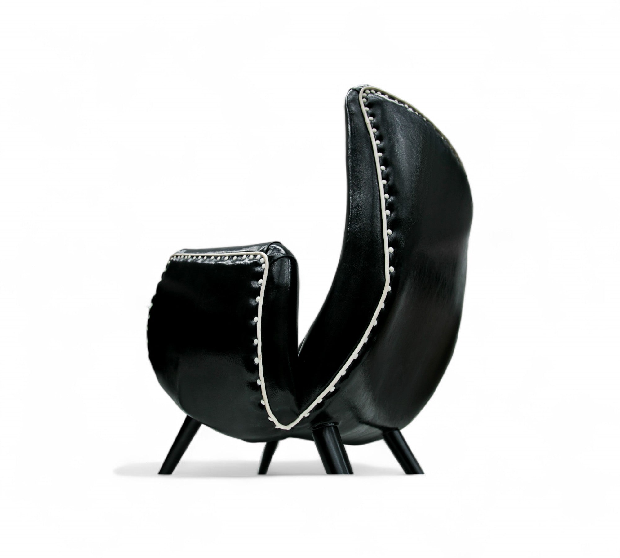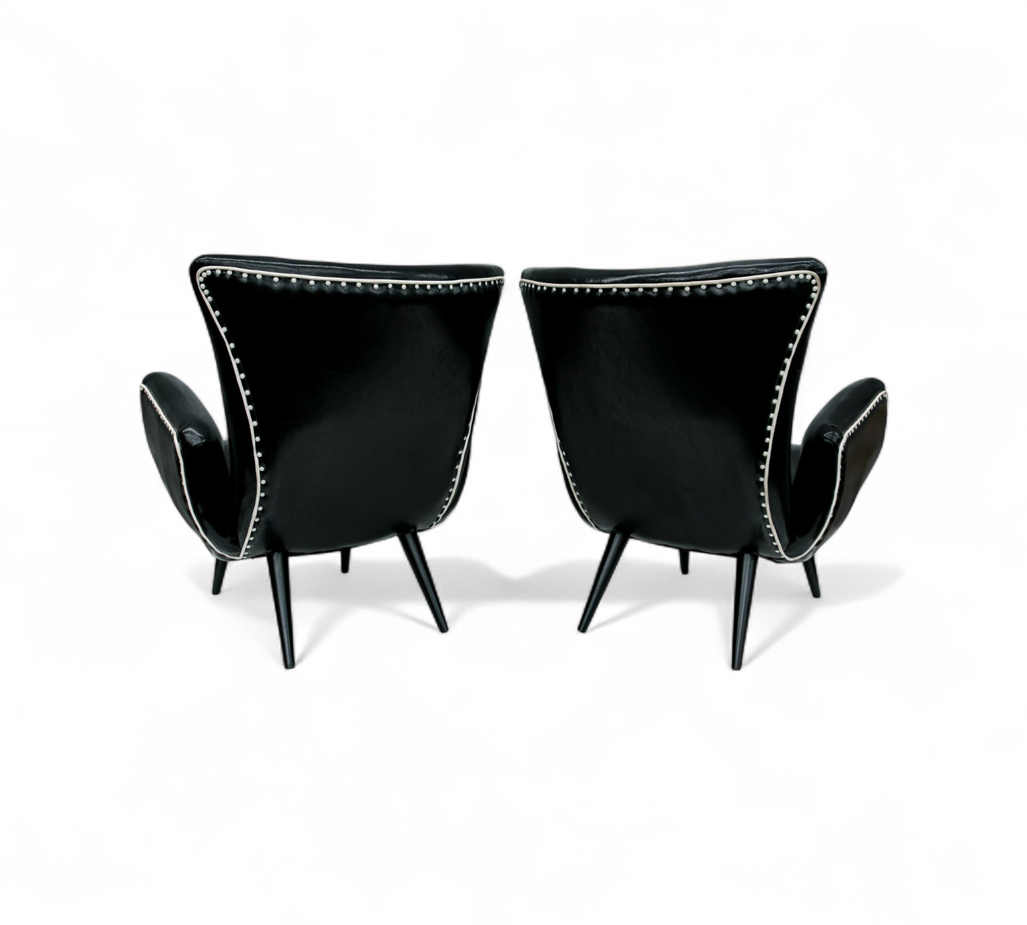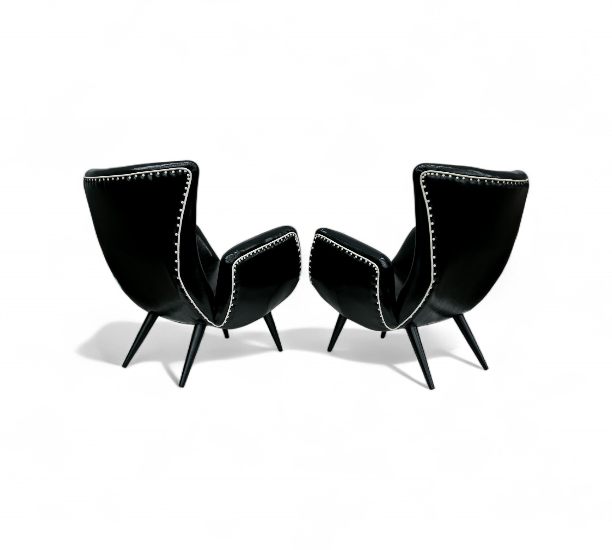 The frame of these chairs is made with hardwood and the body of the chair is made with the original faux leather. The chair has many features of Brazilian modern armchairs as it has a curved seat, slim legs, and an angled backrest. The curved seat and angled backrest allows for maximum comfort. The backrest has two buttons, which adds to the minimalist aesthetic of Brazilian modern.