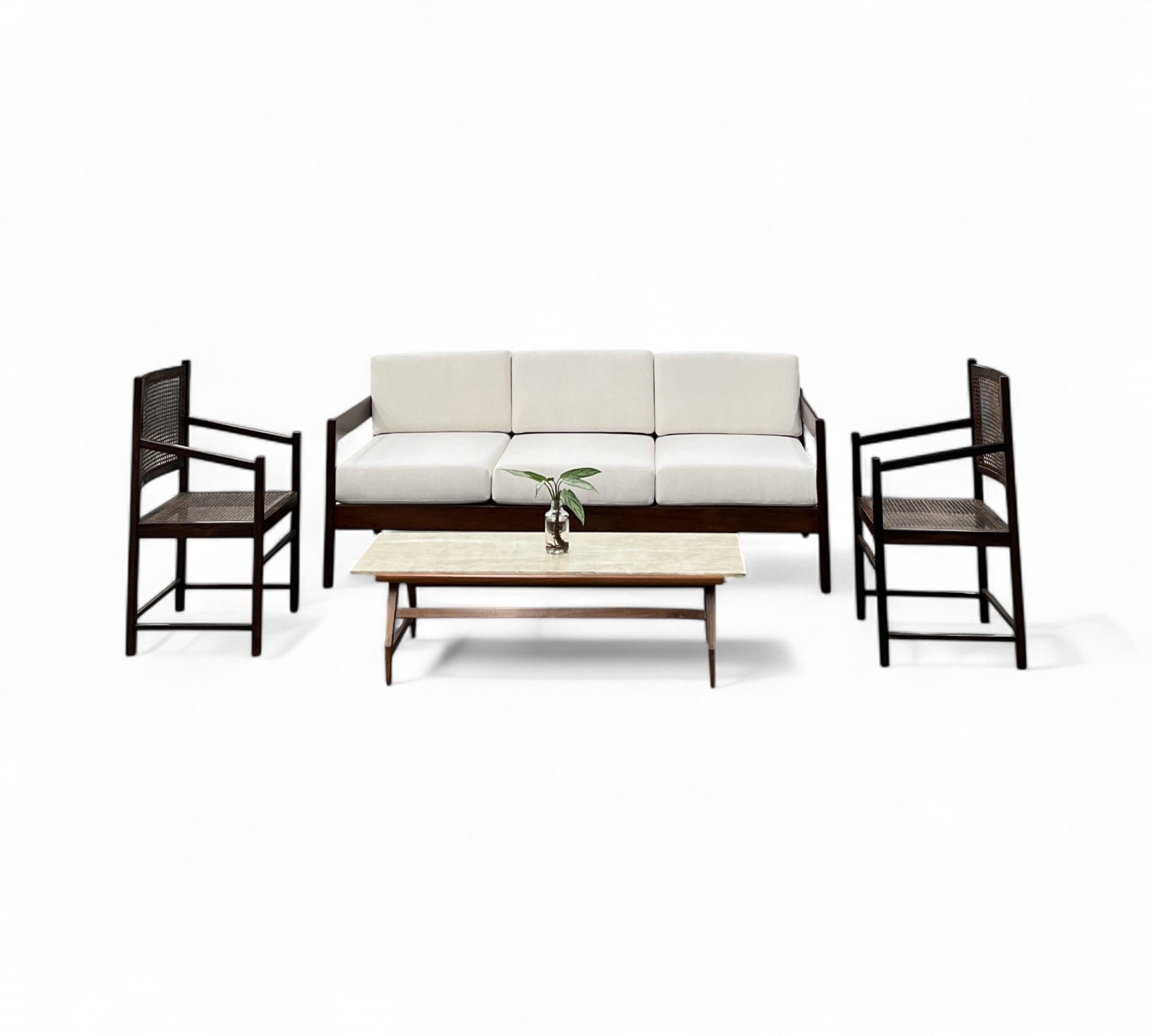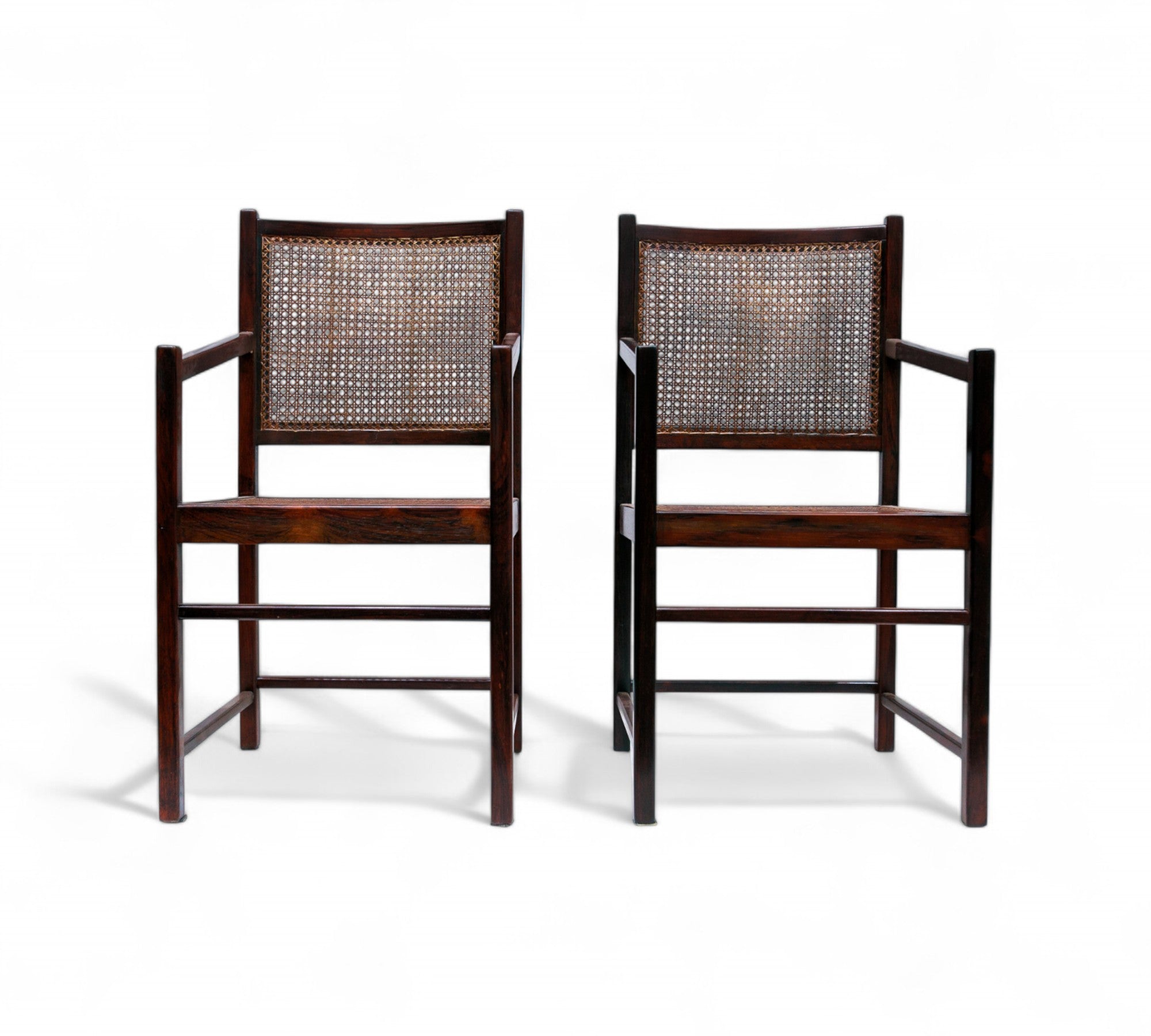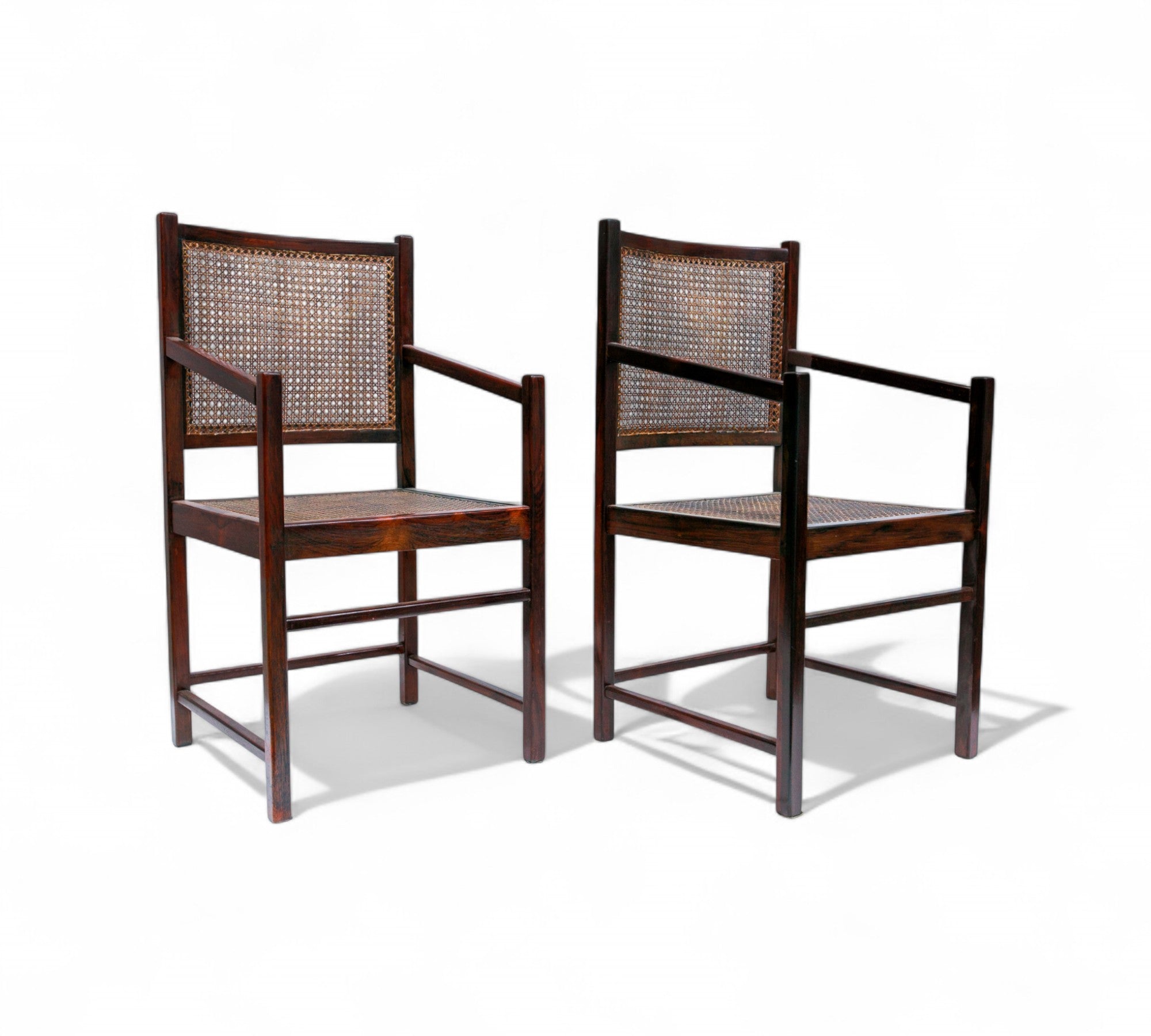 The frame and body of these chairs are crafted from dark brown rosewood, also known as jacaranda, while the backrest and seat feature straw caning. These chairs exemplify Brazilian modern furniture with their use of luxurious Brazilian rosewood, sleek design, and slim legs. They would make an excellent addition to a dining table and are versatile enough to complement any type of environment. The wood of these chairs has been refinished to restore its original beauty and is now in excellent condition, ensuring both aesthetic appeal and durability.