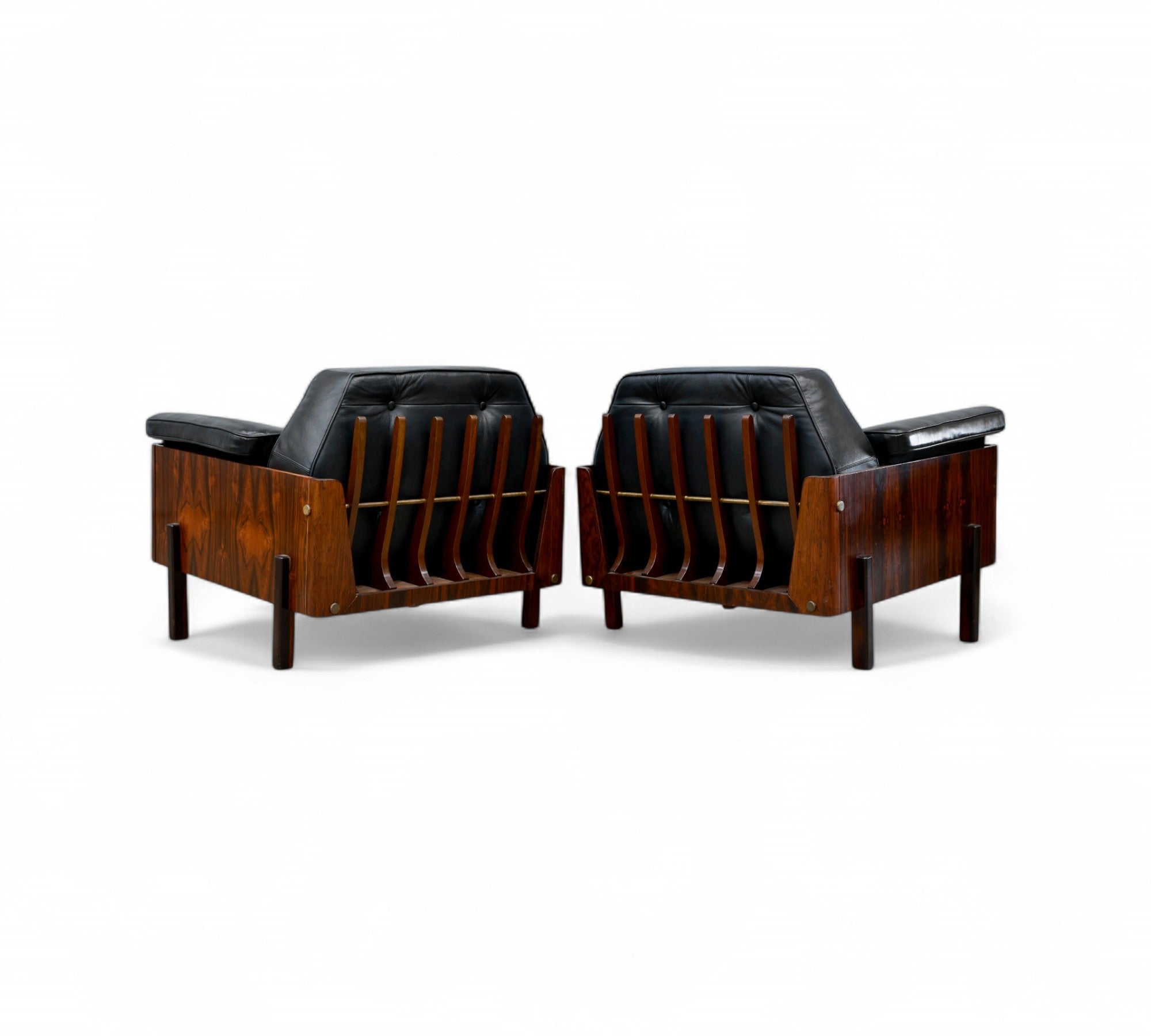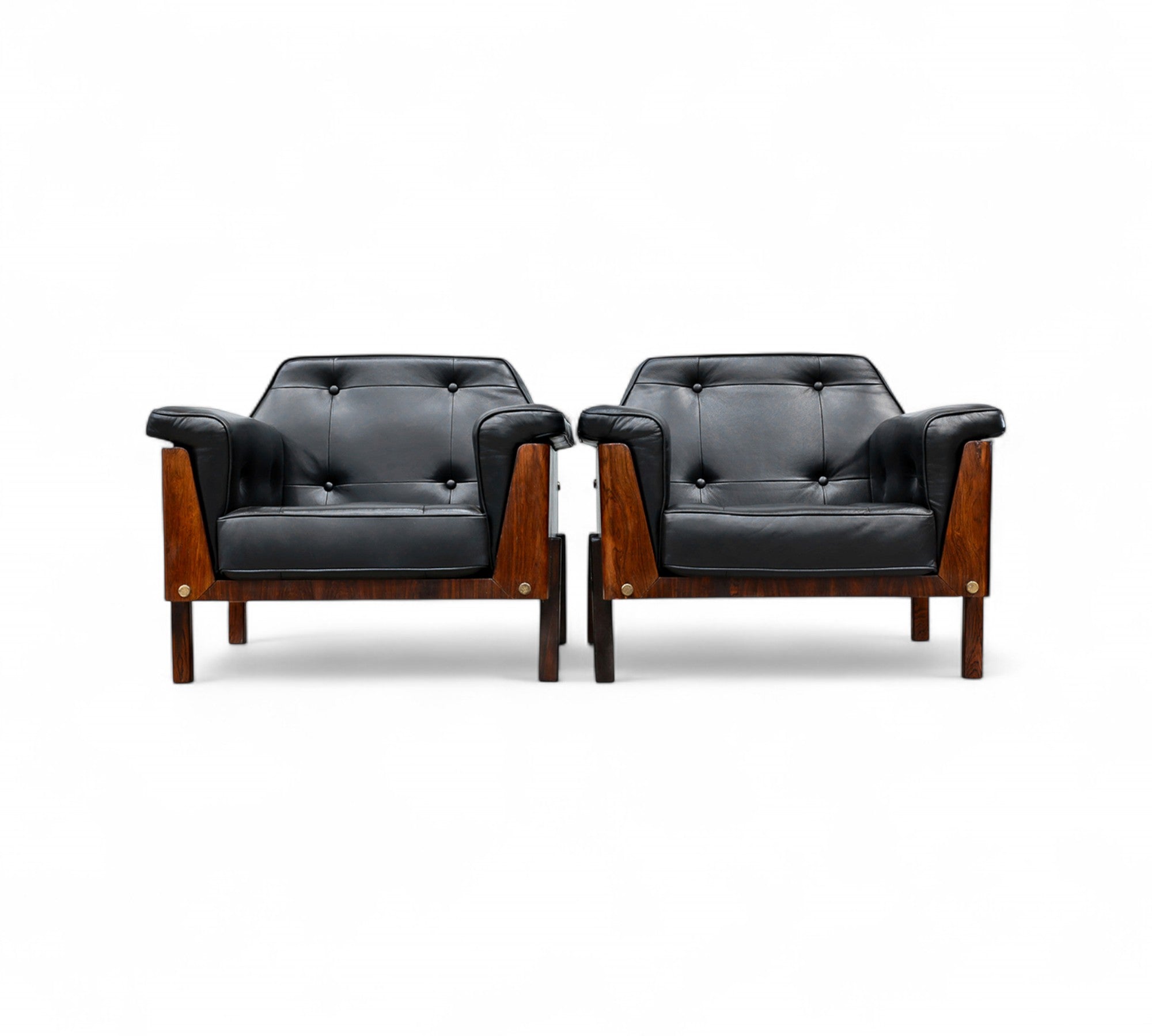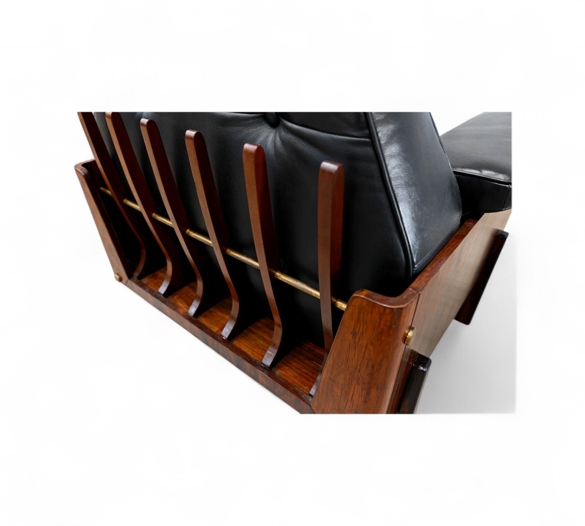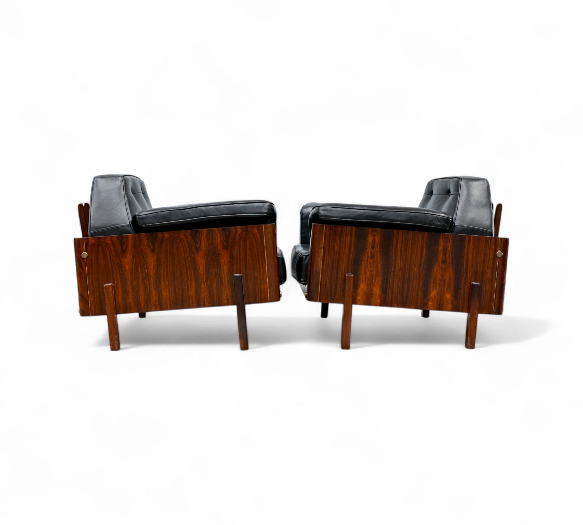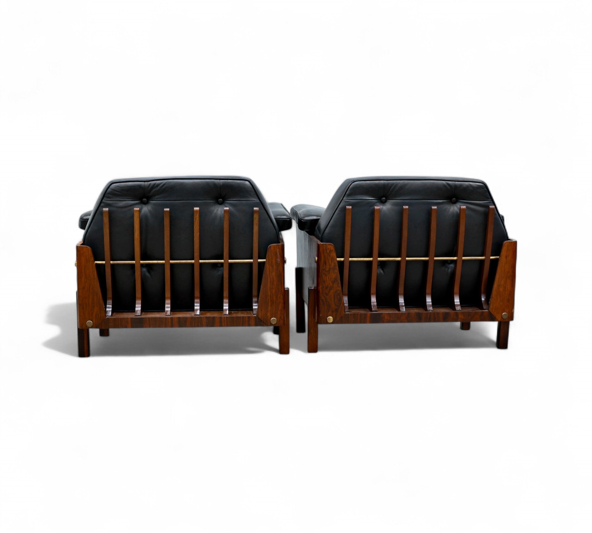 These unique looking armchairs feature a square base made in Brazilian rosewood (Jacaranda). They have been upholstered in black leather and the back seat has been tufted with four buttons. The structure of the backseat has an incredible design consisting of six vertical slabs connected by a brass rod.