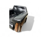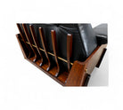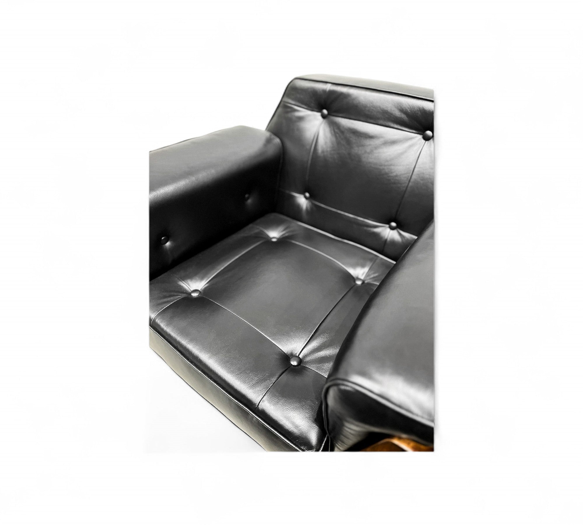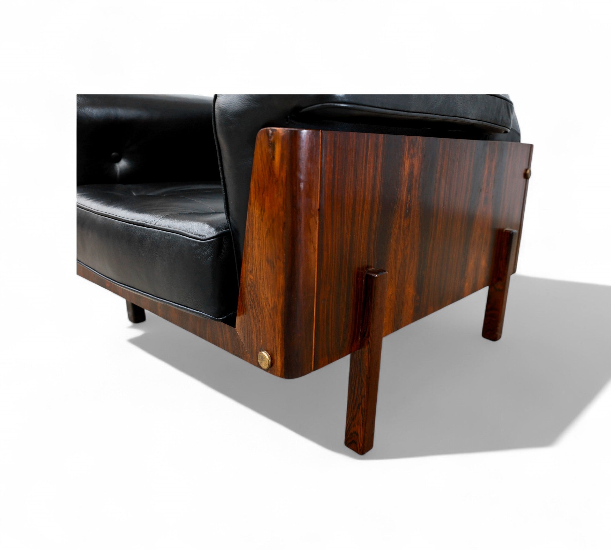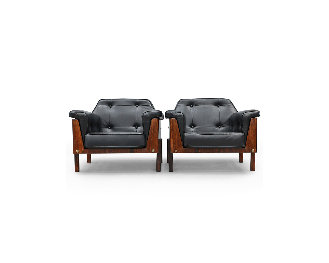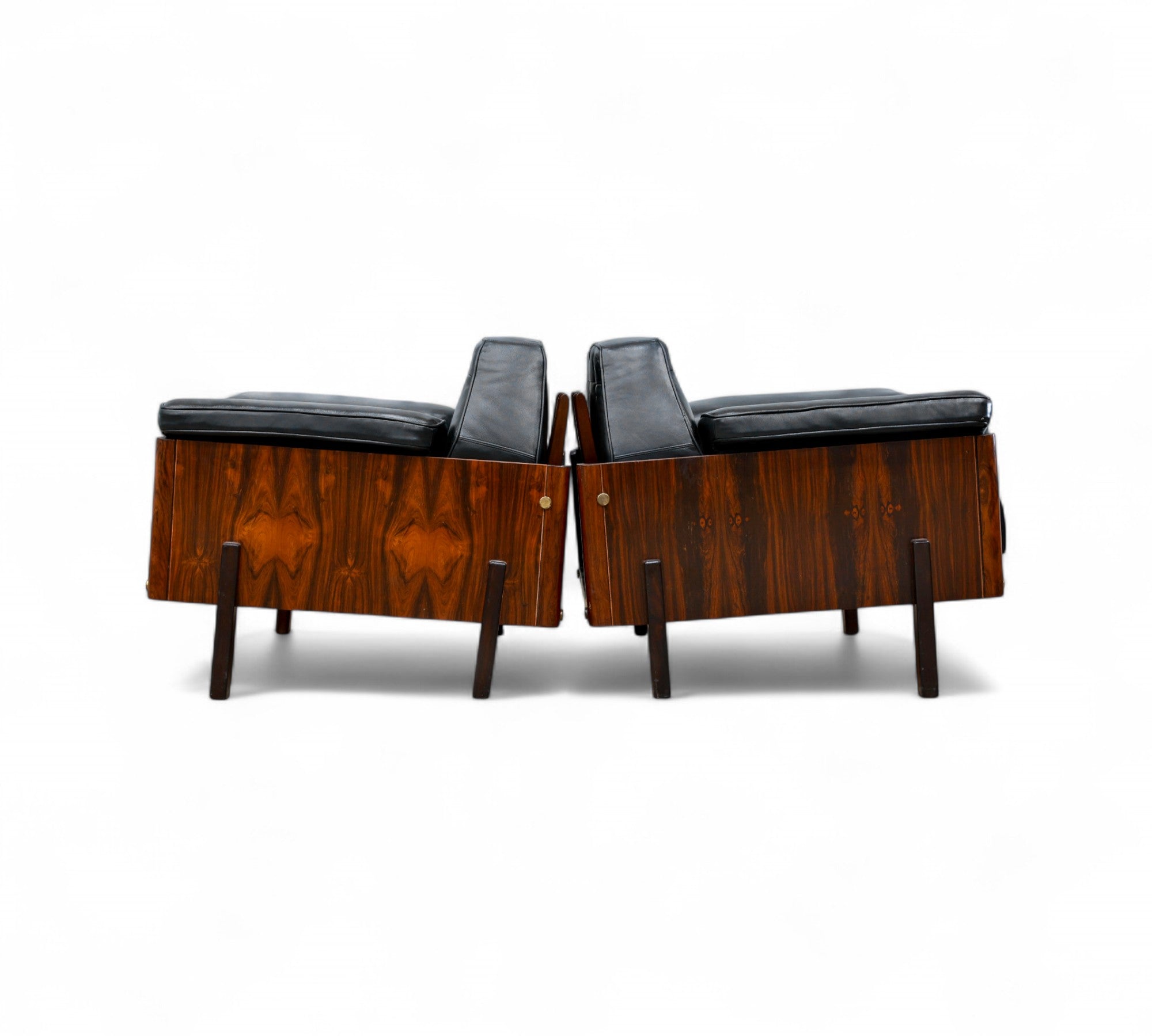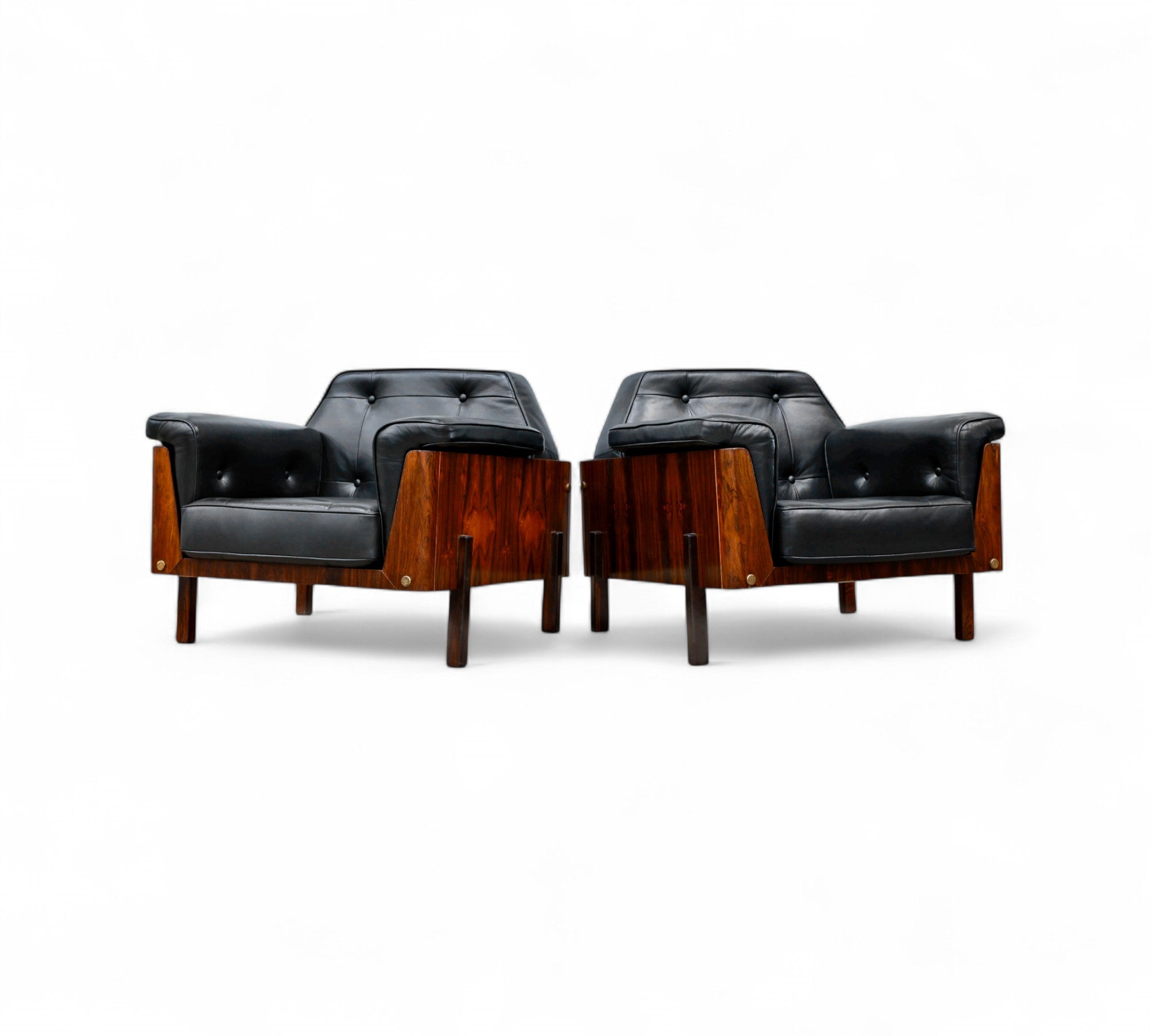 These unique looking armchairs feature a square base made in Brazilian rosewood (Jacaranda). They have been upholstered in black leather and the back seat has been tufted with four buttons. The structure of the backseat has an incredible design consisting of six vertical slabs connected by a brass rod.