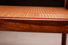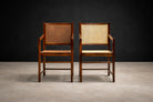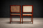 One chair retains its original caning, while the other has been re-caned, an honest restoration that preserves the usability and visual continuity of the pair. The wood has been professionally refinished, bringing forward the natural figure of the rosewood while maintaining the material integrity of the frames. Minor age evidence remains visible in the grain, consistent with vintage works of this period.