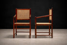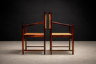 Attributed to an unknown Brazilian maker and dating to the 1960s, this pair of armchairs reflects the disciplined clarity that defines much of the period’s seating design. Their architecture is direct and legible: a rectilinear rosewood frame, hand-caned seat and back panels, and slender arm supports that give the chairs a restrained but purposeful presence. The composition is defined by proportion rather than ornament, allowing the interplay of structure, void, and woven surface to carry the design.