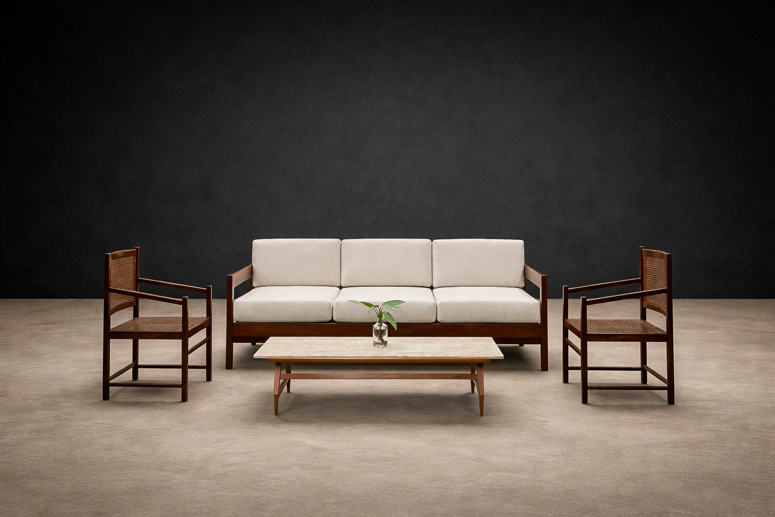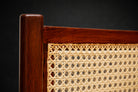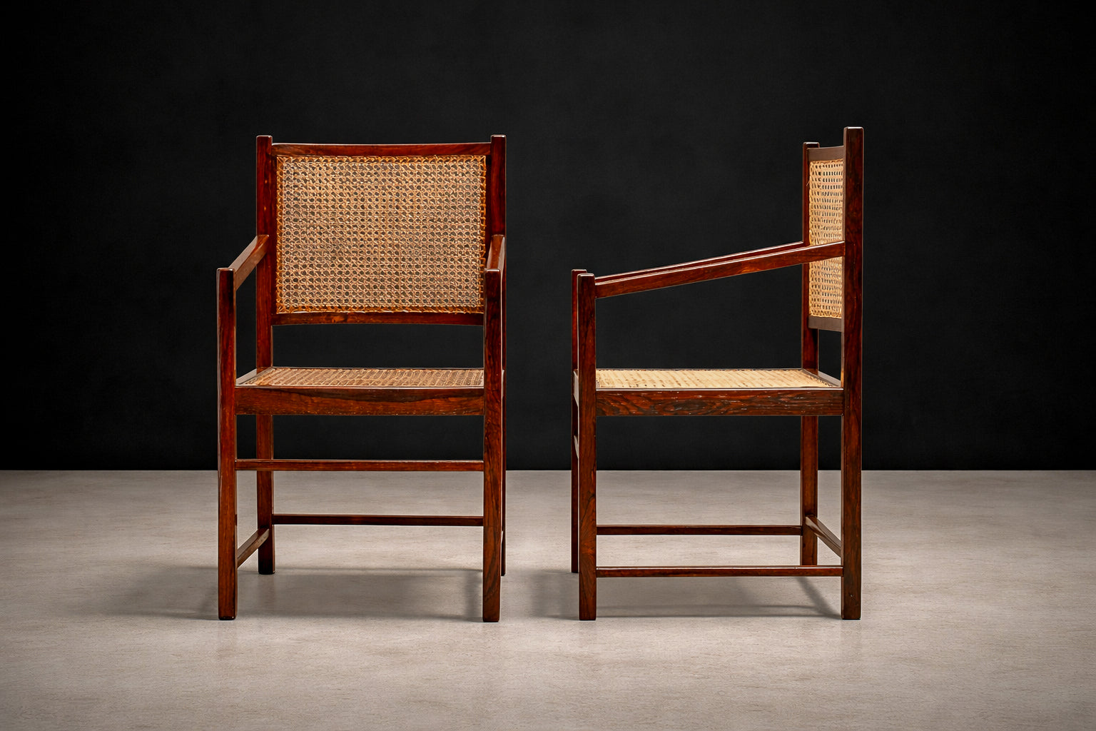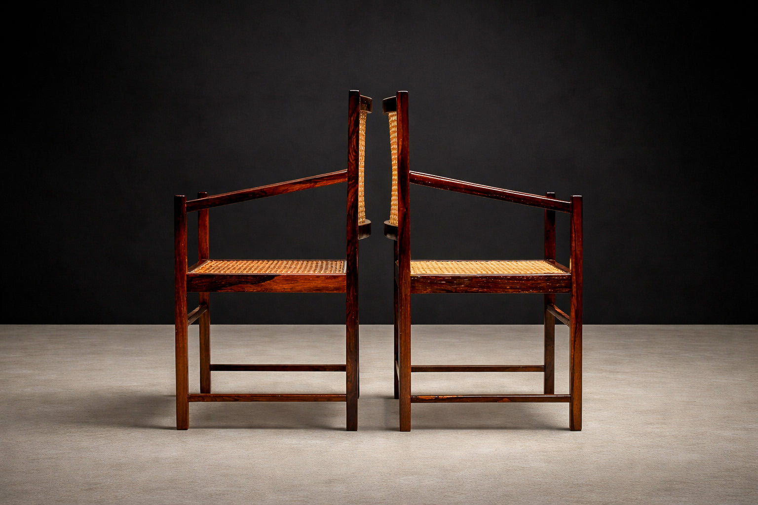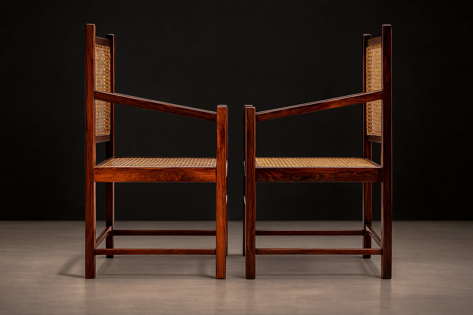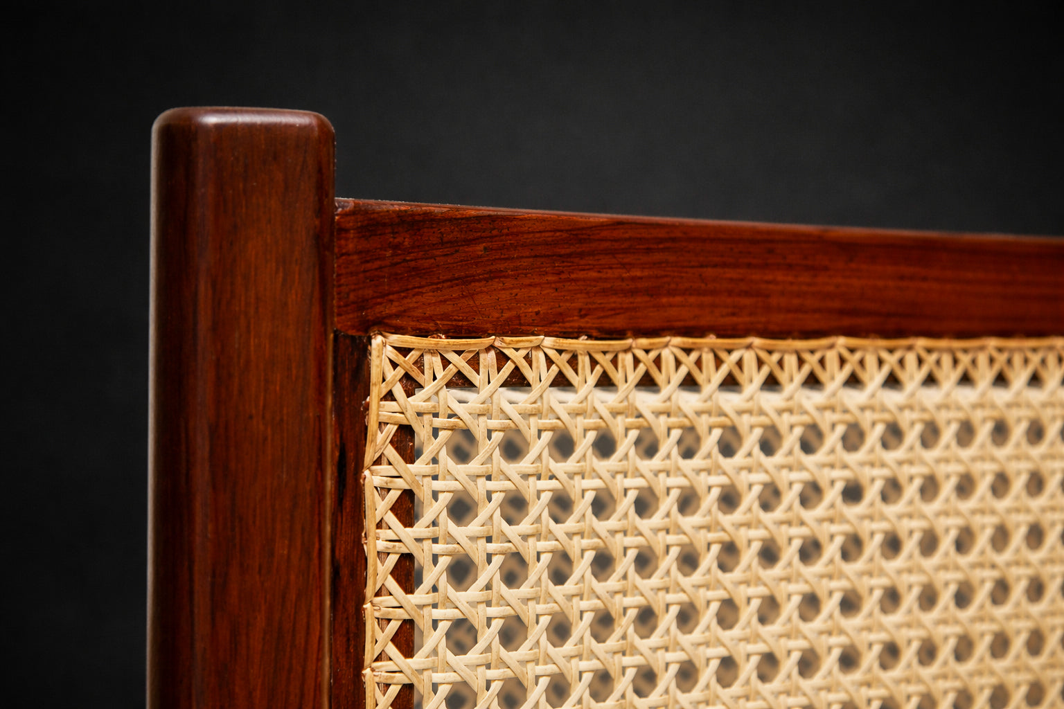 The frames are crafted in jacaranda, or Brazilian rosewood, whose rich tonal variation and expressive grain lend warmth and depth to an otherwise rigorously pared-down form. The caned panels introduce a contrasting material lightness, both visual and tactile, softening the geometry while reinforcing the chairs’ breathable, utilitarian character. As with many well-resolved Brazilian modern designs, comfort is integrated into the structure itself: the generous back panel, open sides, and measured pitch of the arms create an ease that is absorbed into the overall composition rather than treated as a separate feature.