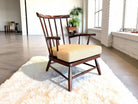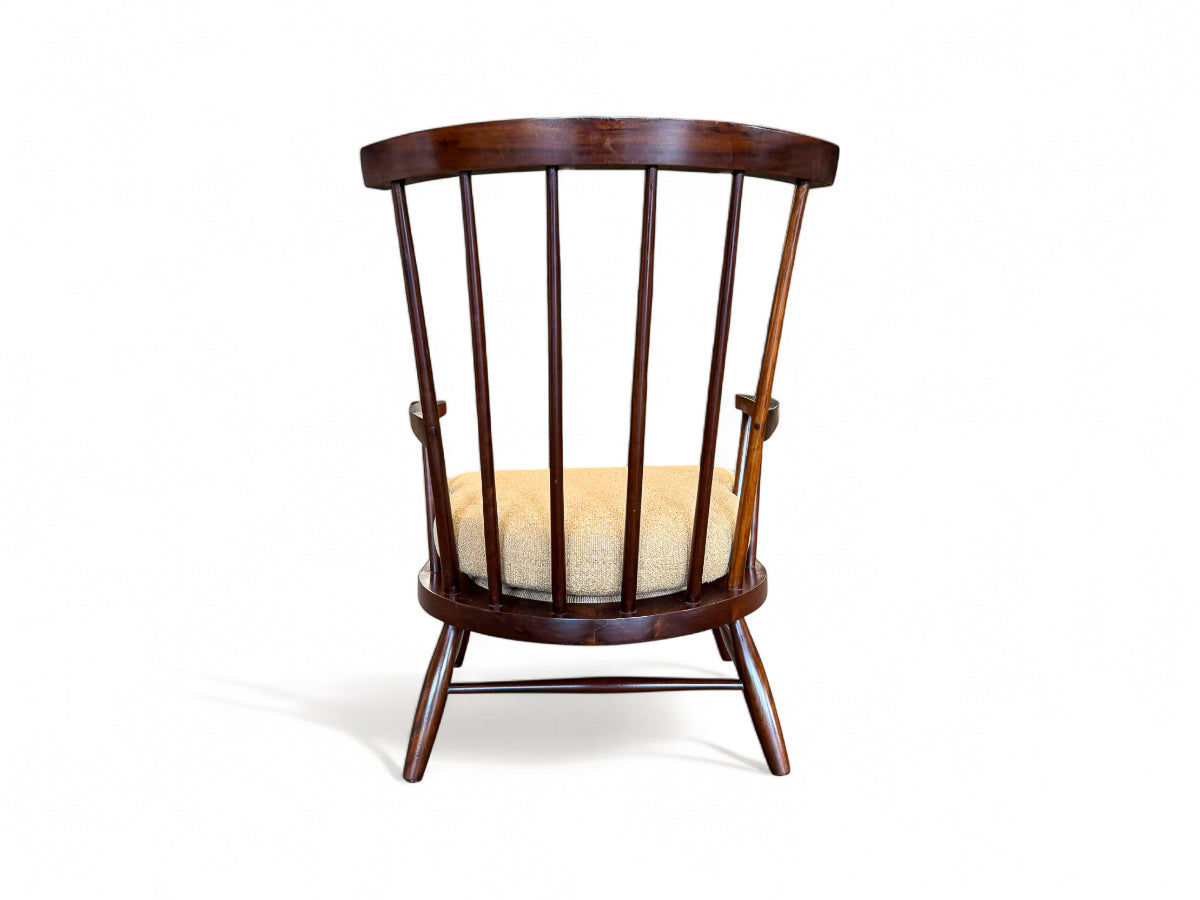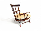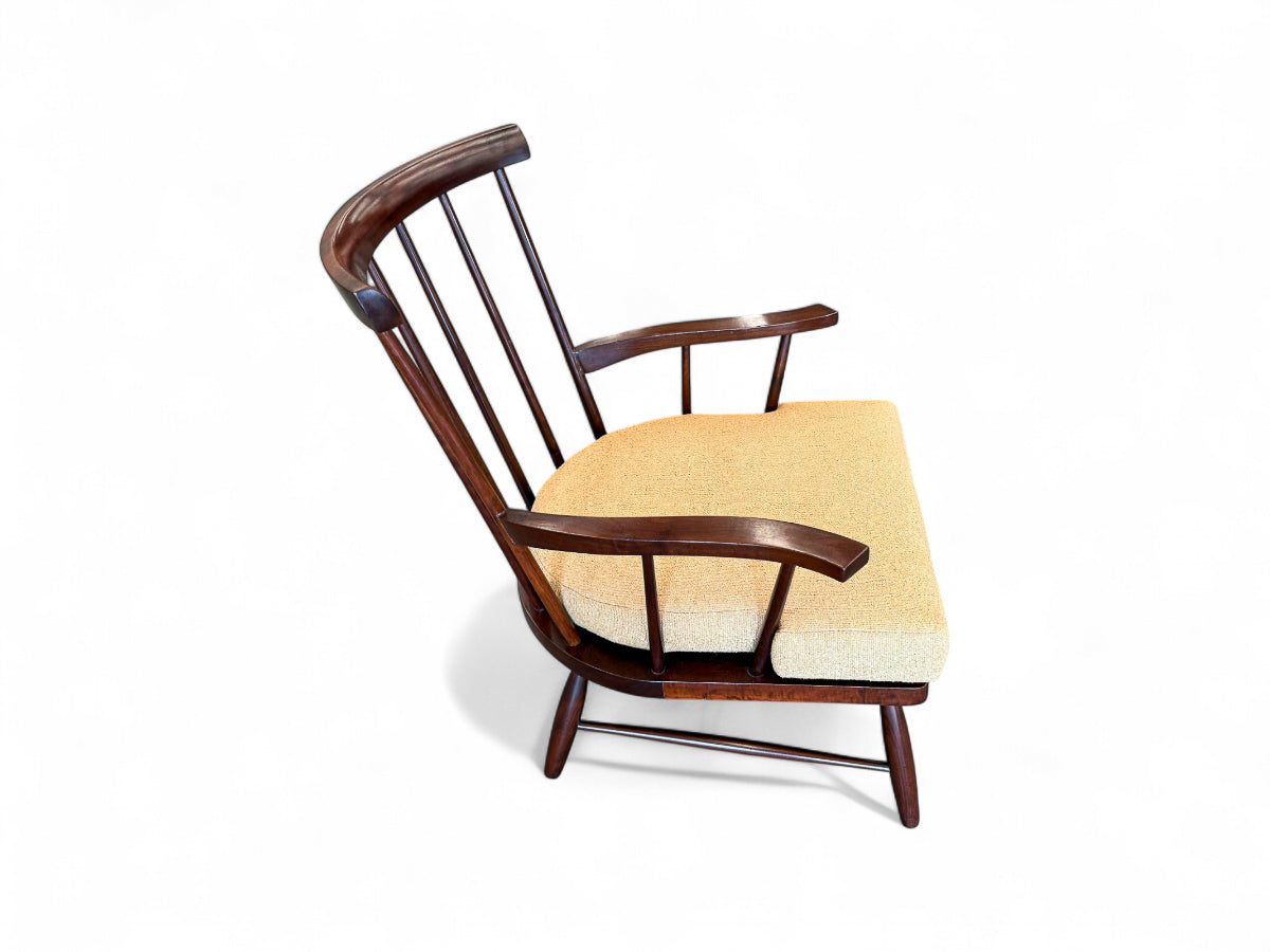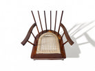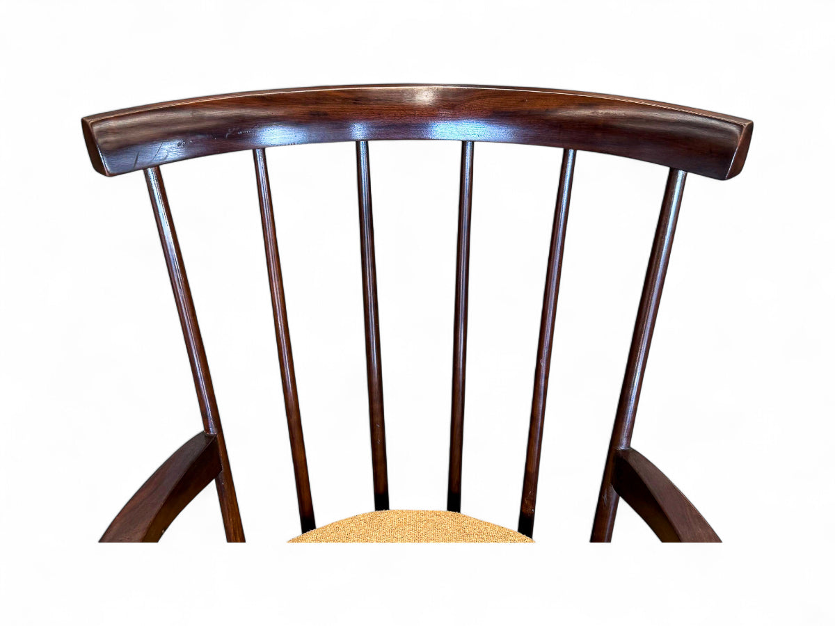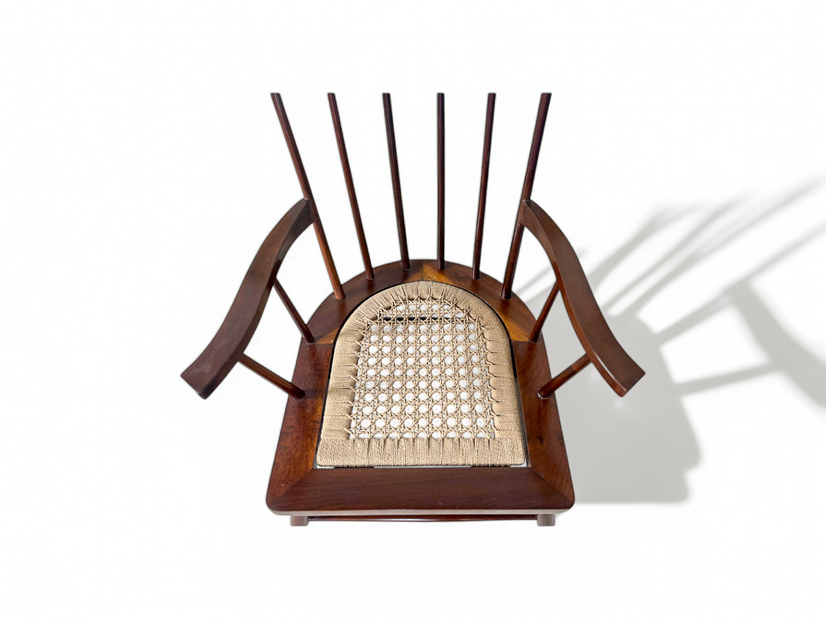 This stunning chair is crafted from solid Imbuia hardwood and showcases a seat made of braided rope and a super comfortable upholstered cushion . It features a gracefully curved backrest constructed from wooden rods and elegant legs. The piece retains its manufacturing seal.