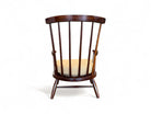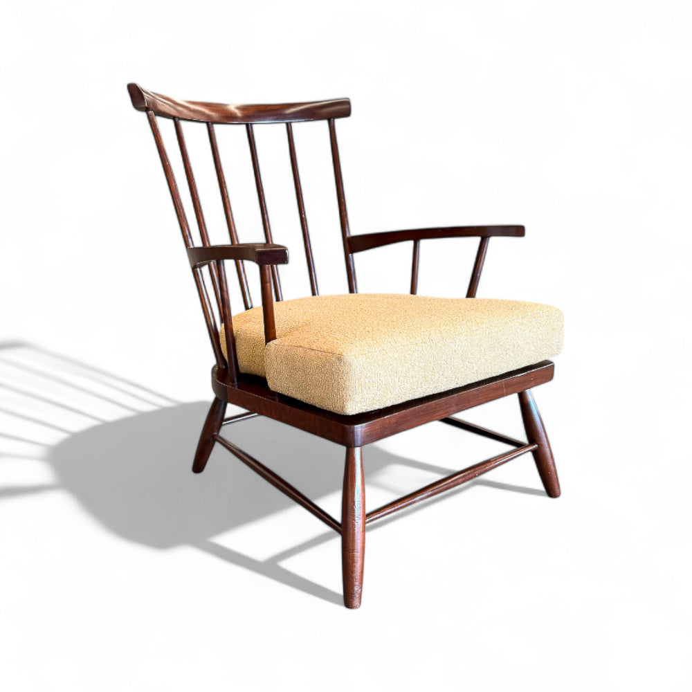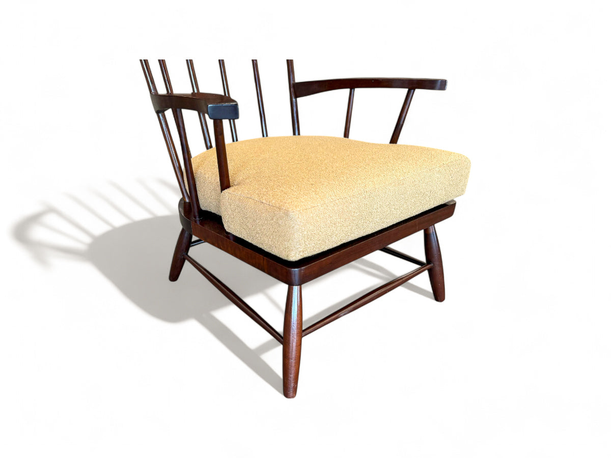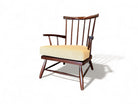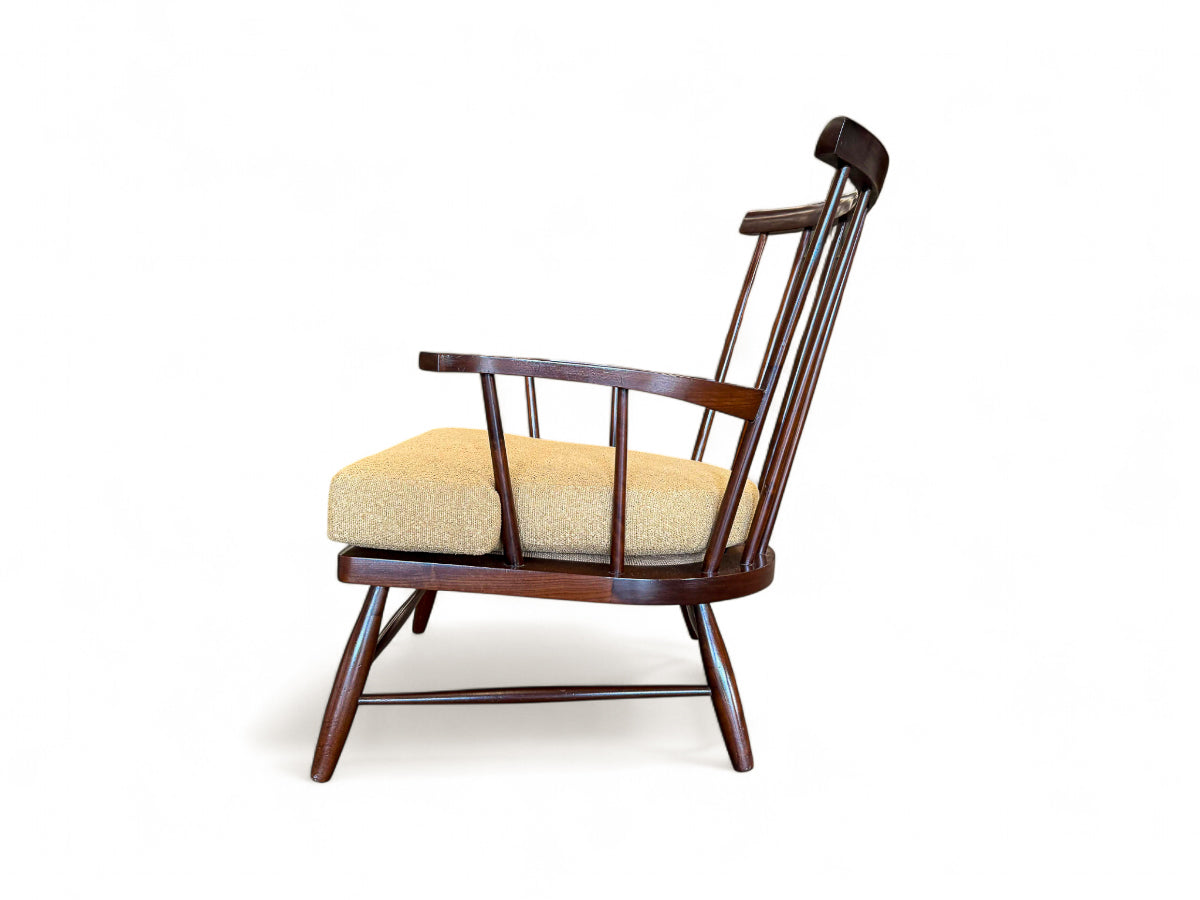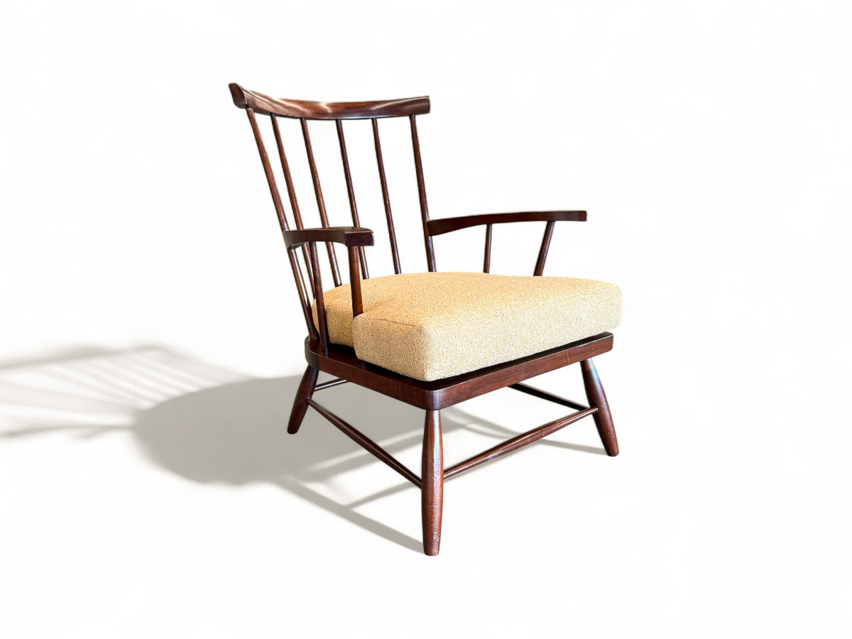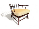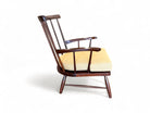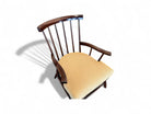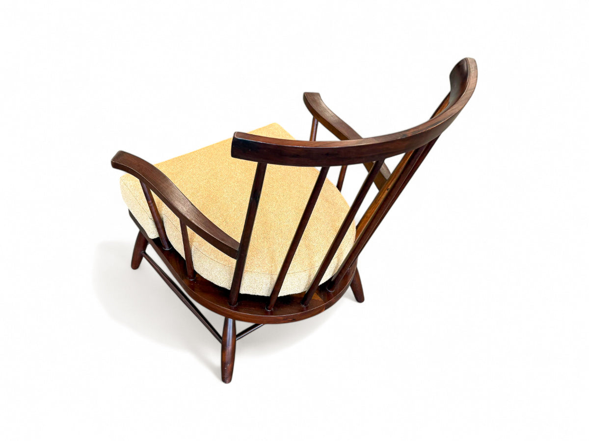 This stunning chair is crafted from solid Imbuia hardwood and showcases a seat made of braided rope and a super comfortable upholstered cushion . It features a gracefully curved backrest constructed from wooden rods and elegant legs. The piece retains its manufacturing seal.