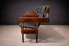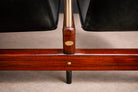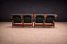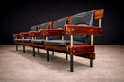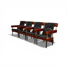 Each seat and backrest is upholstered in black leather, newly refinished and presenting in excellent condition. The upholstery is tensioned within the frame and incorporates an integrated reclining mechanism that allows the backrest to respond to the body without shifting the base structure. This engineering solution maintains the integrity of the fixed system while enhancing ergonomic comfort—an essential consideration in auditorium design.