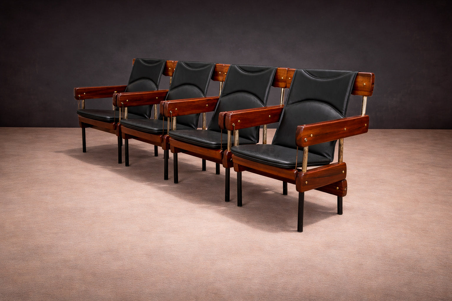 The structure is composed of Brazilian rosewood (jacarandá) and iron. Broad horizontal wood members define the armrests and upper back supports, their warm tone contrasting with the black metal legs and vertical supports. Exposed brass fasteners punctuate the wooden elements, underscoring the logic of assembly rather than concealing it. The rhythm created by wood, metal, and hardware distills a distinctly Brazilian interpretation of modernist seating—robust yet materially refined.
