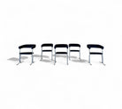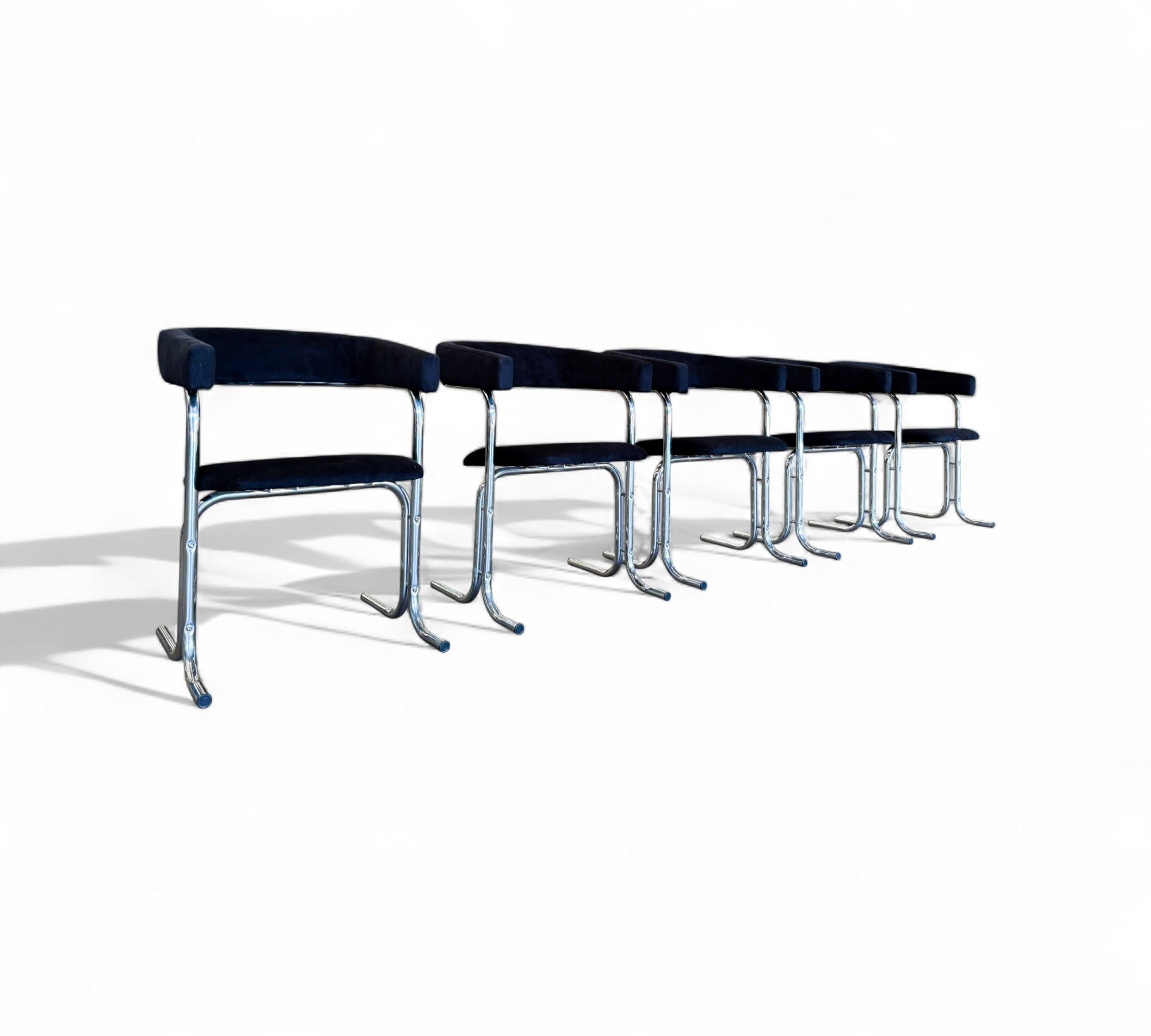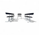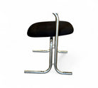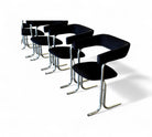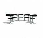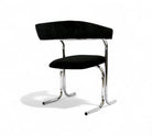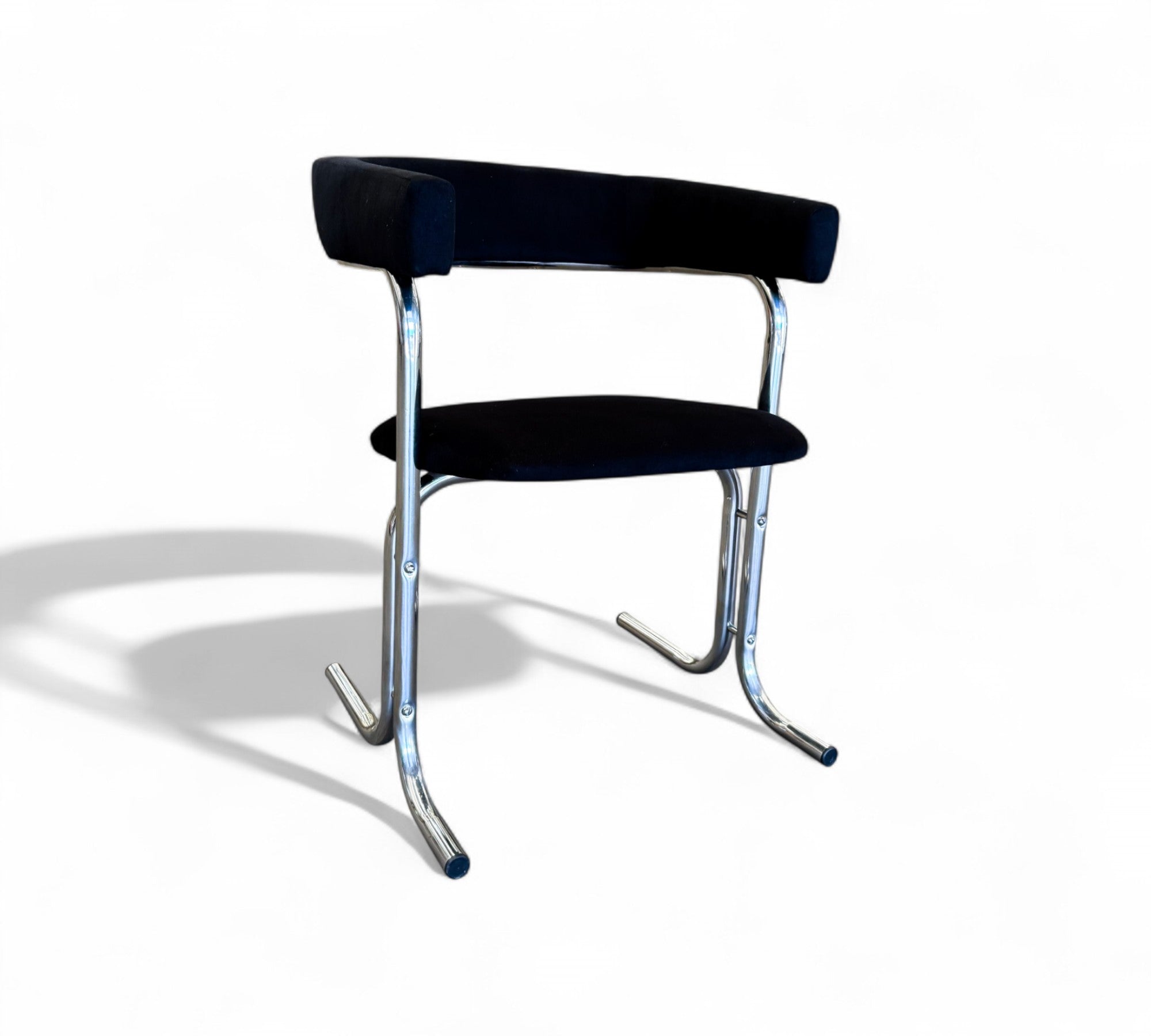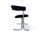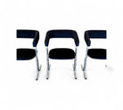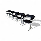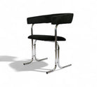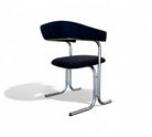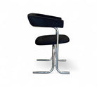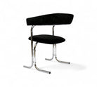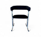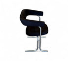 These armchairs feature a chrome frame and seats upholstered in black fabric. Their unique shape gives them a distinctive and modern appearance, with a backrest in the form of a "U" and sleek, thin-profile legs. These chairs are in excellent condition and are truly beautiful.