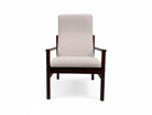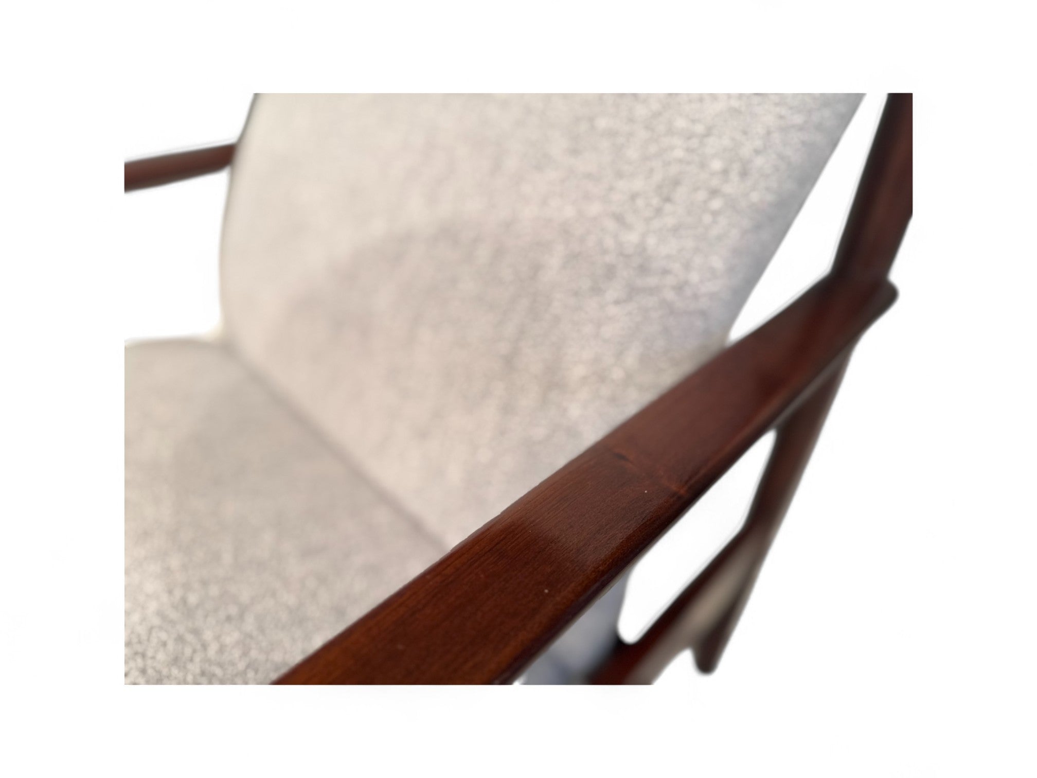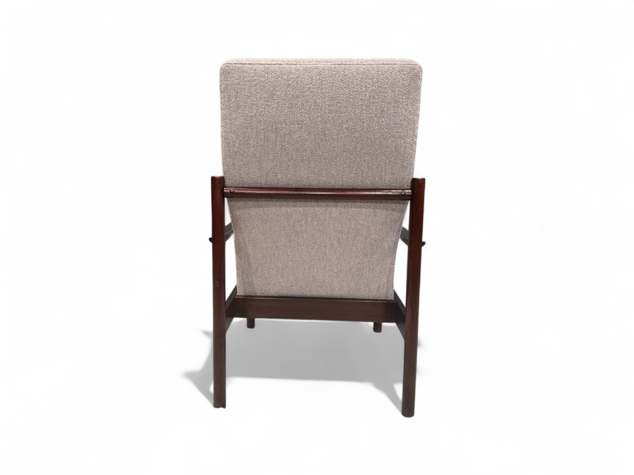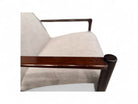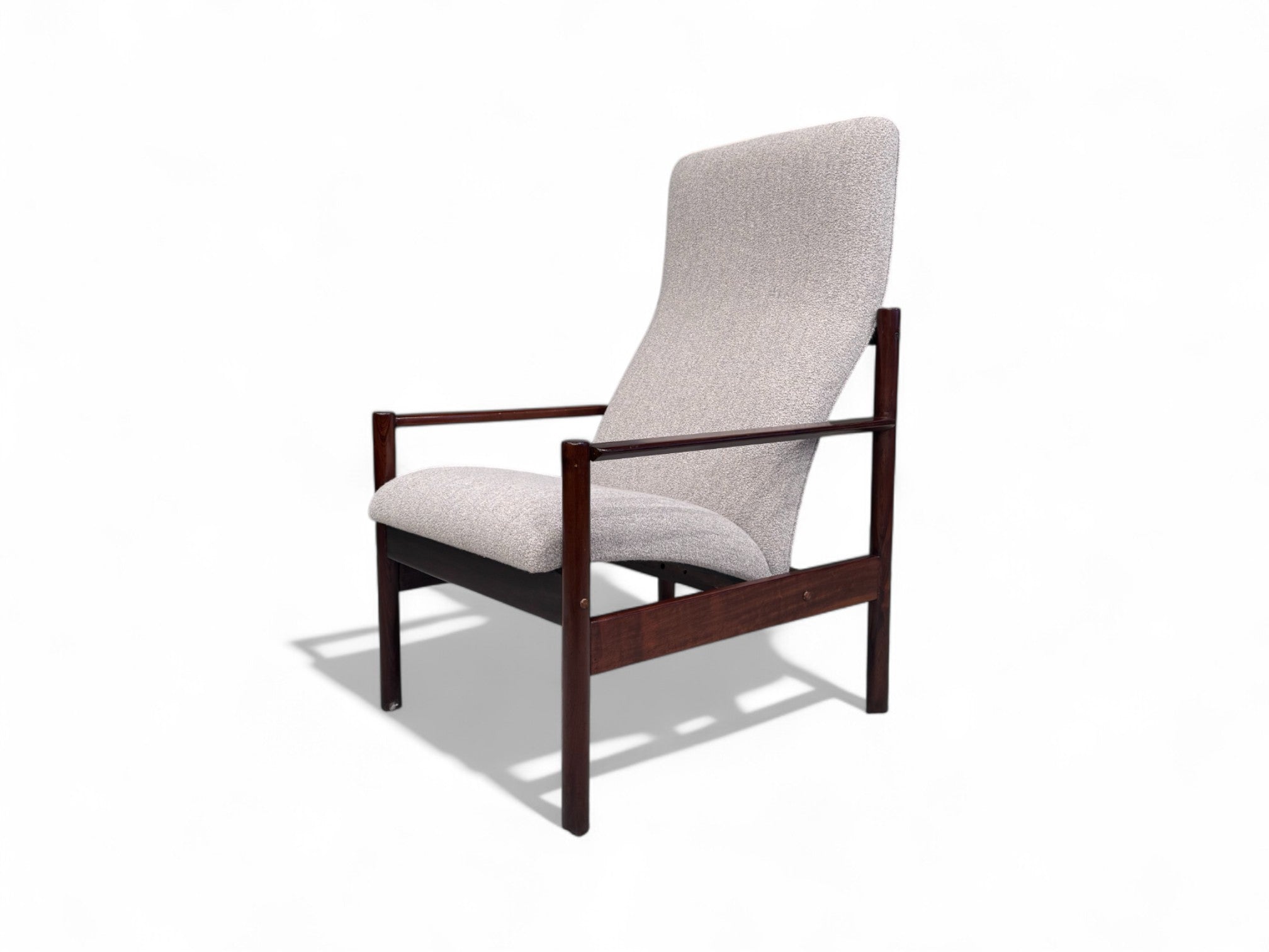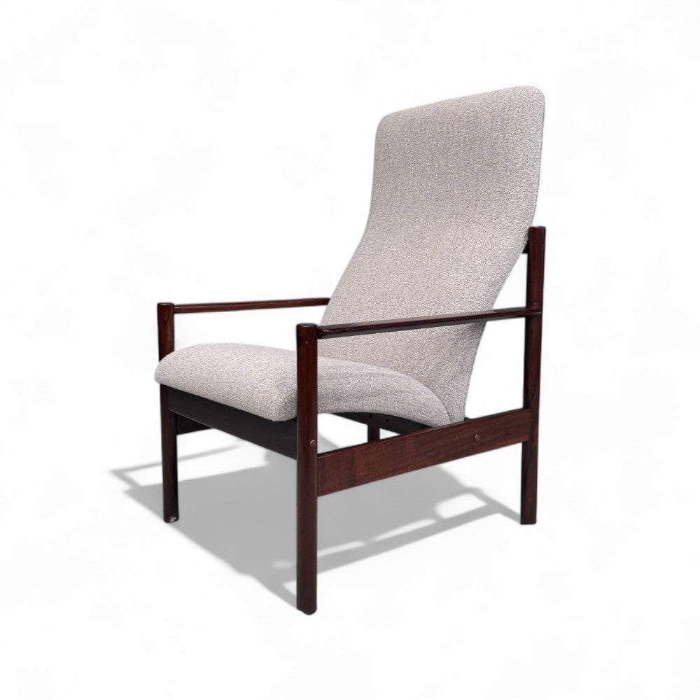This sculptural, sleek armchair is made from Imbuia wood and reupholstered with a super soft, cushiony grey boucle fabric. Designed by Michael Arnault for his company Mobilia Contemporanea in the 1960s, it is surprisingly comfortable despite its stylish structure.