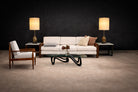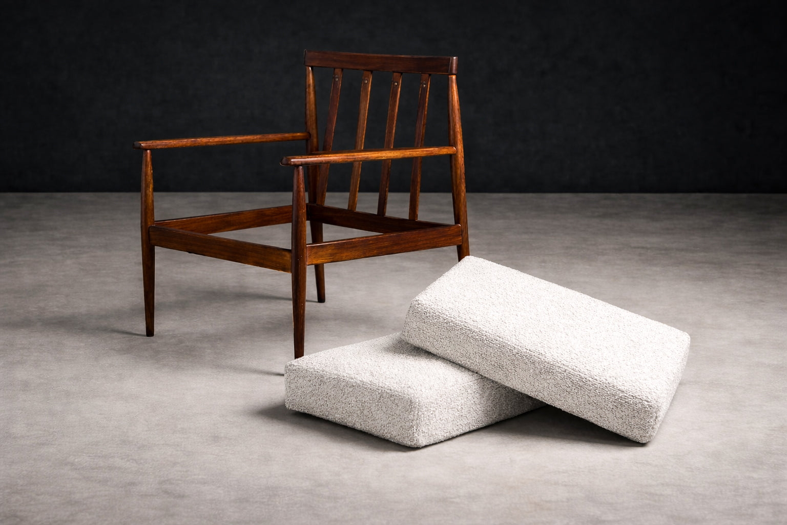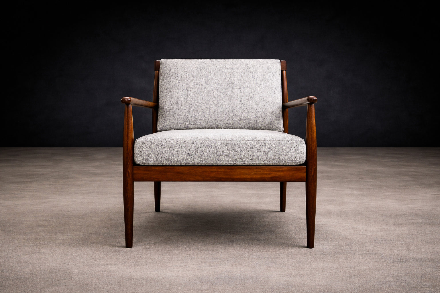 Newly upholstered in a soft, textured light gray bouclé, the loose seat and back cushions introduce a contemporary tactility while remaining respectful of the original silhouette. Generous in scale and exceptionally comfortable, the cushions enhance the architectural clarity of the frame rather than overpower it.